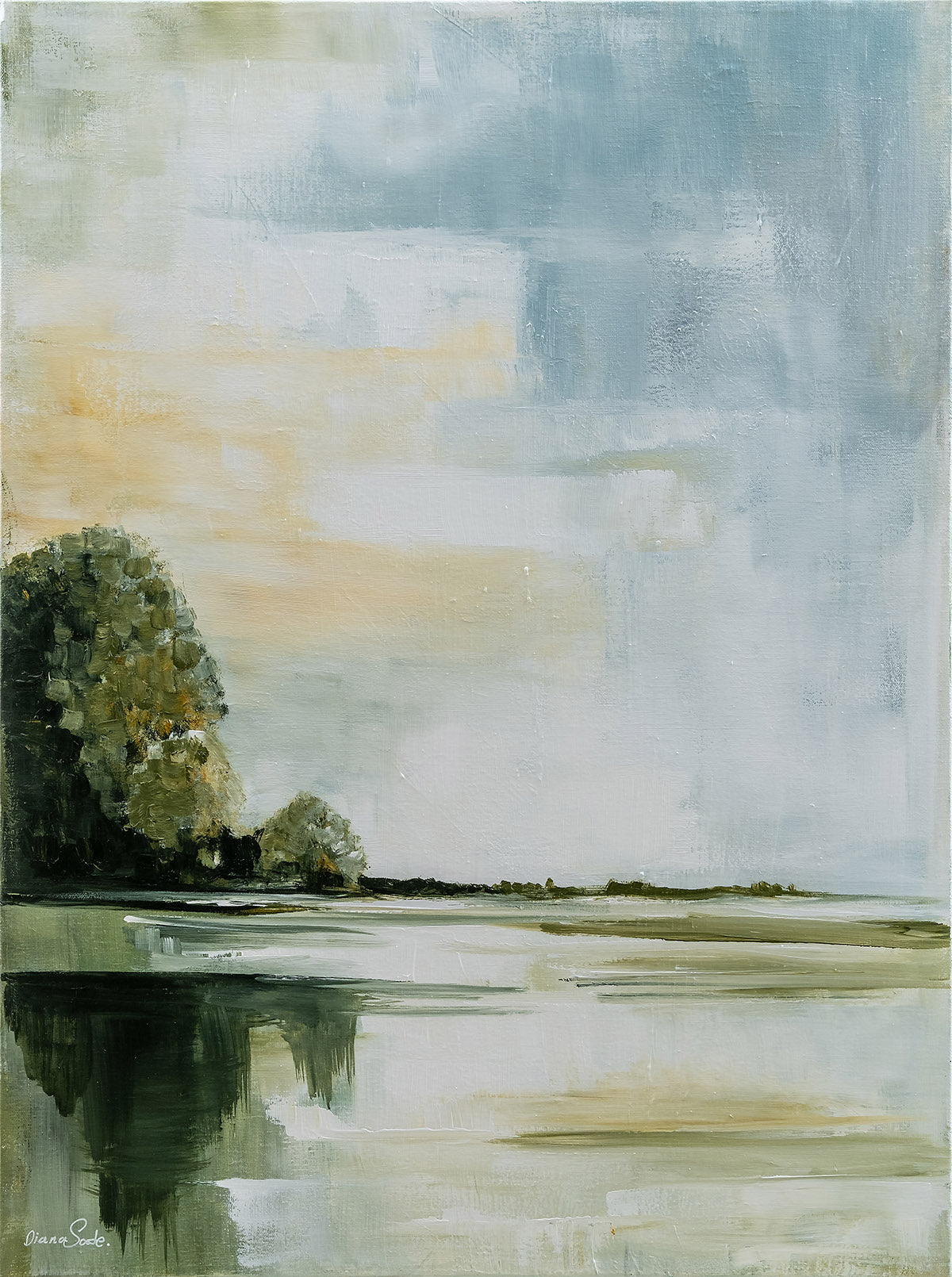 A peaceful landscape in soft shades of green, blue, and gold, radiating calm and natural harmony.