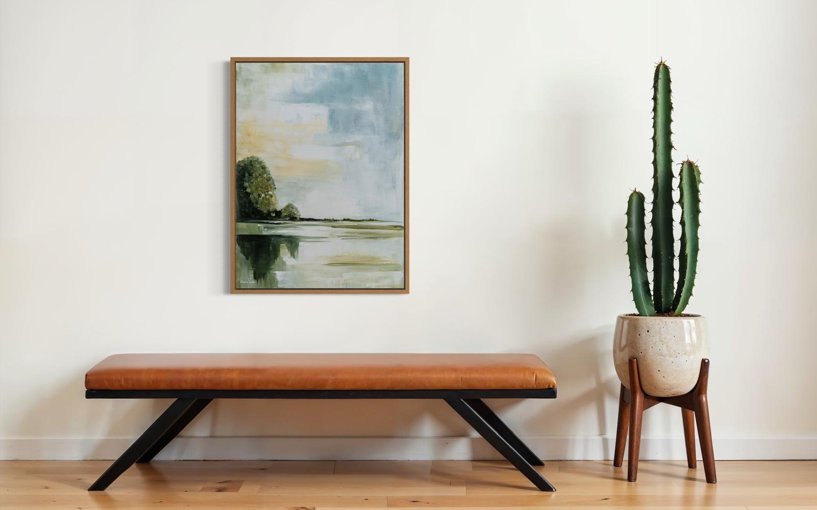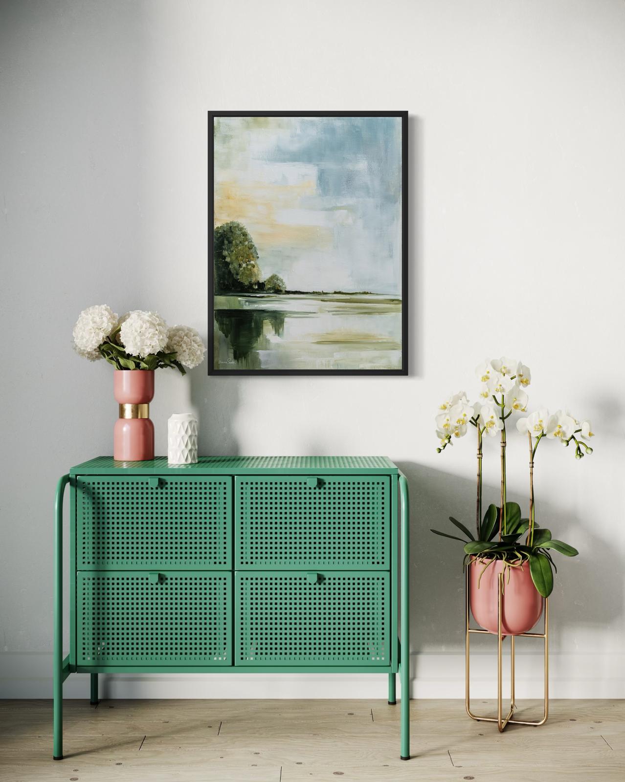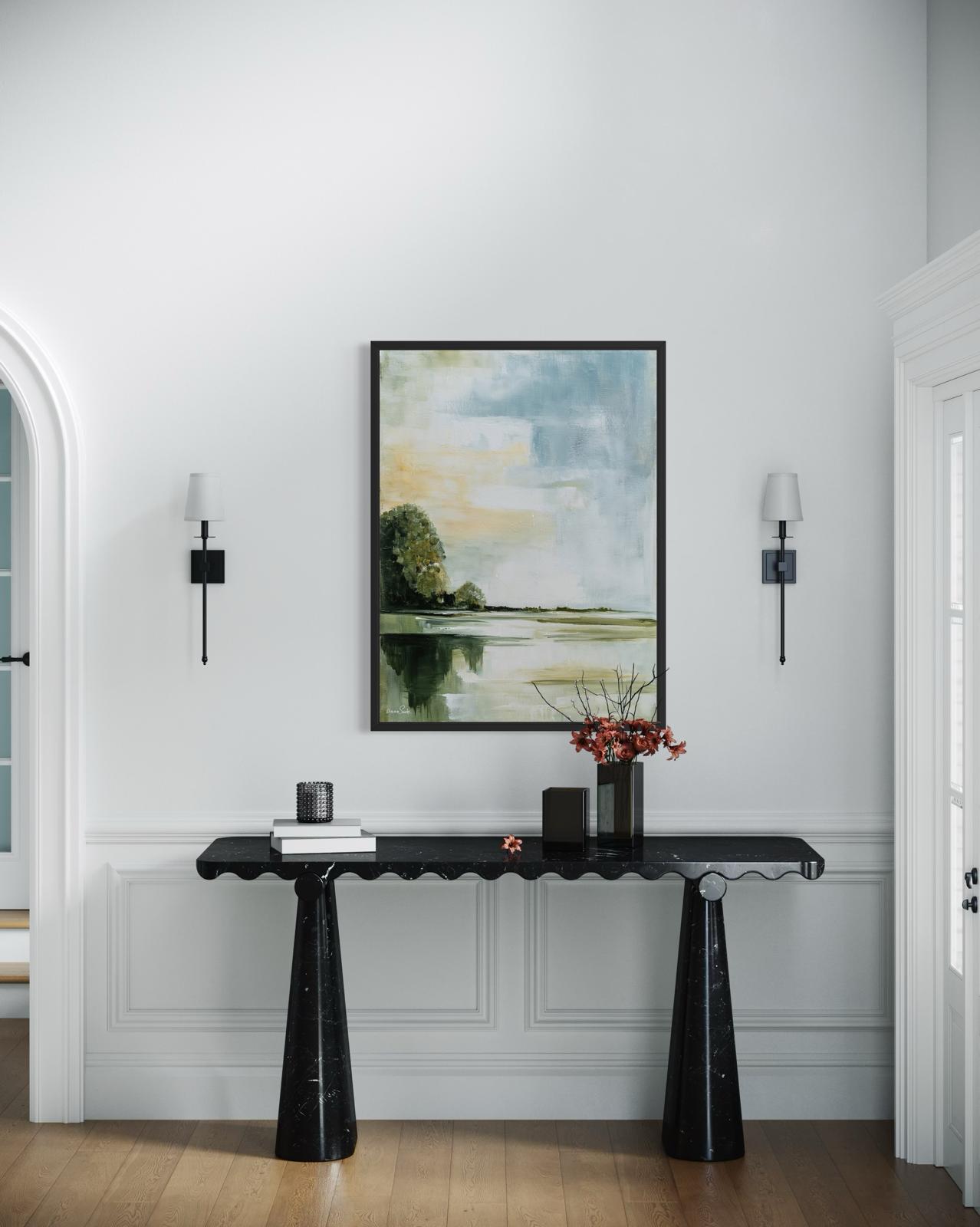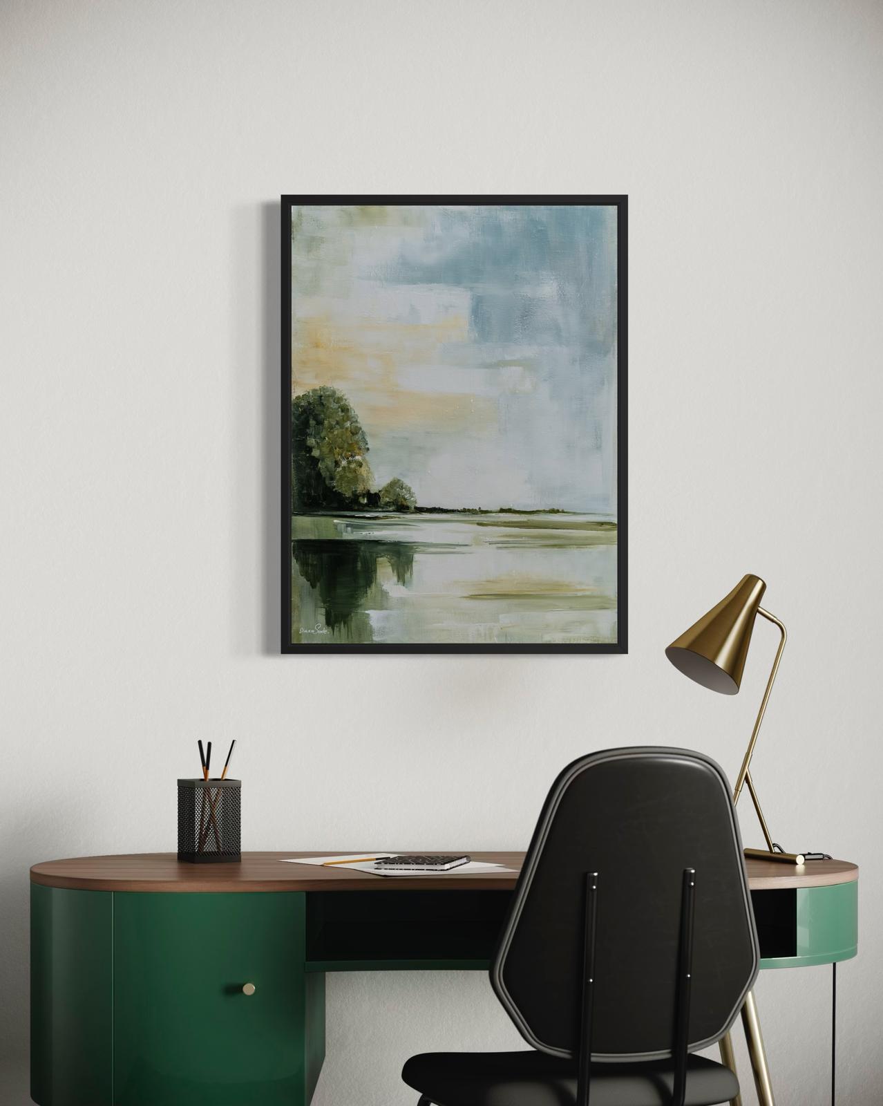For a living room, a warm and deep painting may be most fitting; for a bedroom, something calm and serene; and for an office, a piece that inspires or brings quiet reflection.