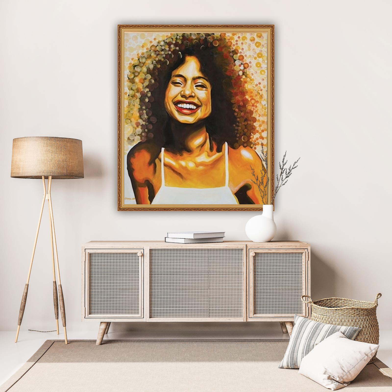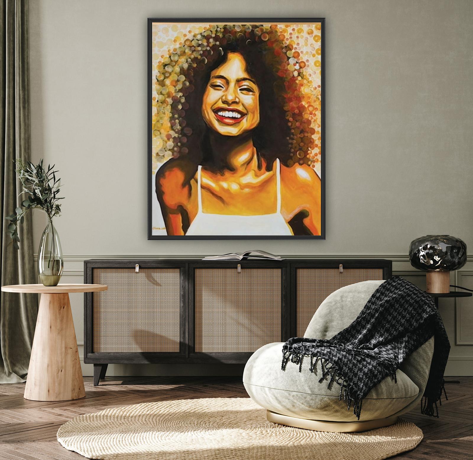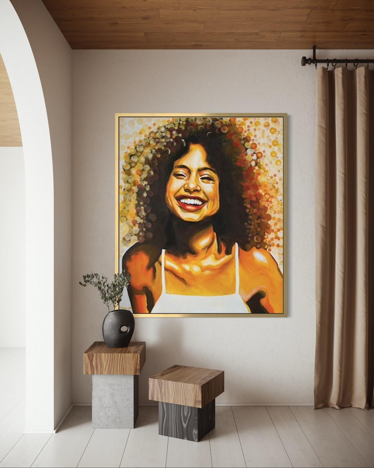 depicted in warm and emotive colors. She has a wide smile, and her eyes shine with joy and vitality.