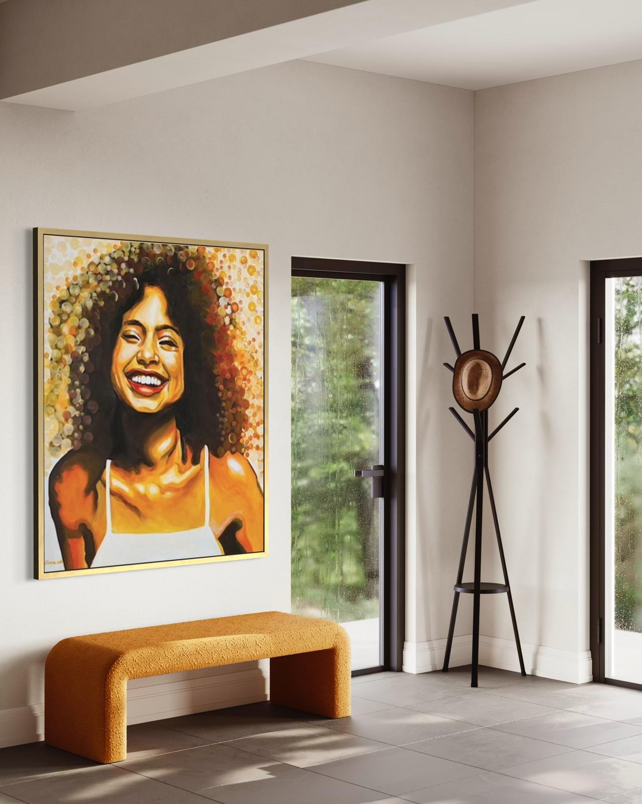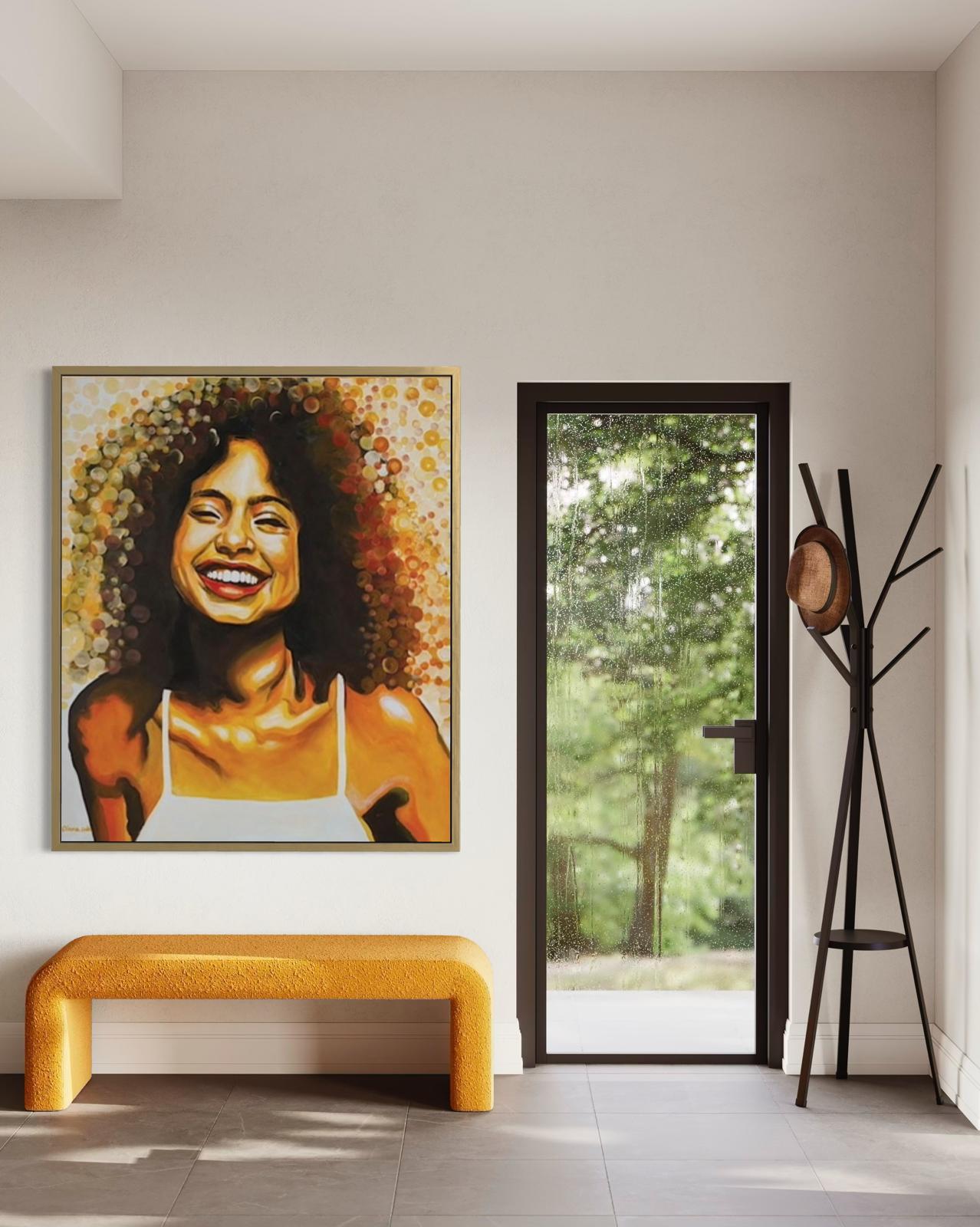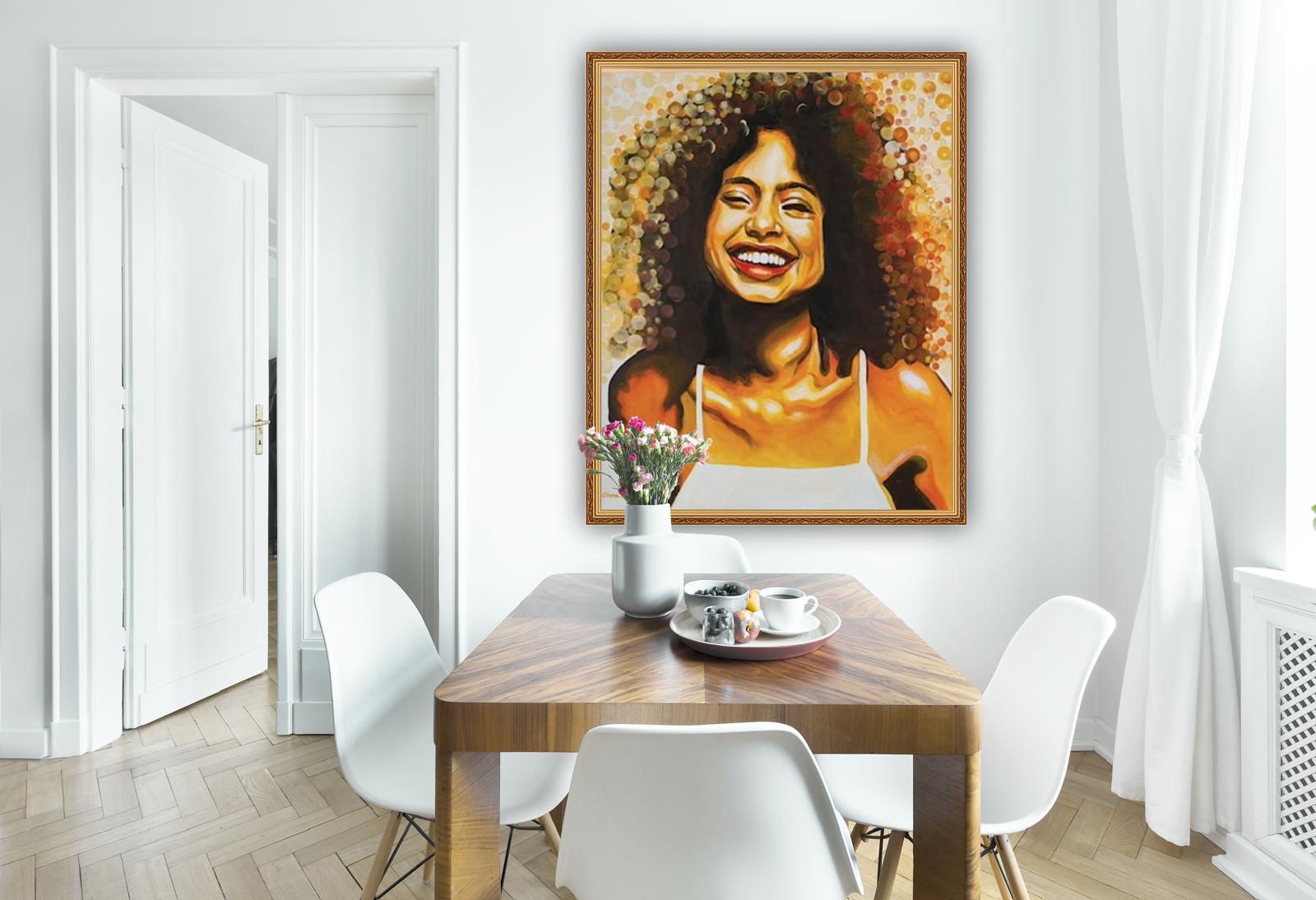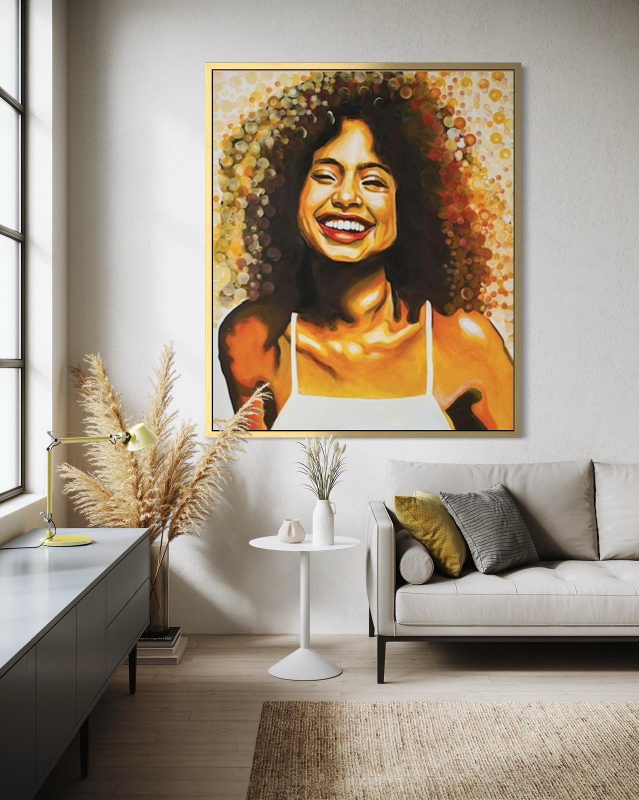 depicted in warm and emotive colors. She has a wide smile, and her eyes shine with joy and vitality.