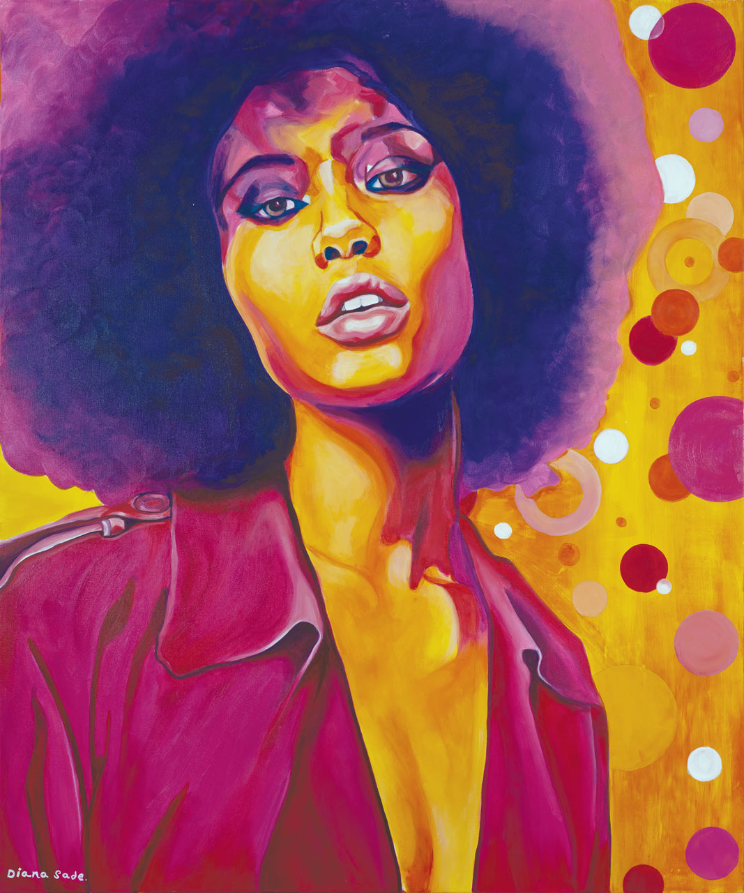 In her eyes, she seems to be brimming with passion. The yellow hues and warm colors, along with the unique background, create an atmosphere of mystery.