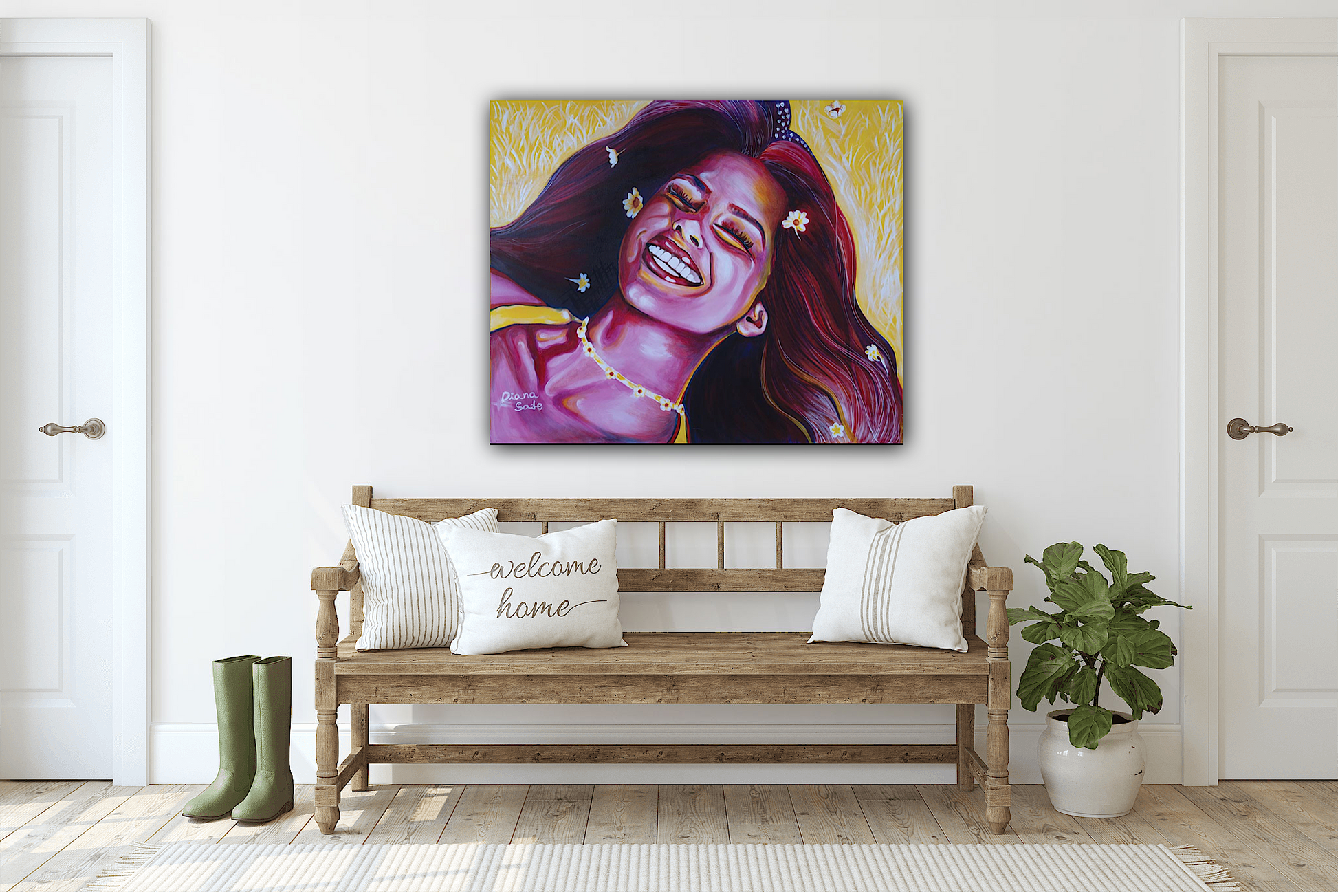 It is a painting of summer, warmth, and love, uplifting any space and giving the viewer a pleasant and joyful feeling.