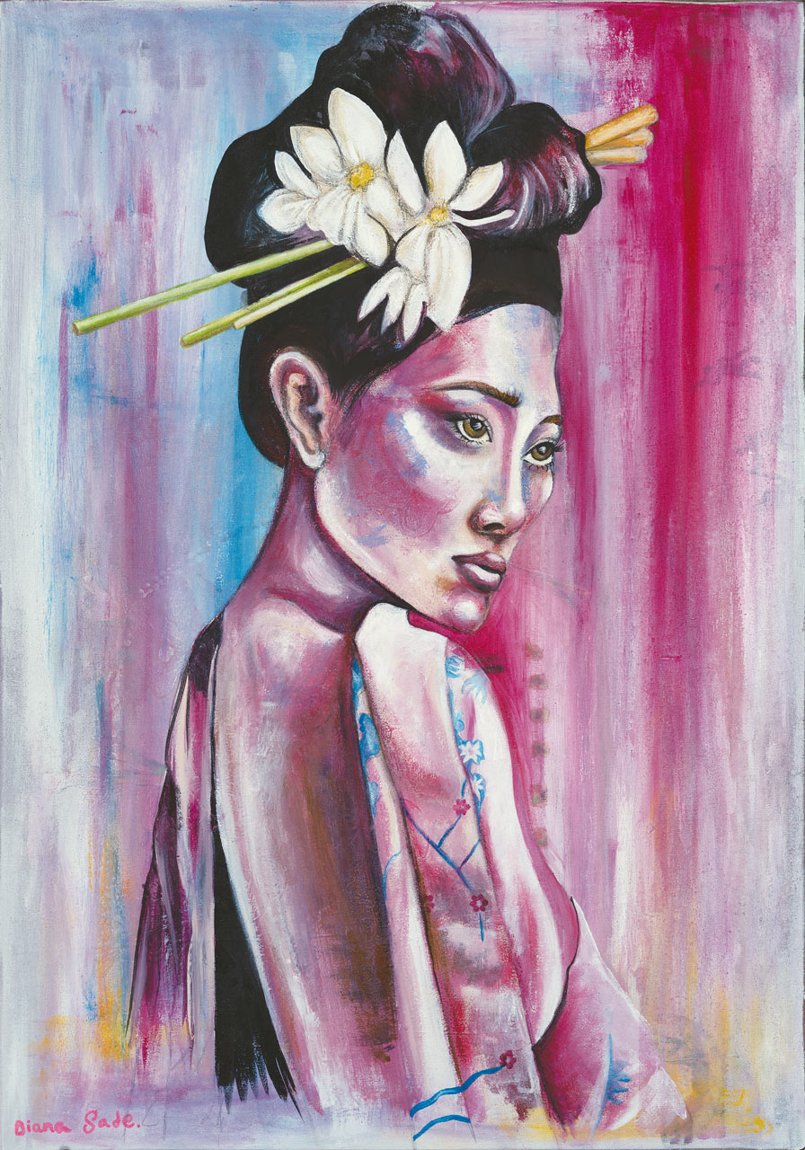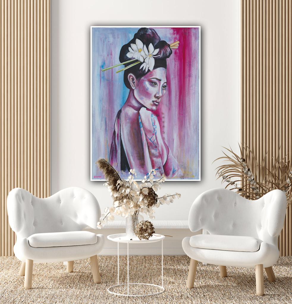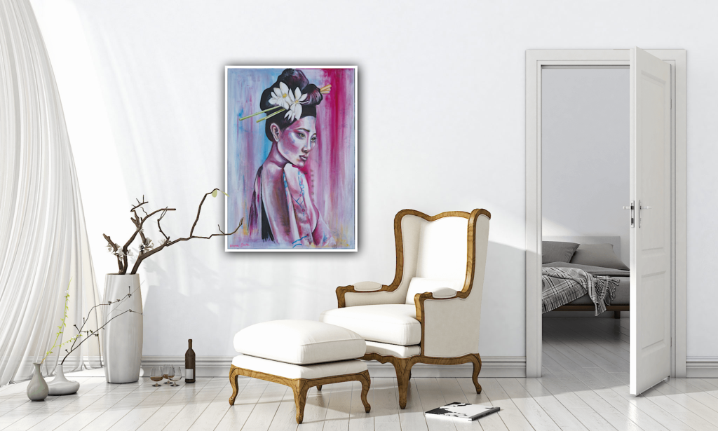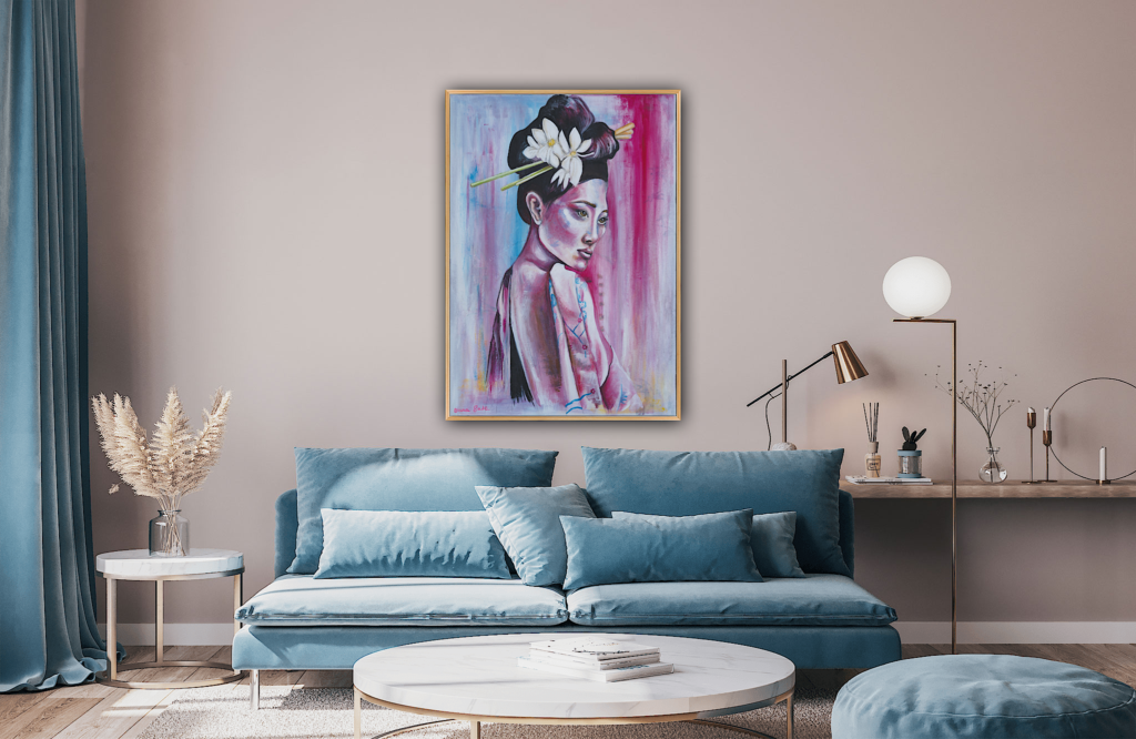 The Japanese woman in the painting is portrayed in pink colors, infusing every space with scents of Japanese culture.