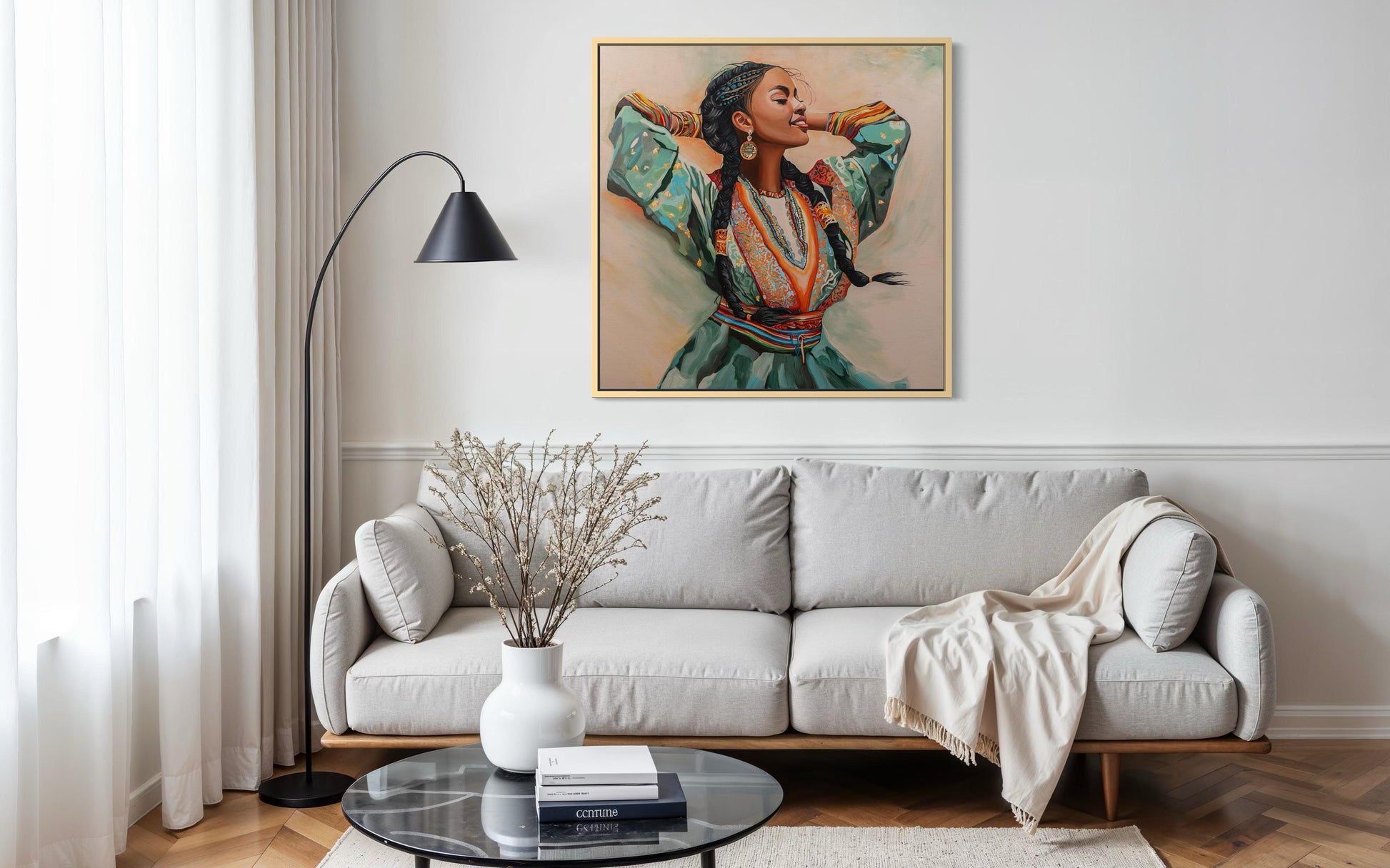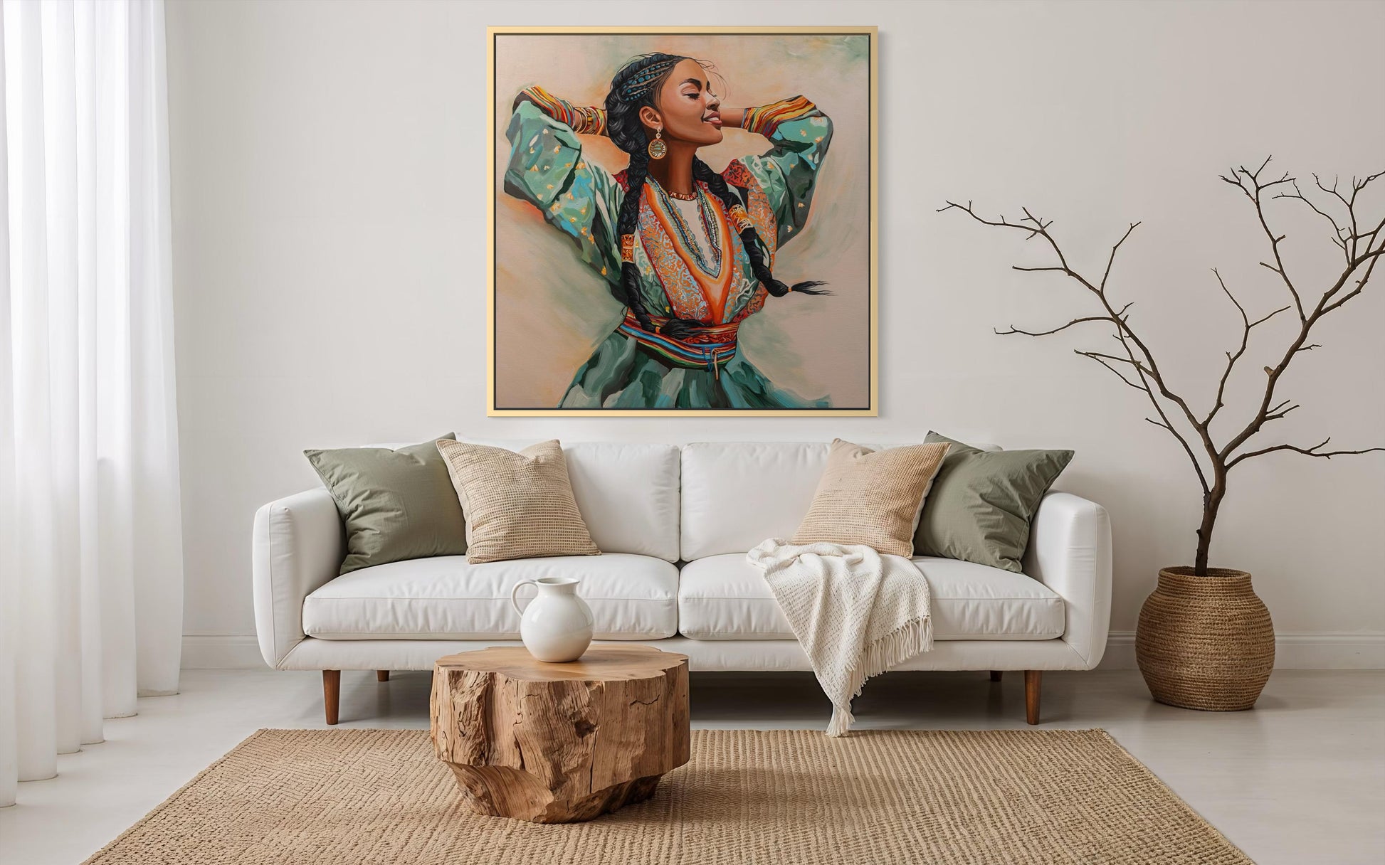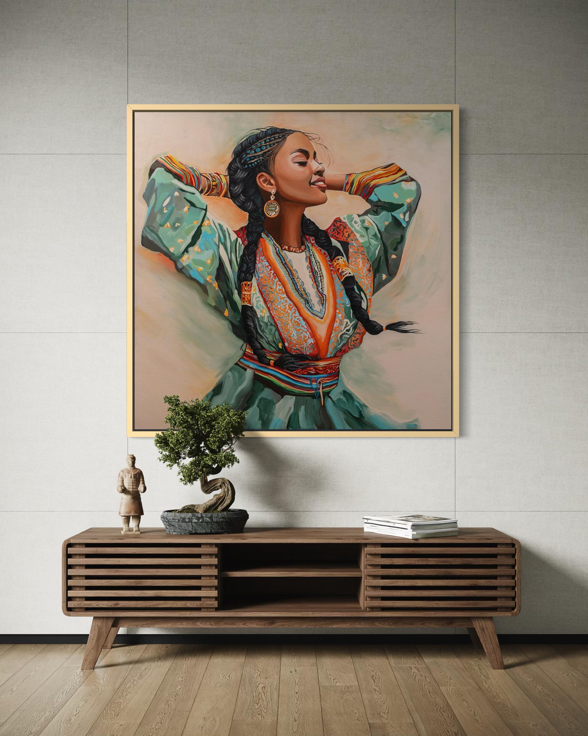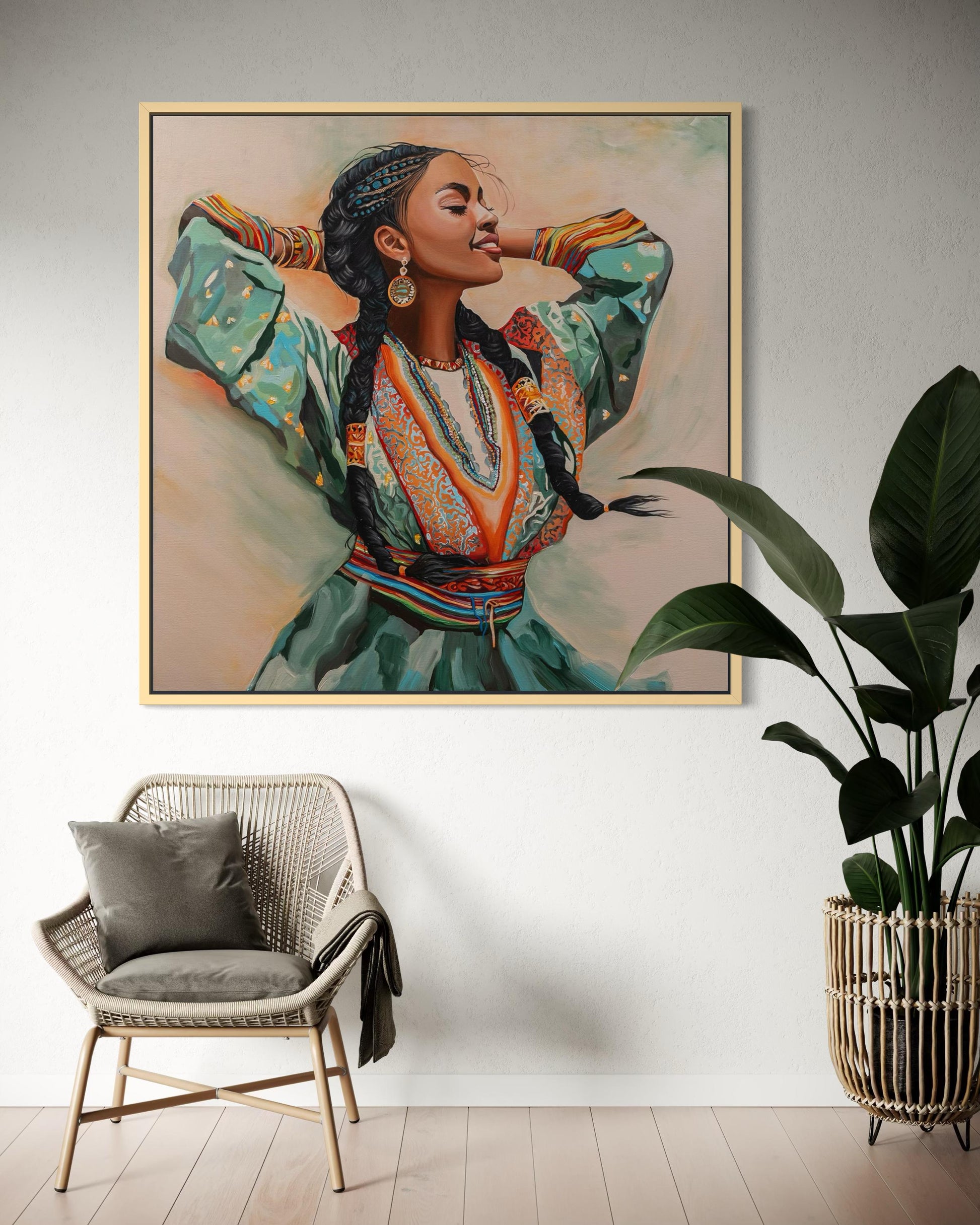 A painting from the 'Rhythm Of Life' series. This work celebrates femininity, movement, and cultural power. Warm, rich colors capture a moment of inner flow and ancestral pride, infusing the space with life and vibrant energy.