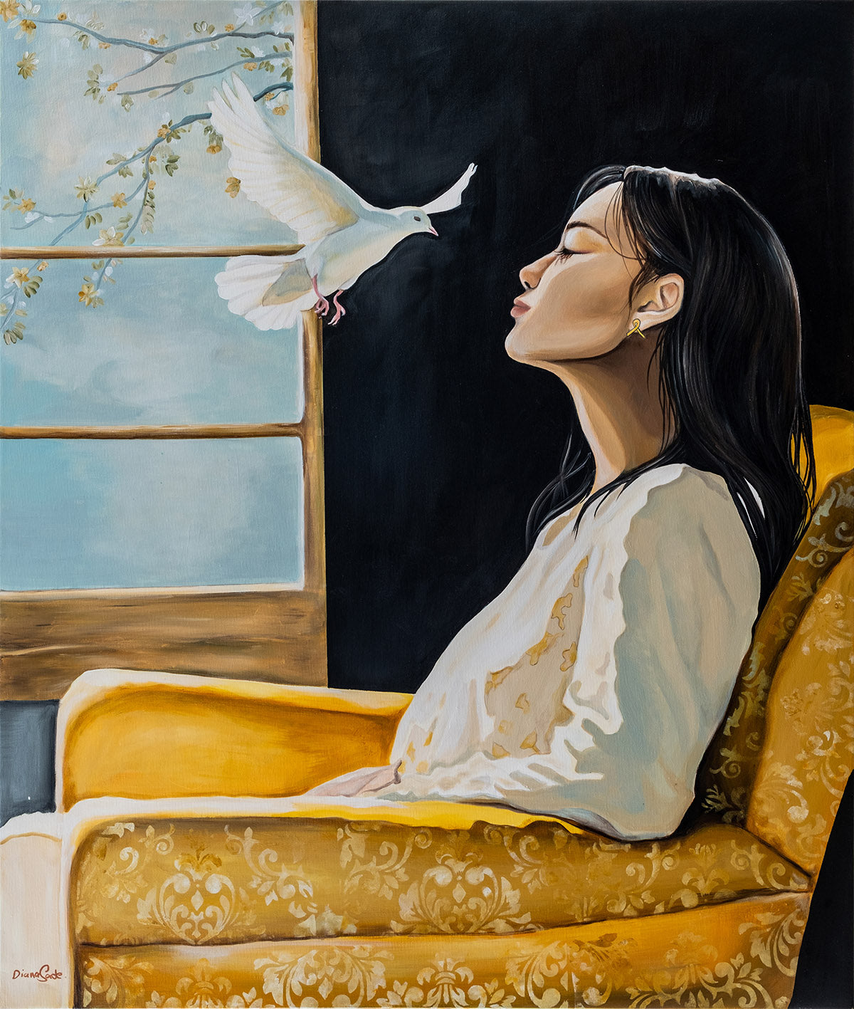 A painting that reflects inner peace and connection to nature through a gentle moment of release and hope.