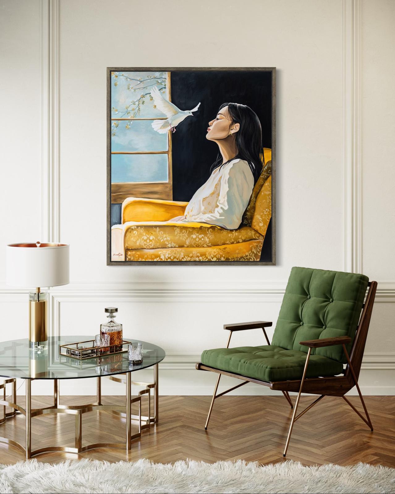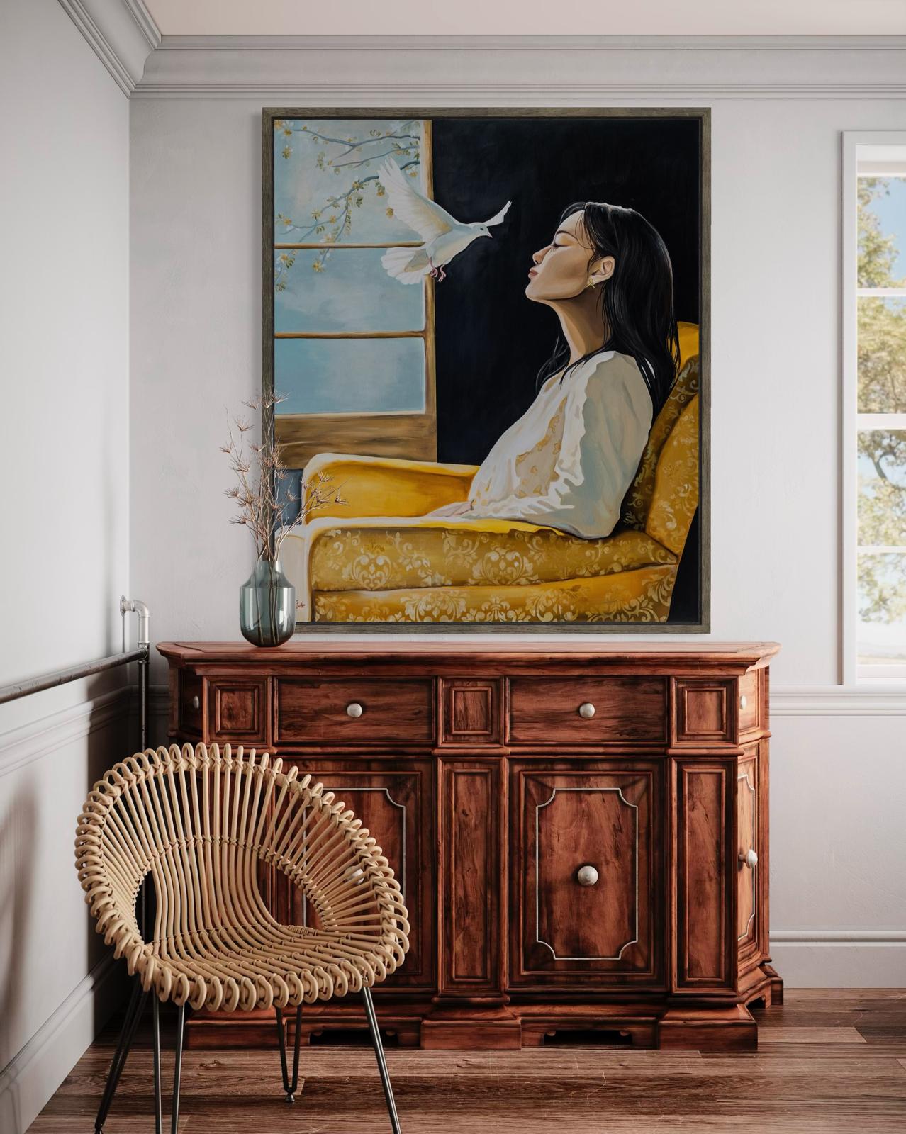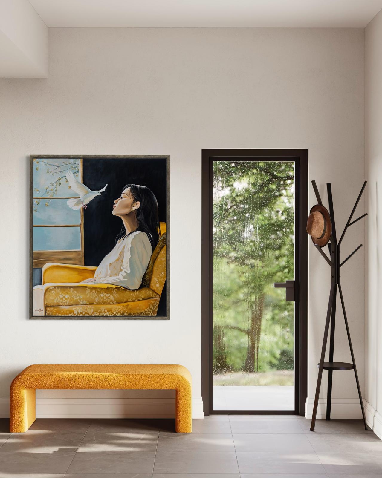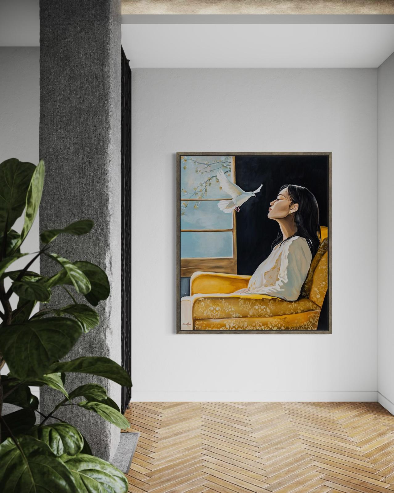 The encounter between the woman and the dove evokes calm, freedom, and a sense of new light entering the heart.