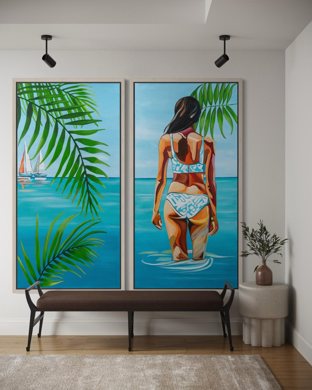 A pair of Tropical painting that tell a story of freedom. A gaze toward an open sea, and vibrant colors that evoke an endless vacation. Together, they bring a serene, elegant, and inspiring atmosphere.