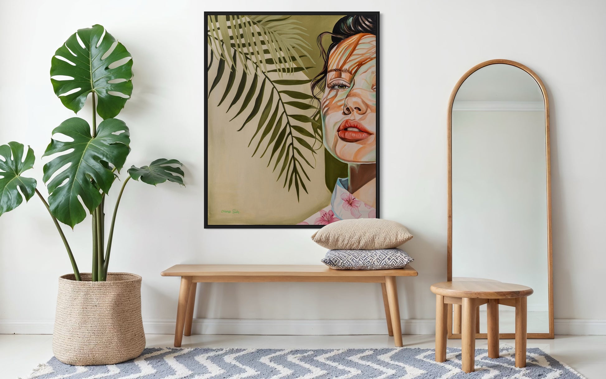 דיוקן רך אך מרשים של אישה המוסתרת חלקית בצללי עלי דקל. משחק האור והצל על פניה יוצר אווירה כמעט חלומית, ומשלב טבע עם הבעה אנושית. מבטה השקט והדוגמה הפרחונית העדינה על חולצתה מוסיפים להרמוניה העדינה של הקומפוזיציה השלווה הזו.