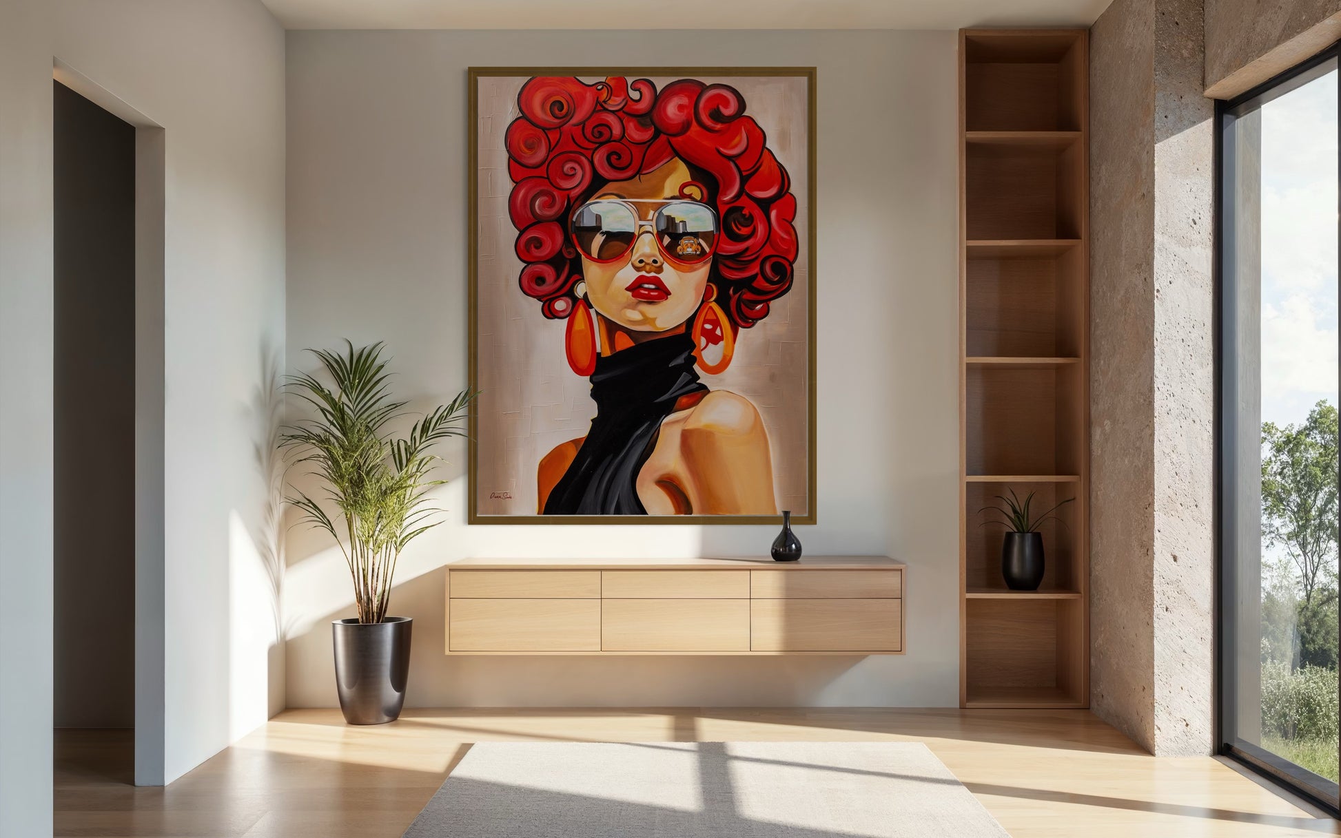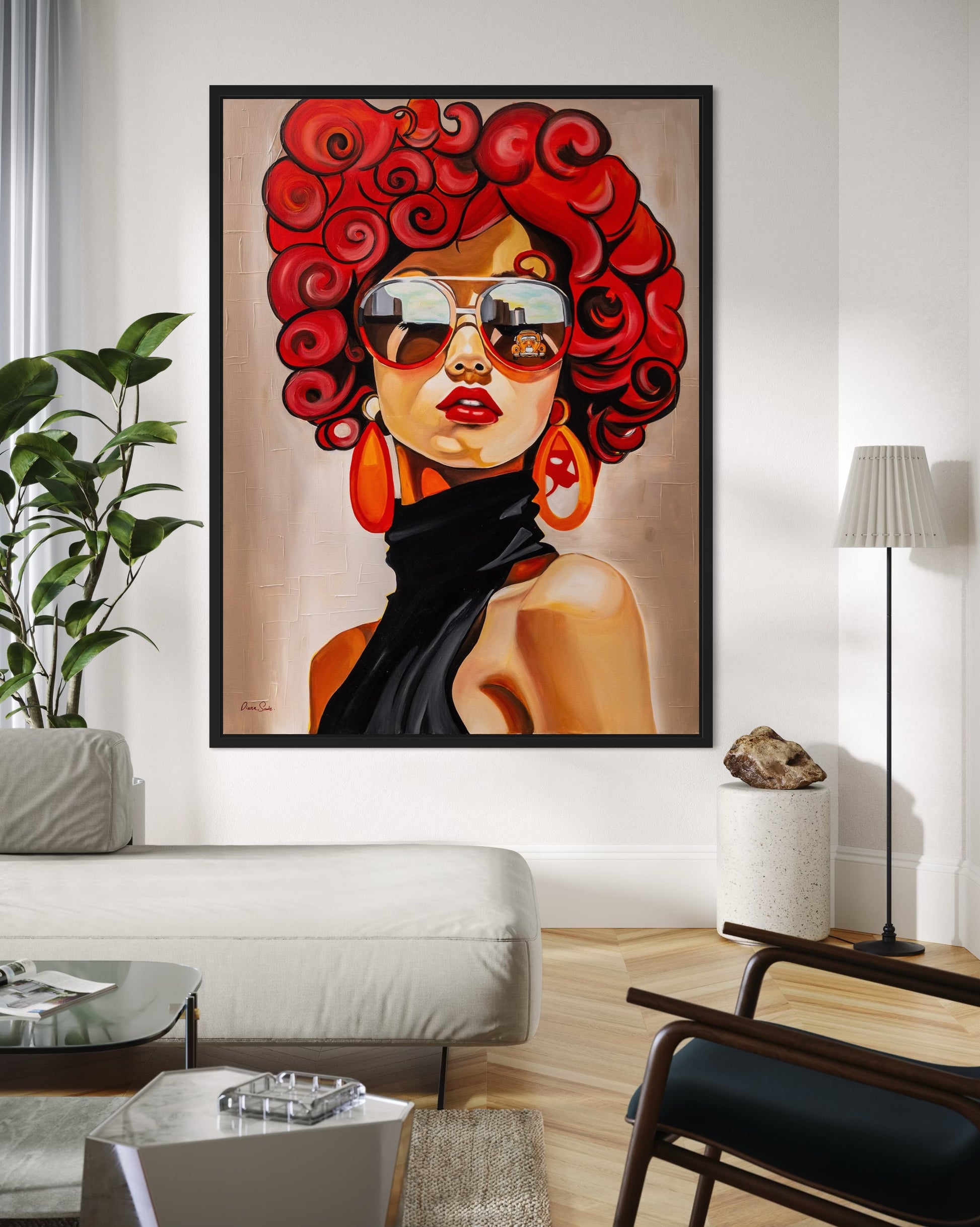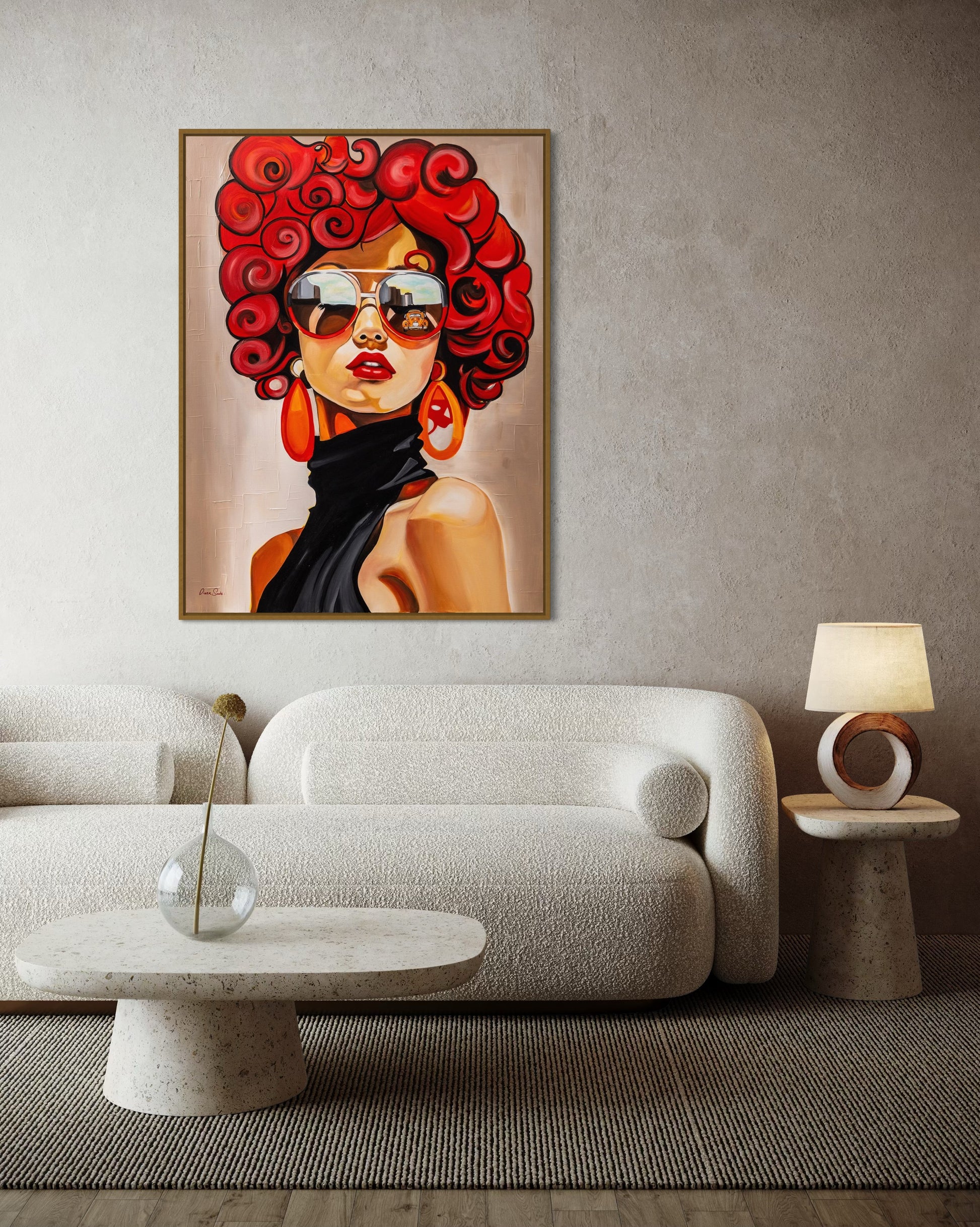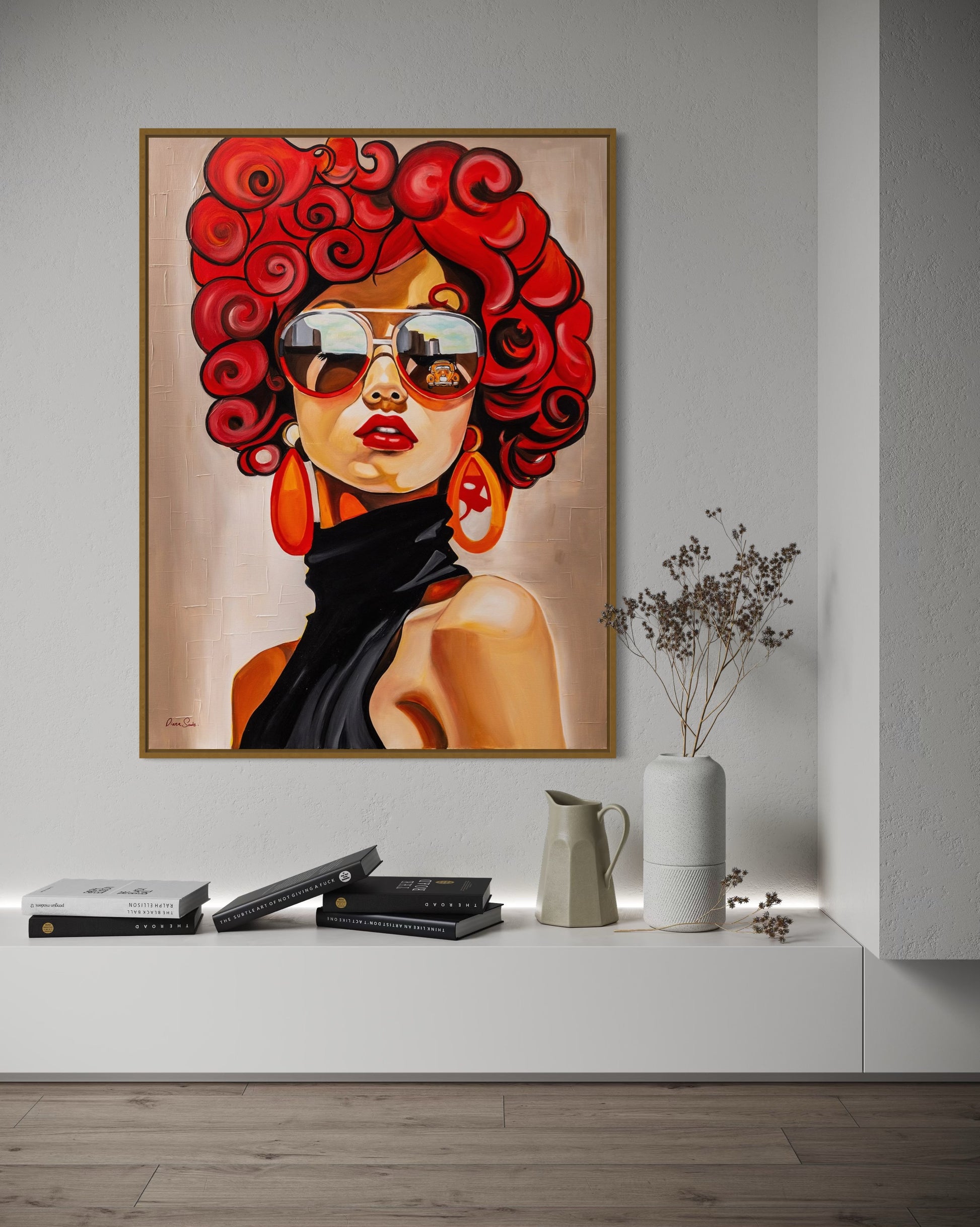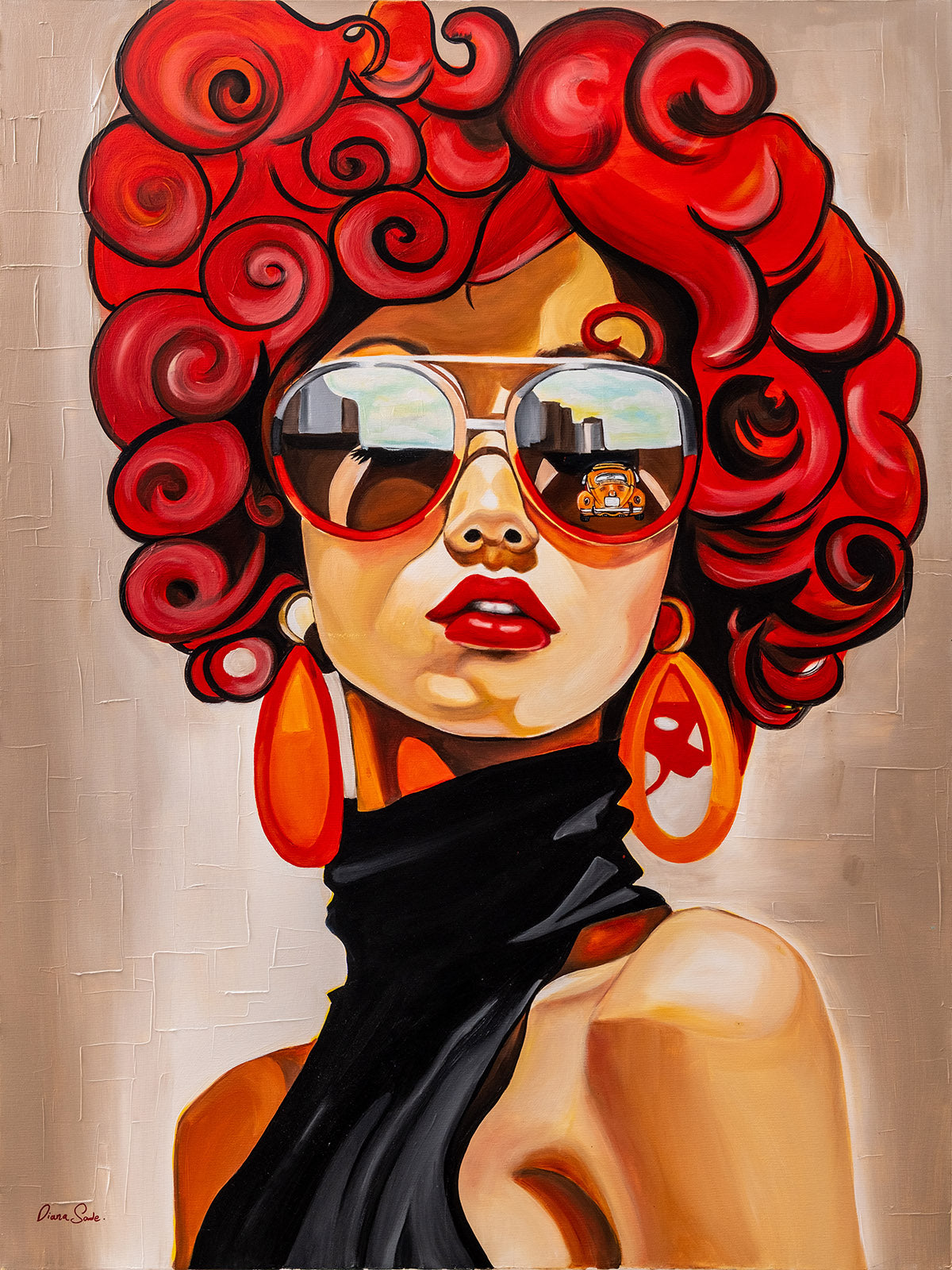 דיוקן נועז וזוהר זה לוכד אישה עזה עם תלתלים אדומים בולטים, משקפי שמש גדולים במיוחד ונוכחות עוצמתית. השתקפות קו הרקיע של העיר במשקפי השמש שלה מרמזת על הדופק של ניו יורק - מהיר, מסוגנן ומלא גישה. הבעת פניה הבטוחה, צבעיה התוססים והמראה האופנתי המתקדם שלה חוגגים אנרגיה עירונית ואינדיבידואליות חסרת פחד.