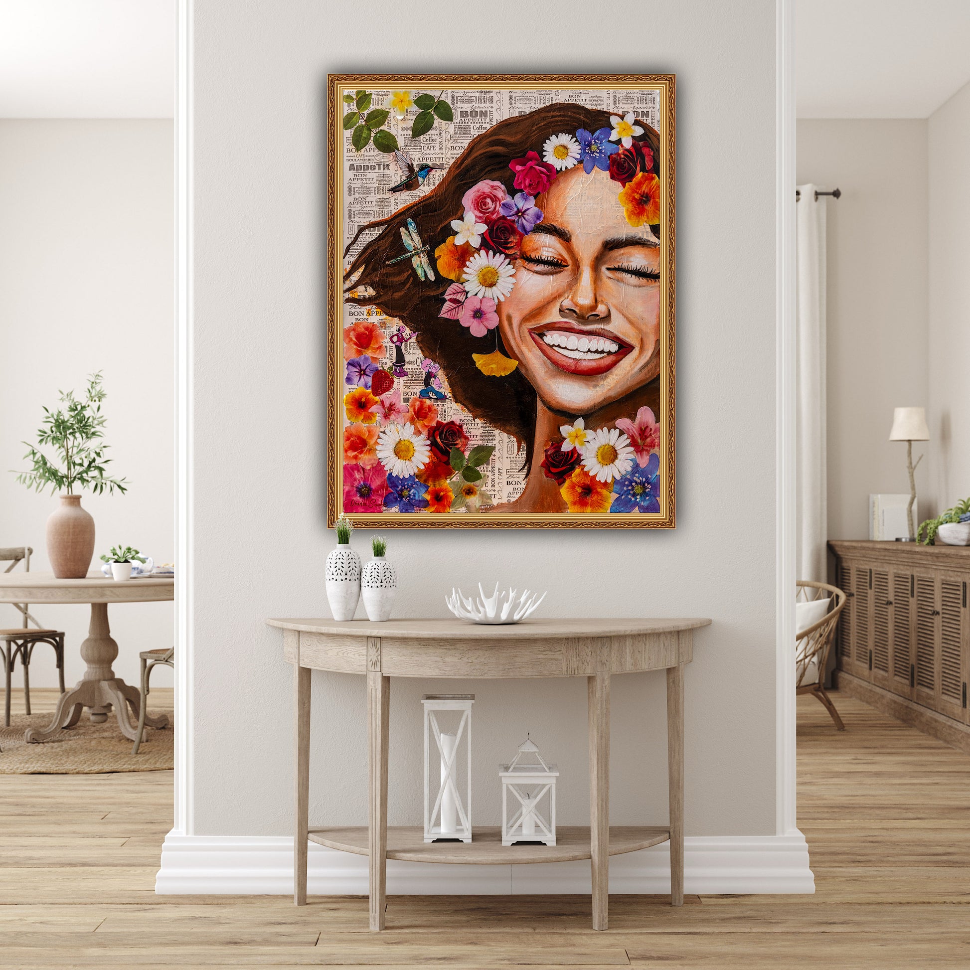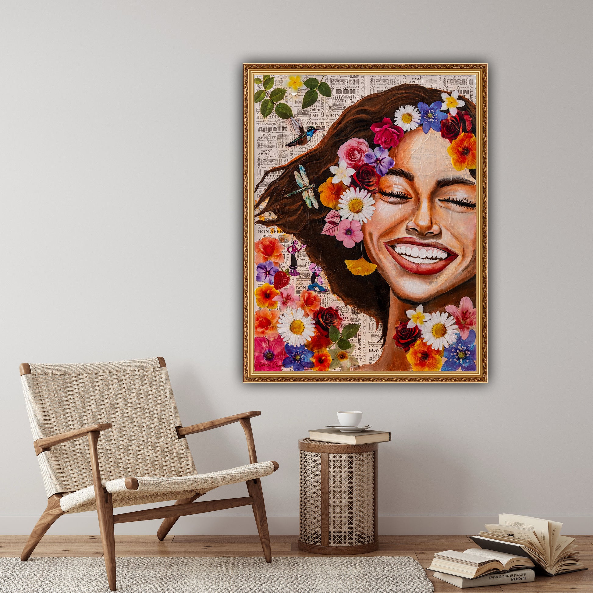 ציור שמח ותוסס של אישה שמקרינה אושר צרוף.