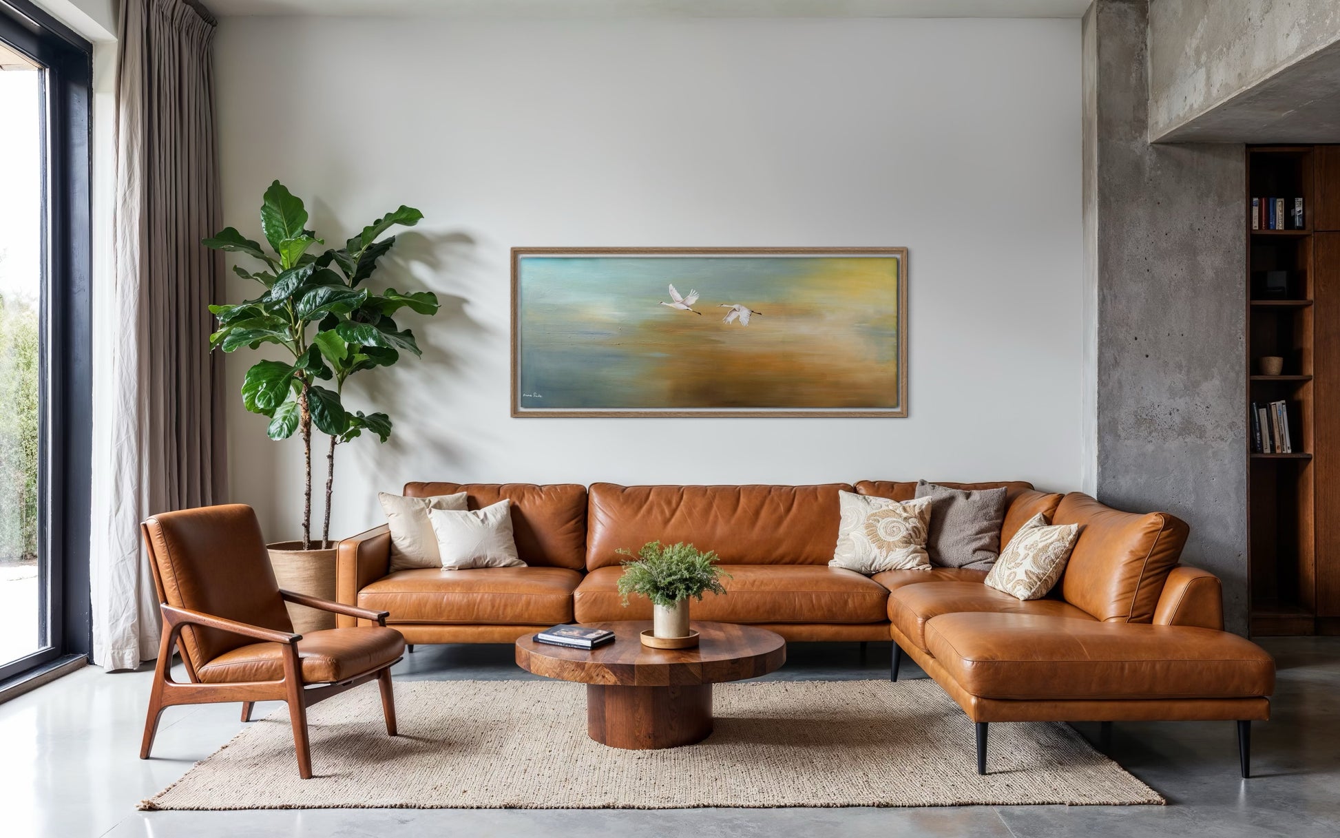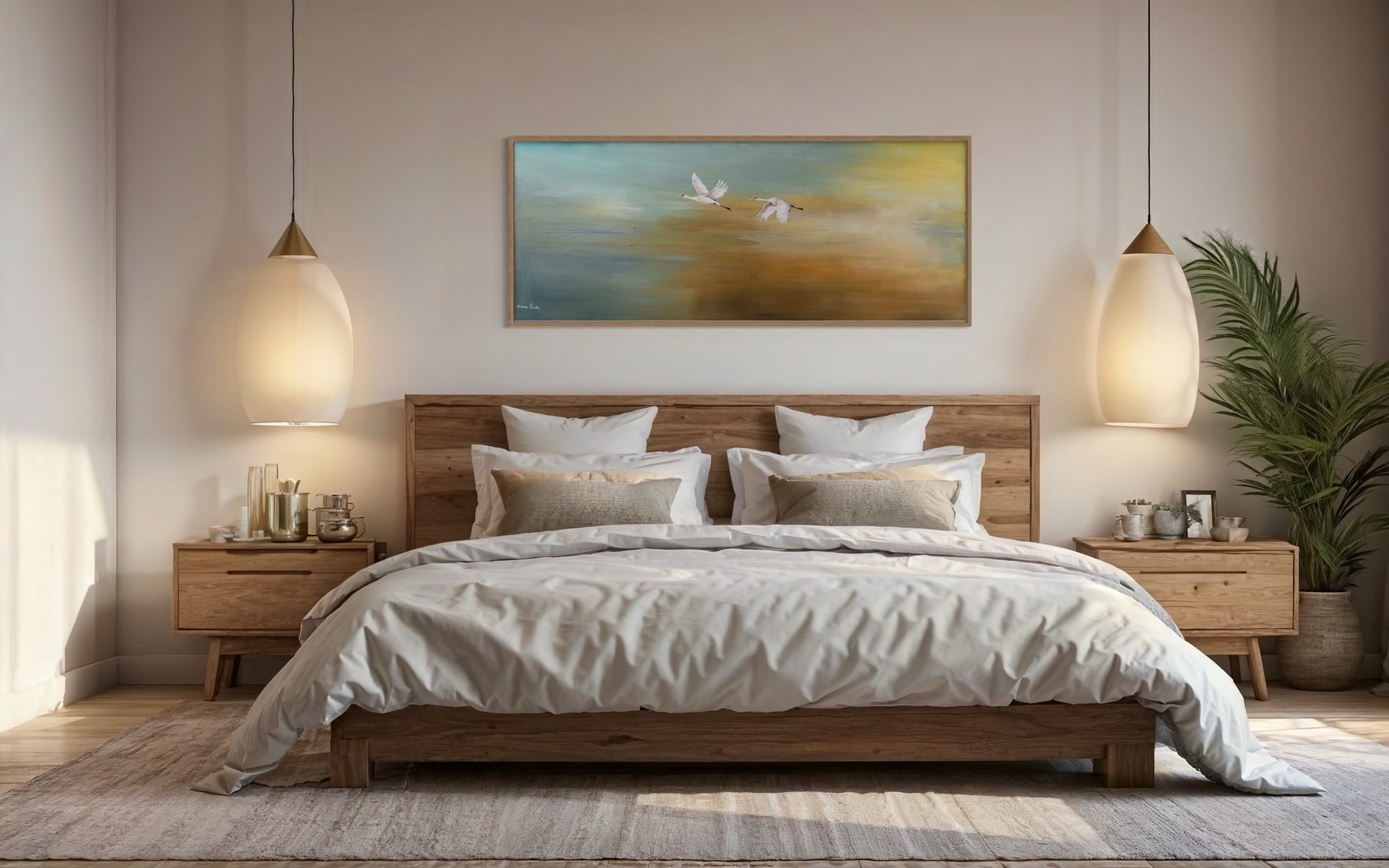 קומפוזיציה אופקית שלווה, שני עגורים לבנים עפים מעל נוף חלומי. גוונים מעורפלים של חול זהוב, טורקיז רך ואפור ערפילי משתלבים יחד ליצירת רקע שליו. העגורים מסמלים חן, הרמוניה וחופש - ומביאים תחושה של תנועה שקטה ואלגנטיות לחלל.