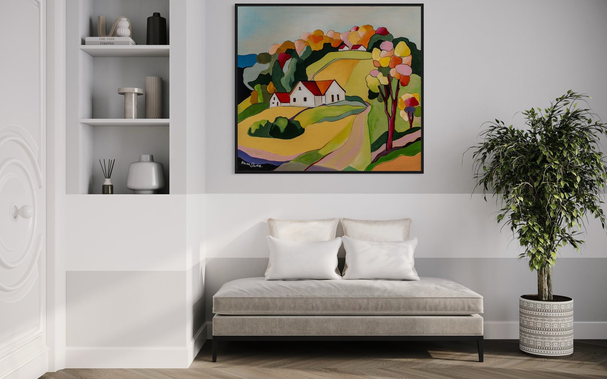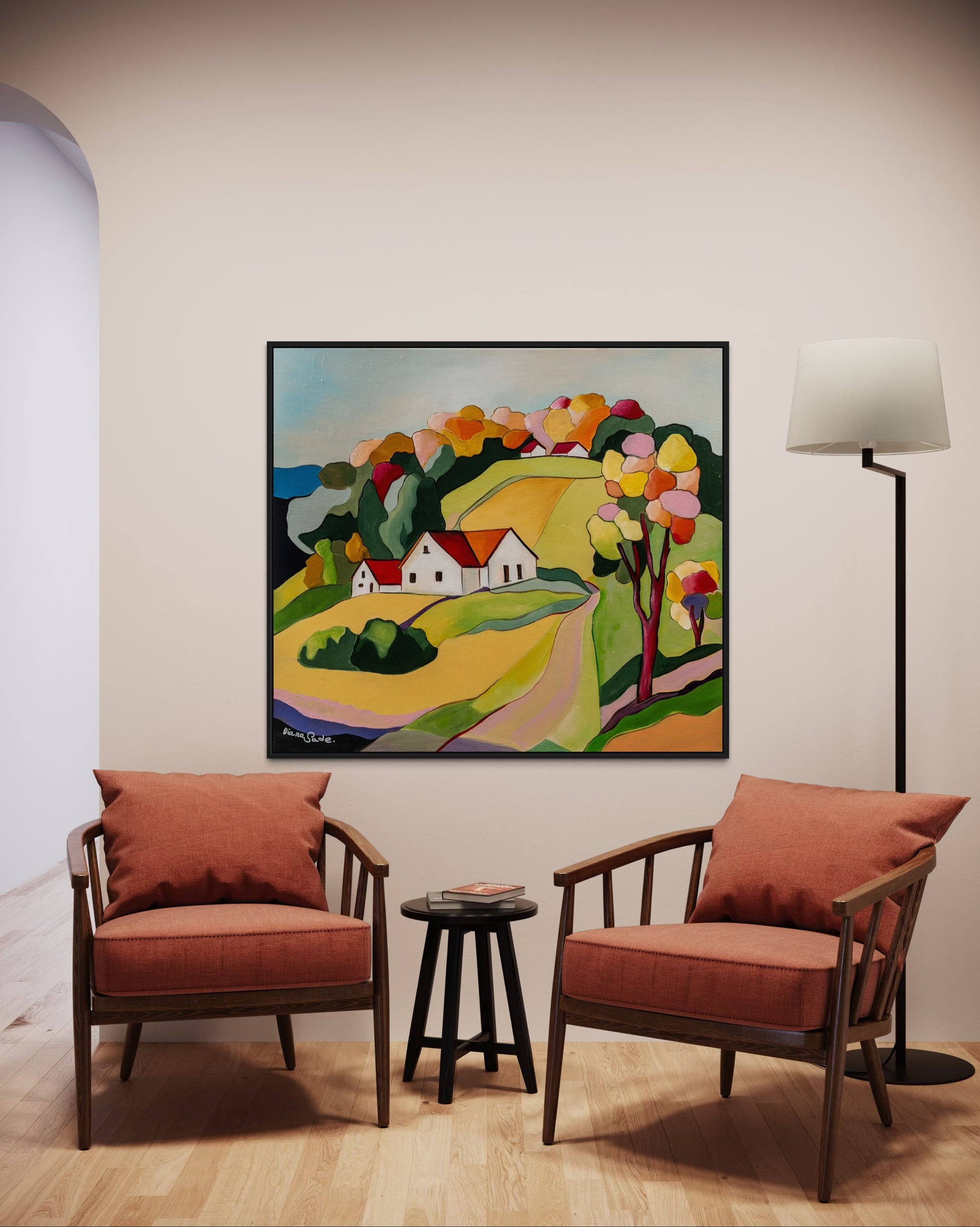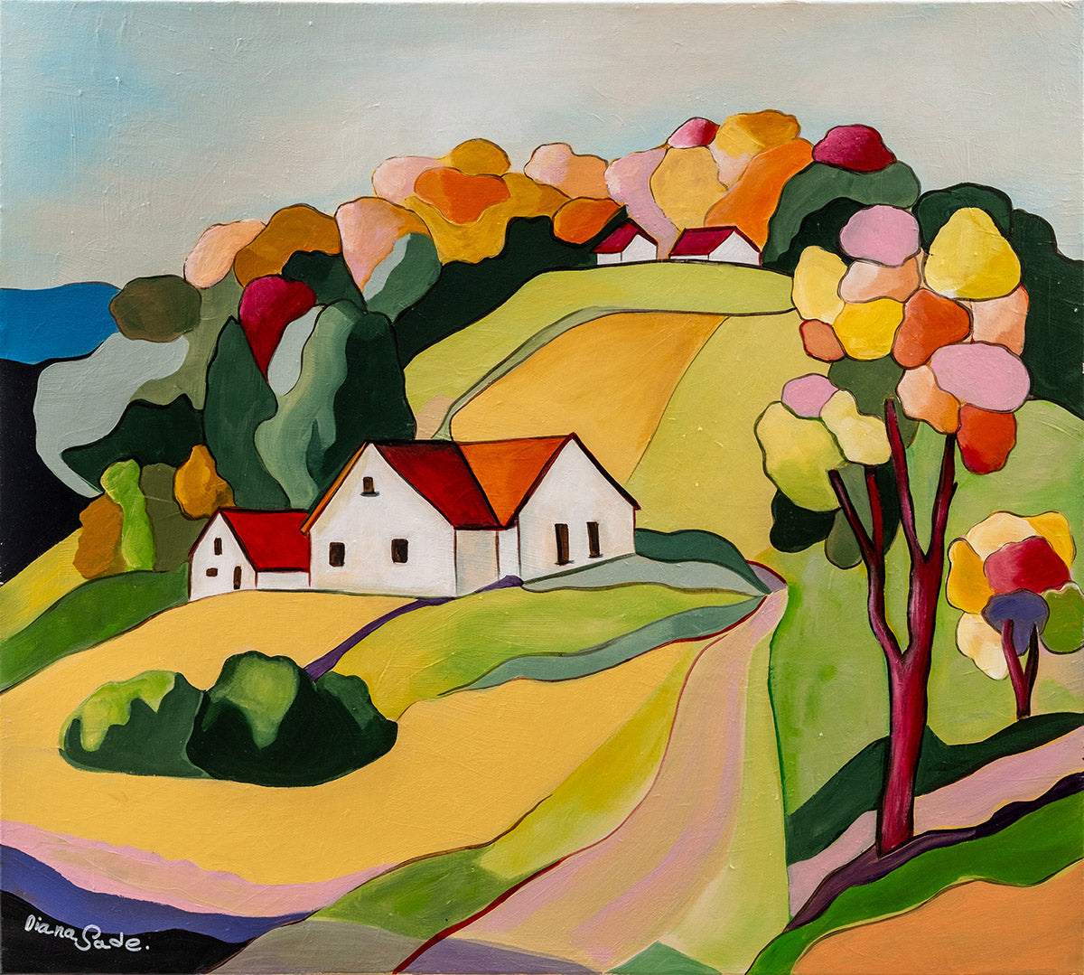 פרשנות עליזה וצבעונית לנוף כפרי בסגנון אמנותי נאיבי. הצורות הפשוטות והפלטה הבהירה יוצרות אווירה נאיבית ושמחה, מלאת חמימות ותמימות.