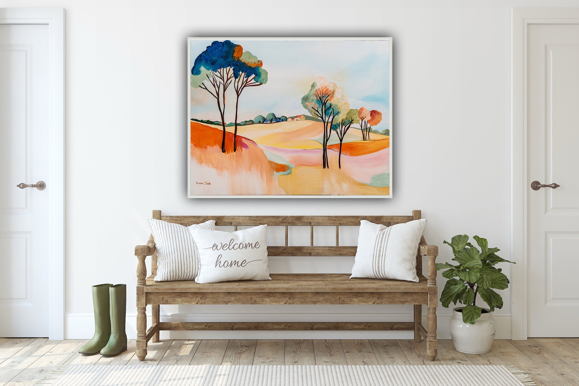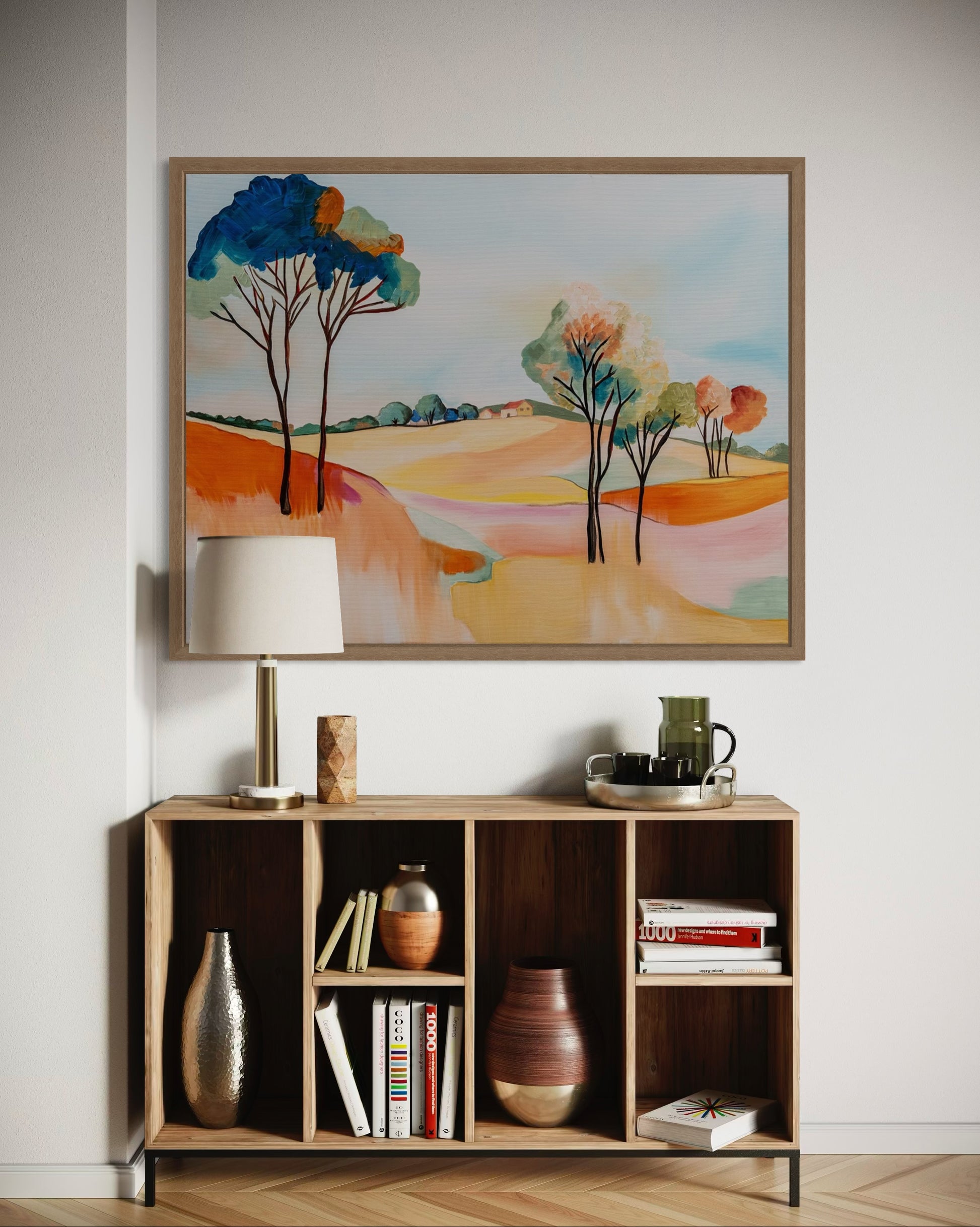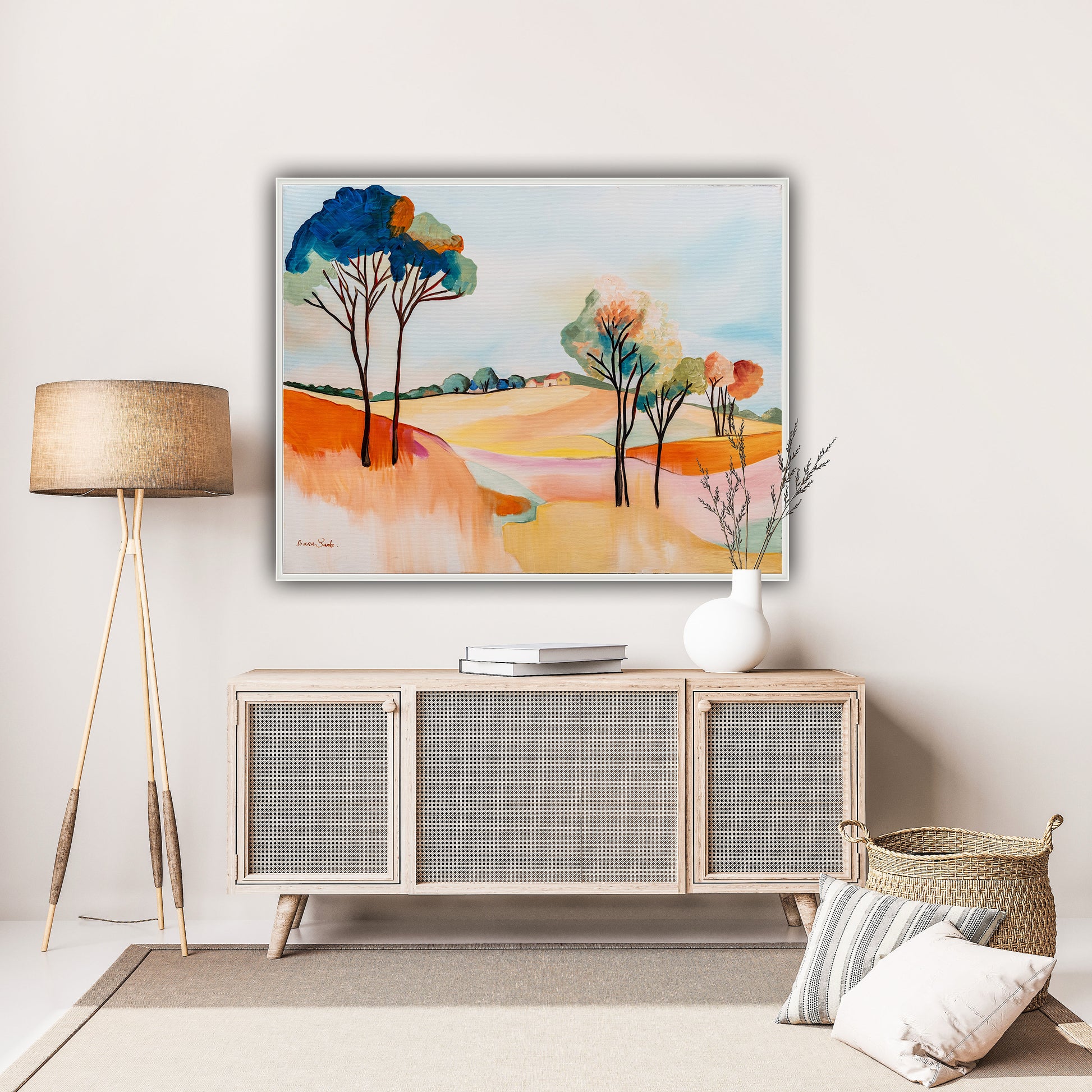 תיאור של נוף גבעי צבוע בגוונים עדינים של אפרסק, זהב וורוד פסטל. פלטת הצבעים הרכה ומשיכות המכחול מעוררות תחושה של רוגע, נוסטלגיה ושלווה באוויר הפתוח.