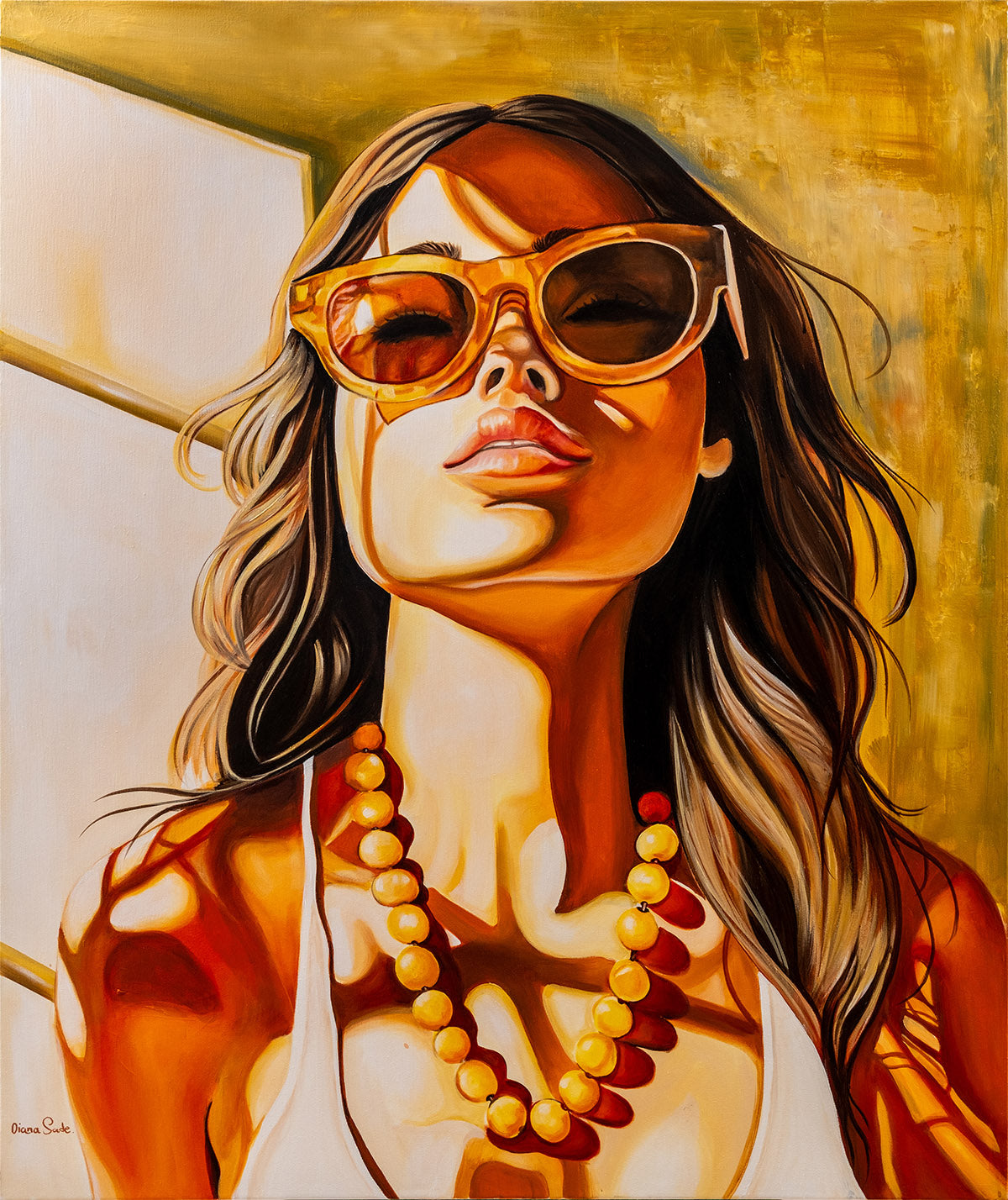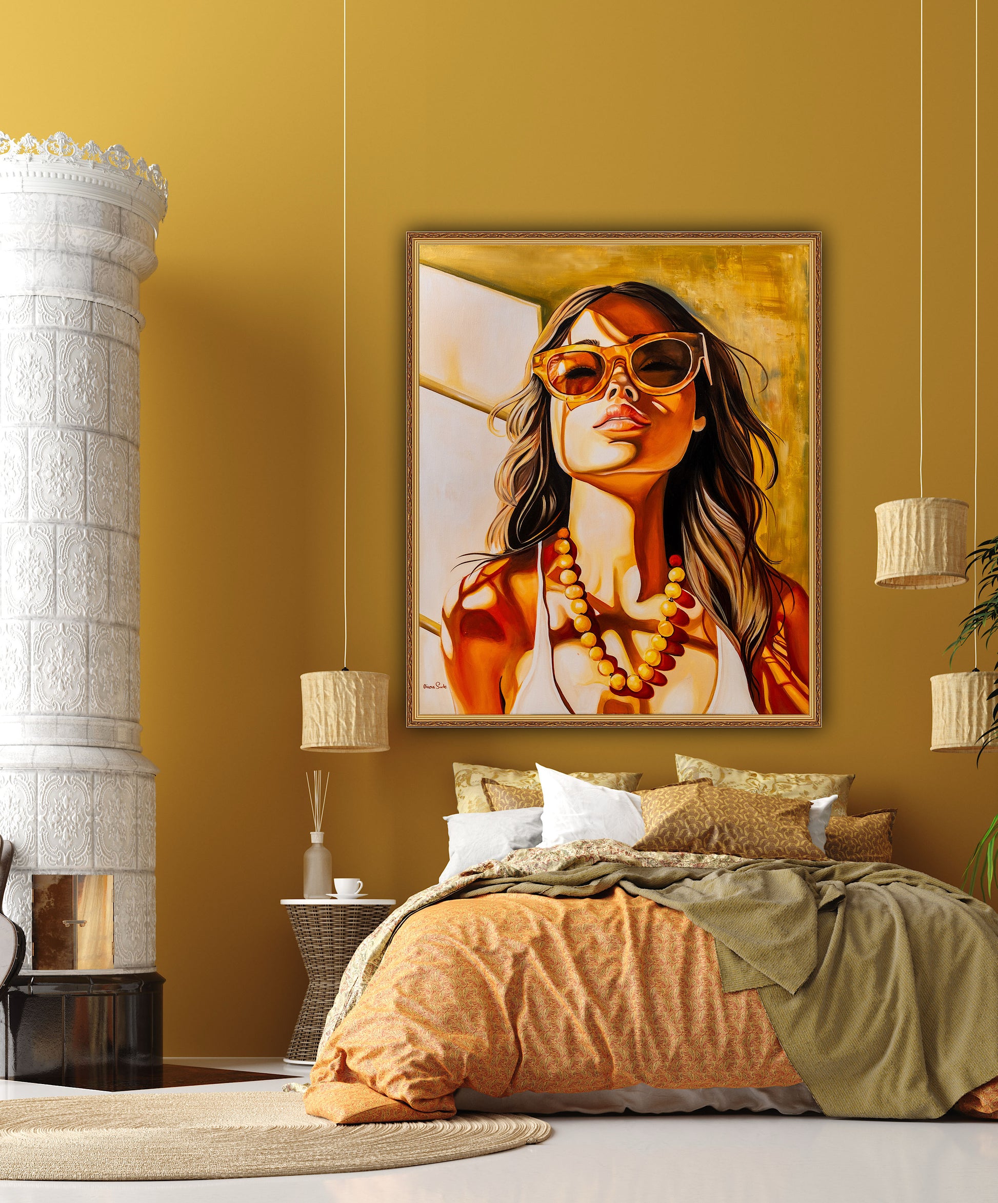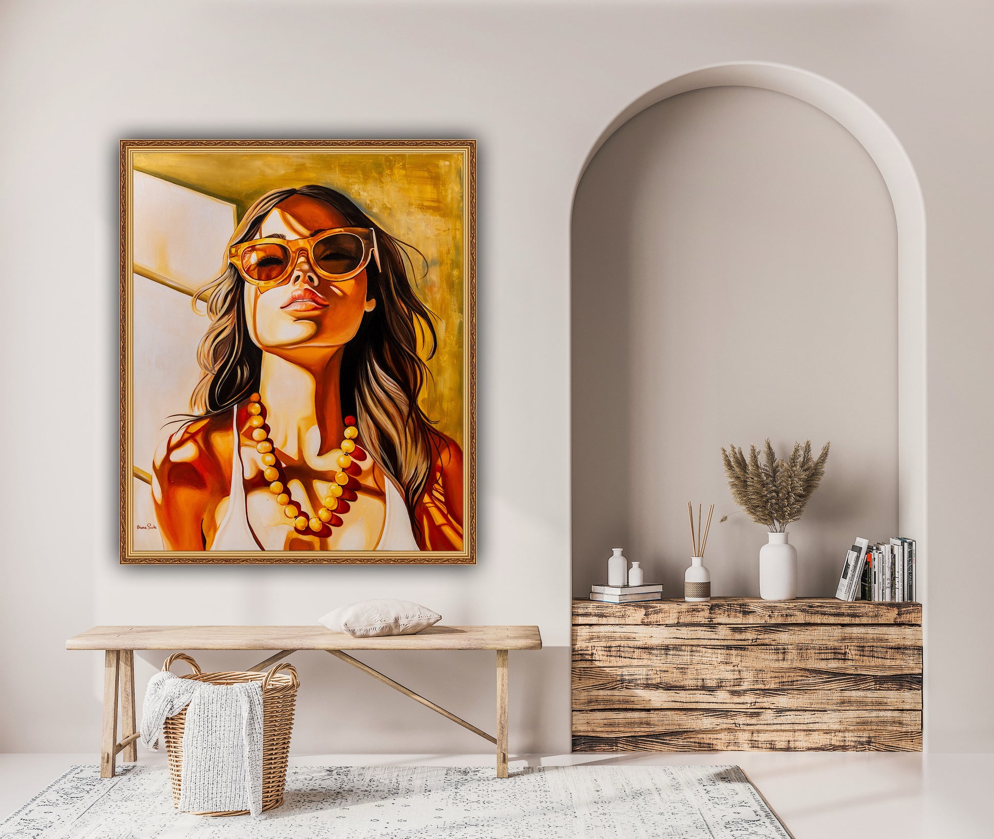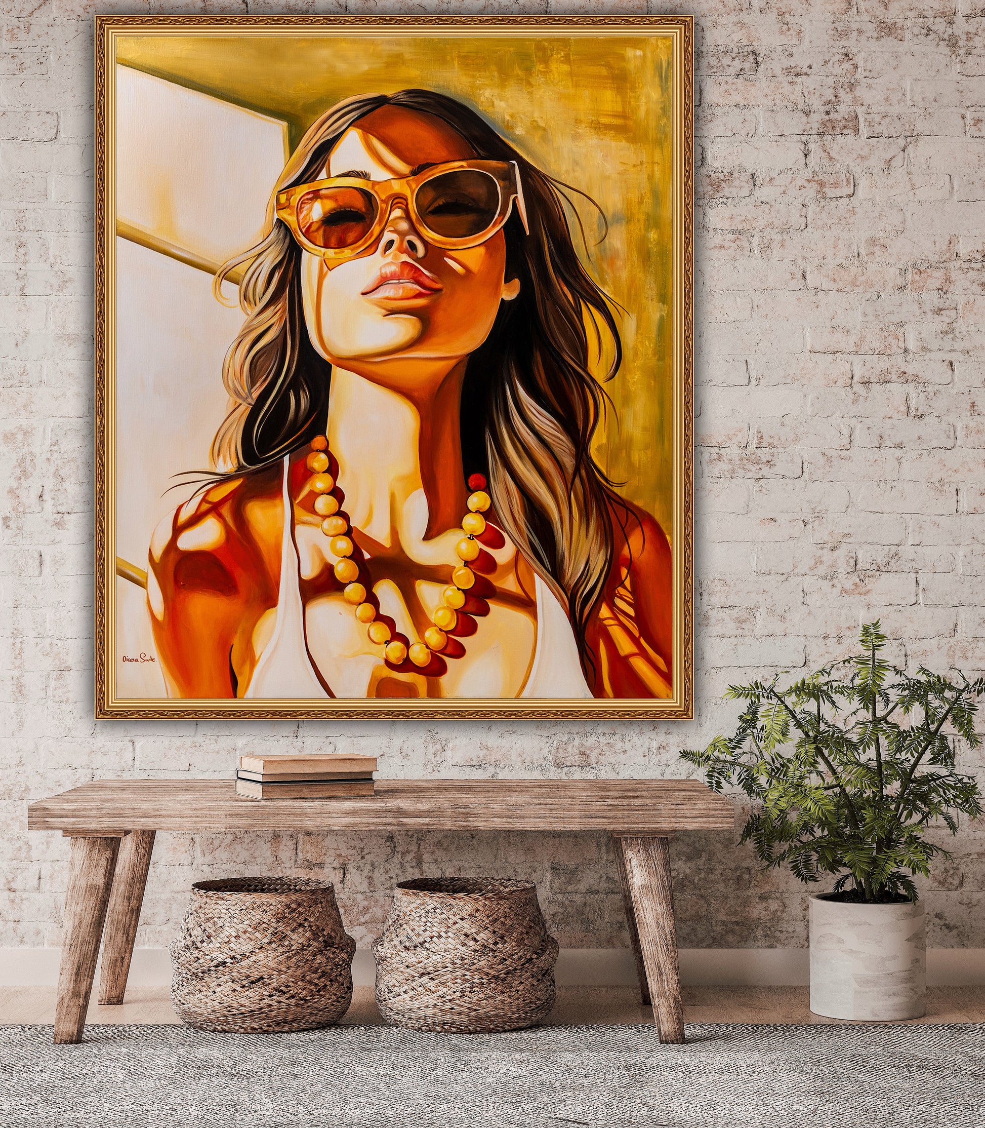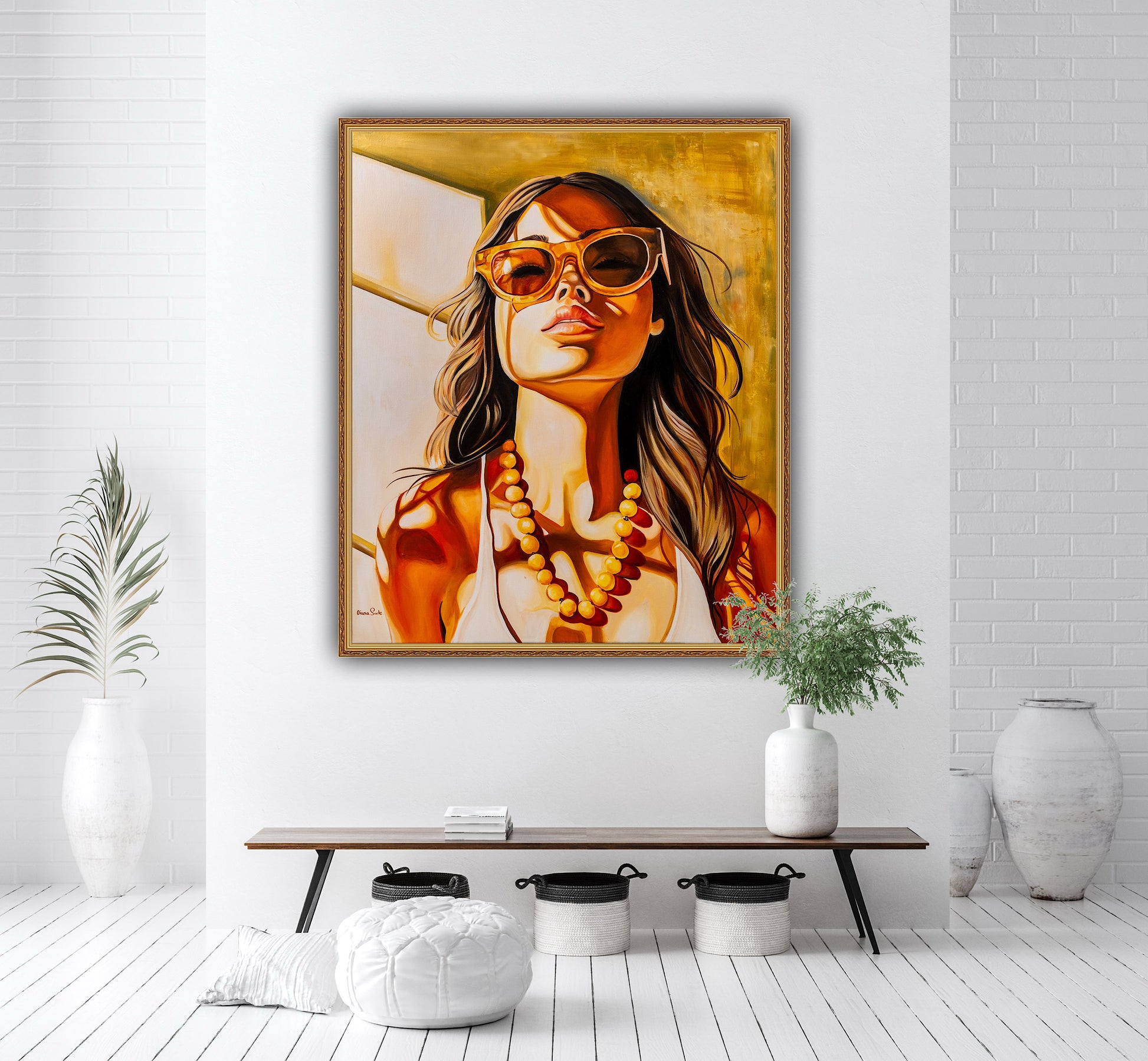 בשיער גולש ובשרשרת חרוזים צהובים-אדומים נועזים, היא עומדת בביטחון, עיניה עצומות וראשה מוטה מעט כלפי מעלה. גווני הענבר העשירים והצללים הדרמטיים מעבירים תחושה של שלווה, עוצמה ונוכחות מוחלטת - לוכדים רגע של חופש פנימי ודממה מאושרת.