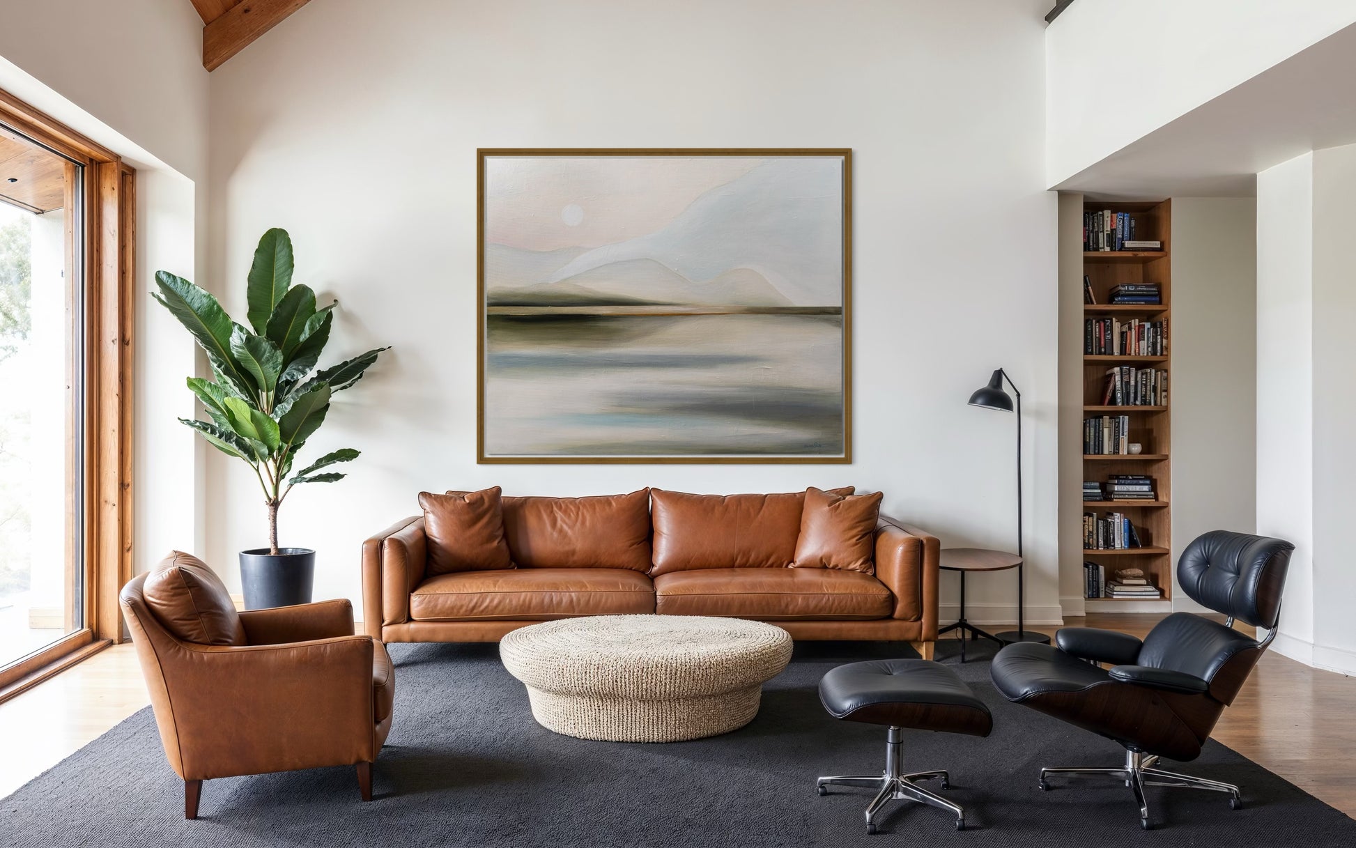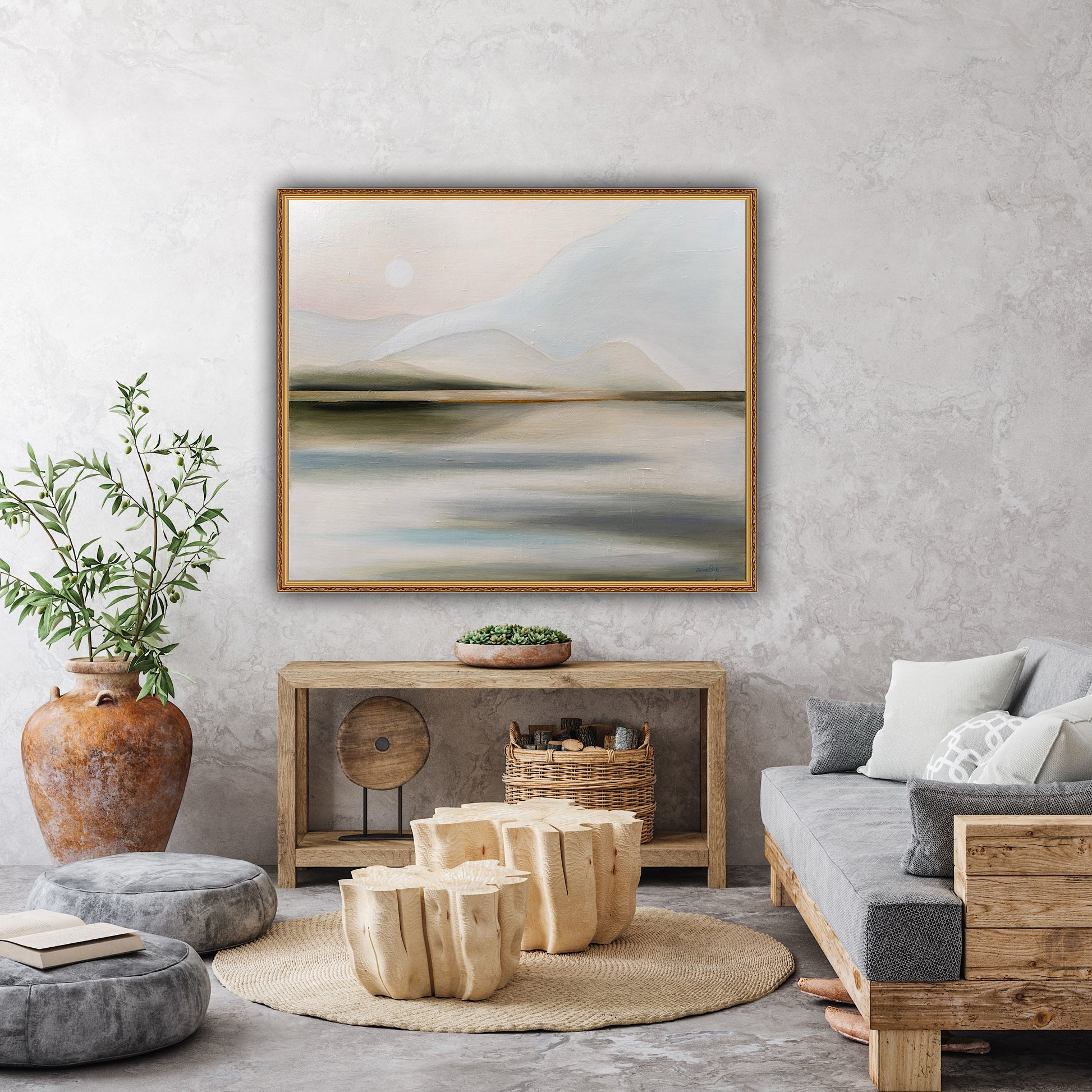 נוף רך ומינימליסטי, צלליות הרים בגווני פסטל של כחול ערפילי, בז' ומרווה. קו אופקי זהוב דק מחלק בעדינות את הסצנה, ומוסיף נגיעה אלגנטית המאזנת בין טבע להפשטה. משיכות המכחול הרגועות והפלטה העדינה מזמינים השתקפות שקטה ותחושה של שלווה ורוגע.
