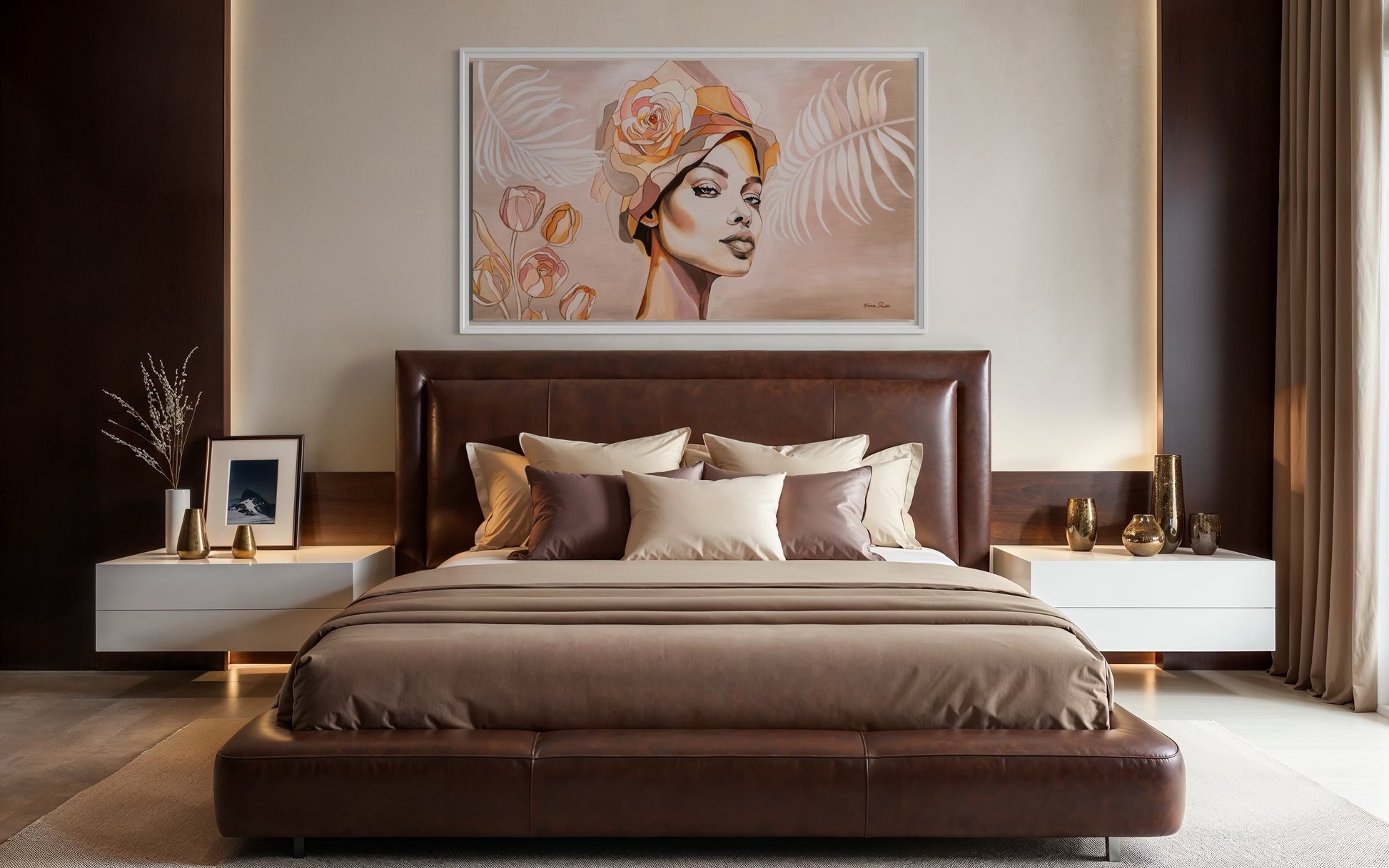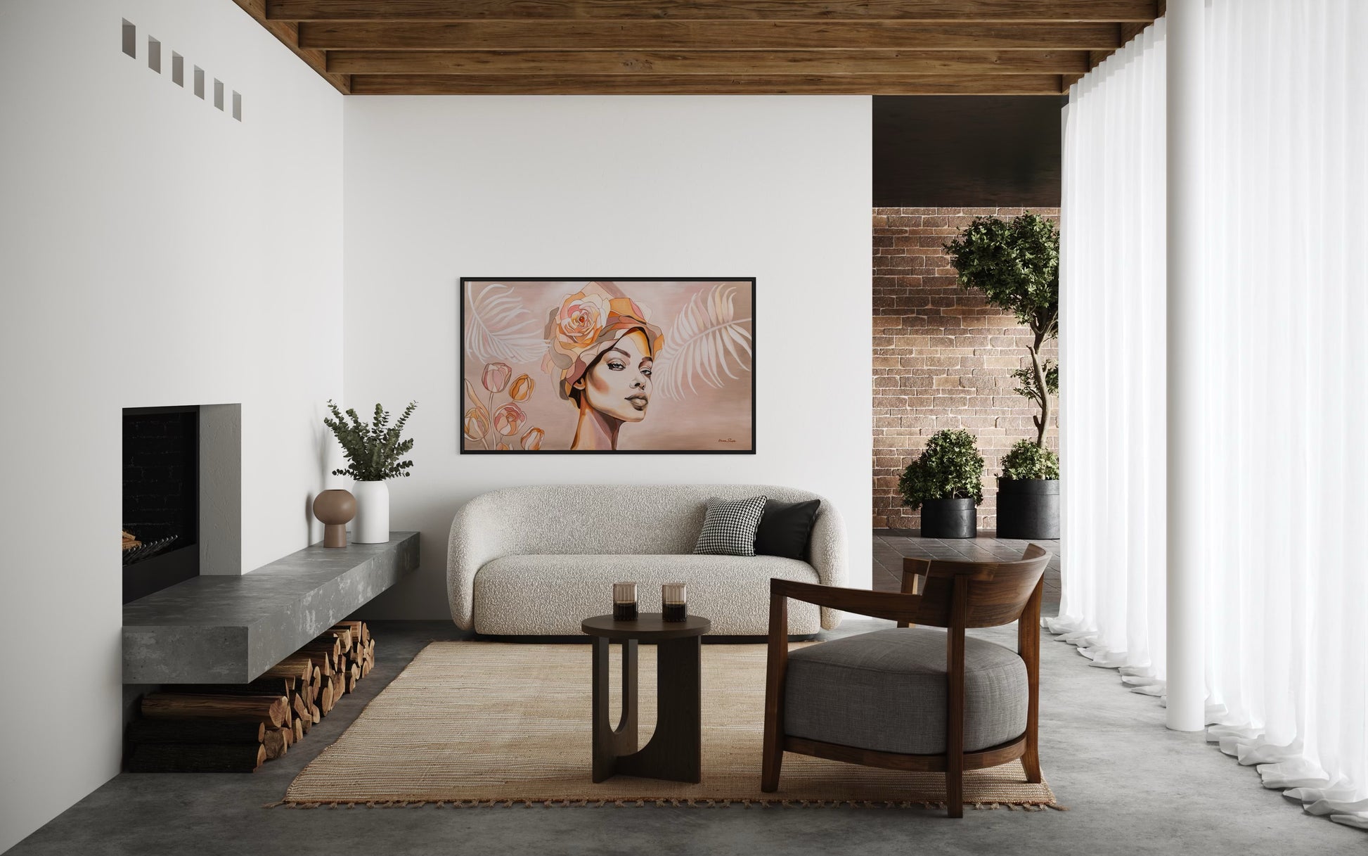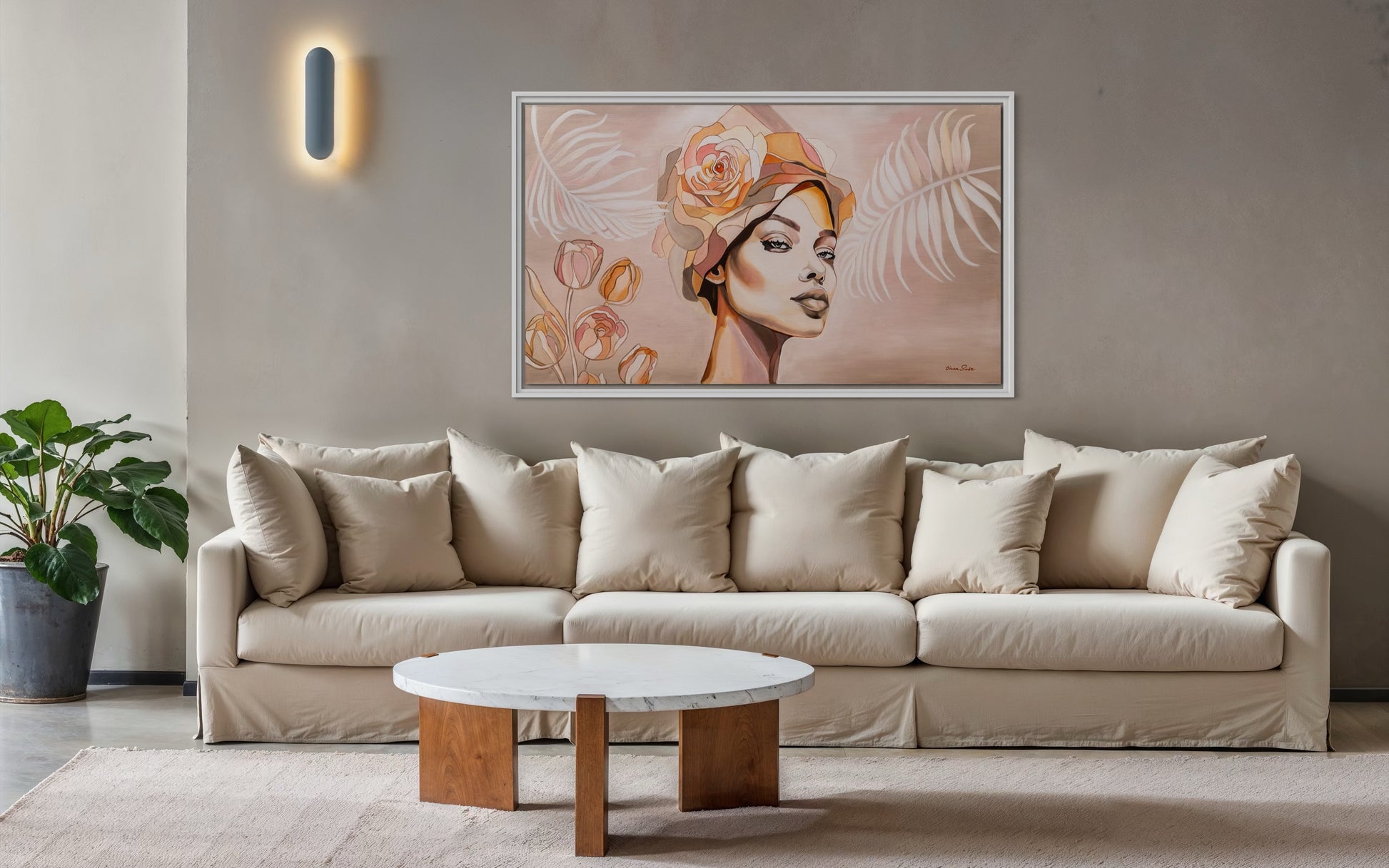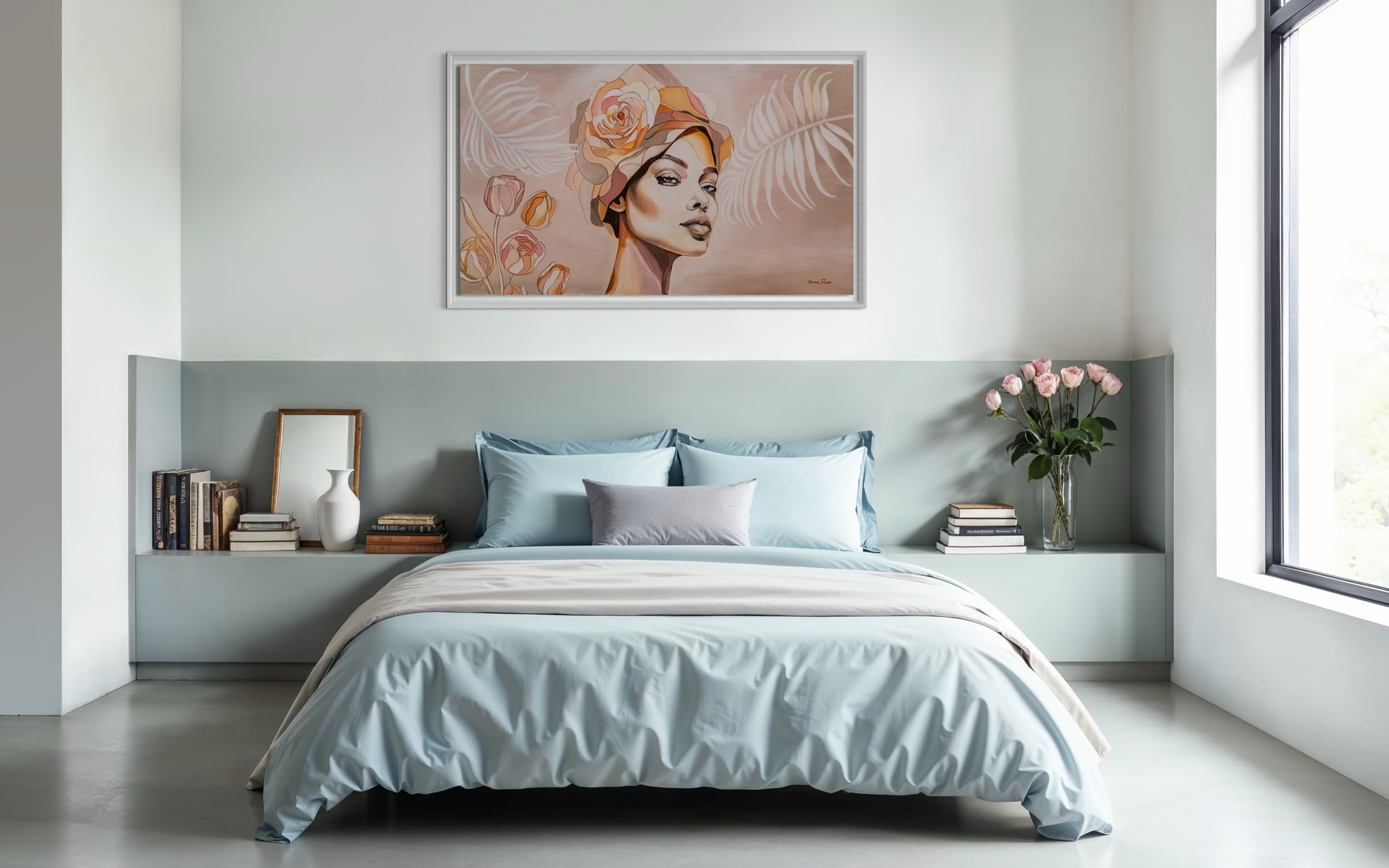 דיוקן של אישה צעירה, עונדת כיסוי ראש רך ואדמתי מעוטר בפרח ורוד. מבטה מעורר תחושה של שלווה ואלגנטיות. מוקפת באלמנטים פרחוניים מופשטים ועלי דקל לבנים עדינים, הקומפוזיציה משלבת נשיות ורוגע עם פלטת צבעים פסטלית חמה.