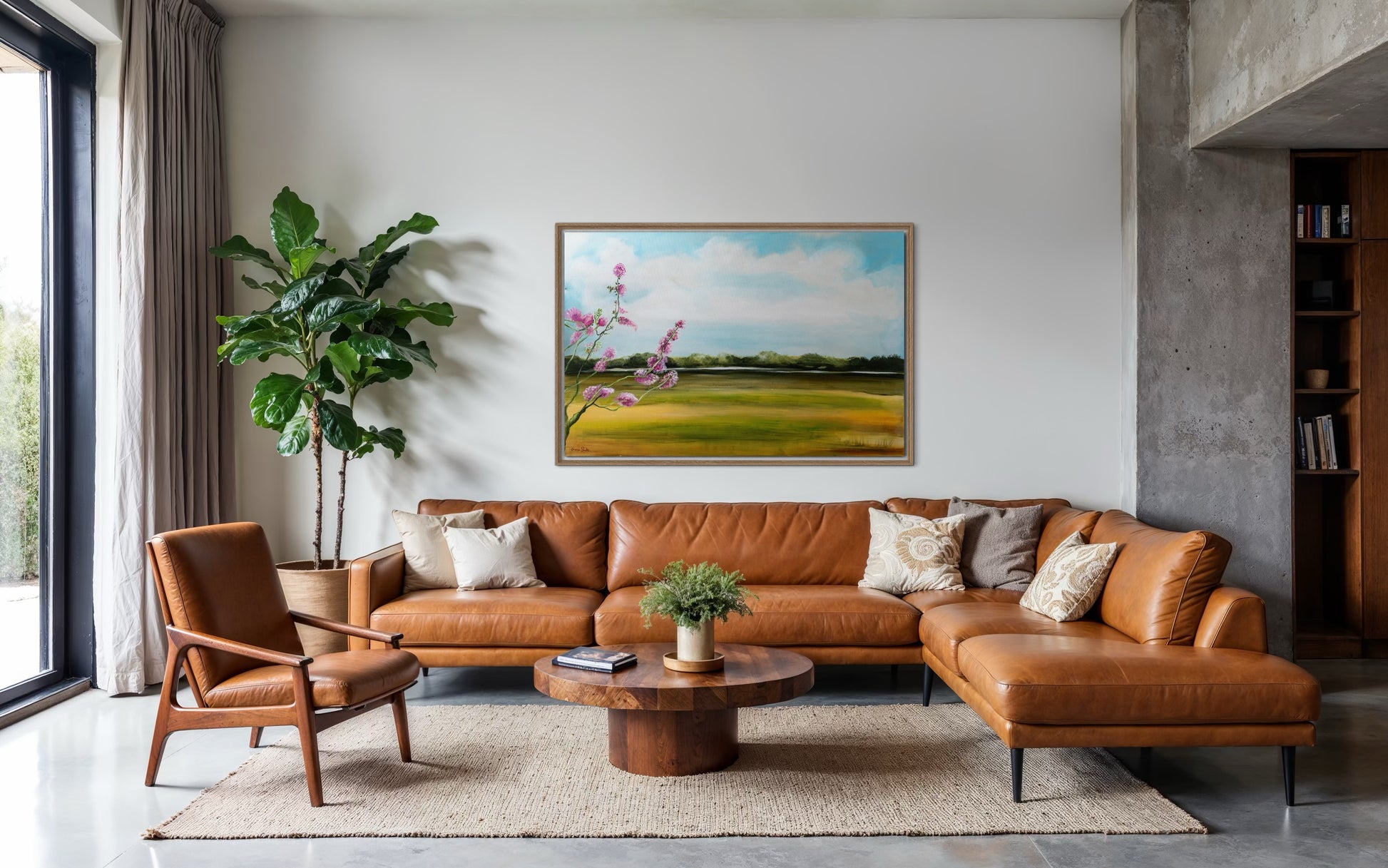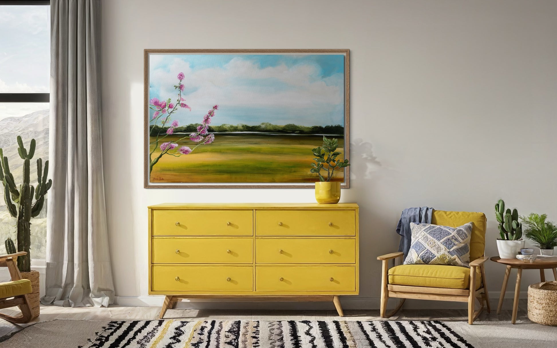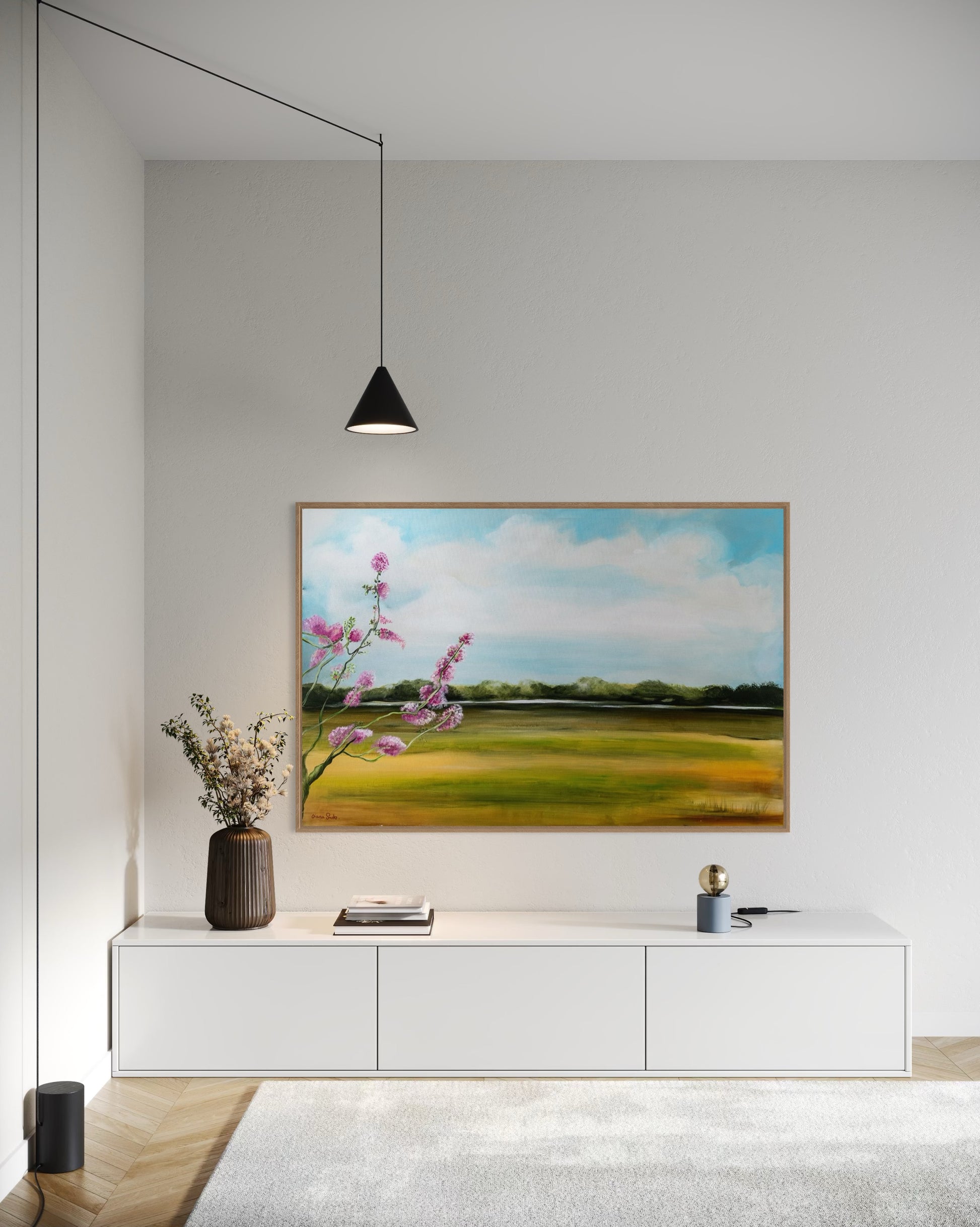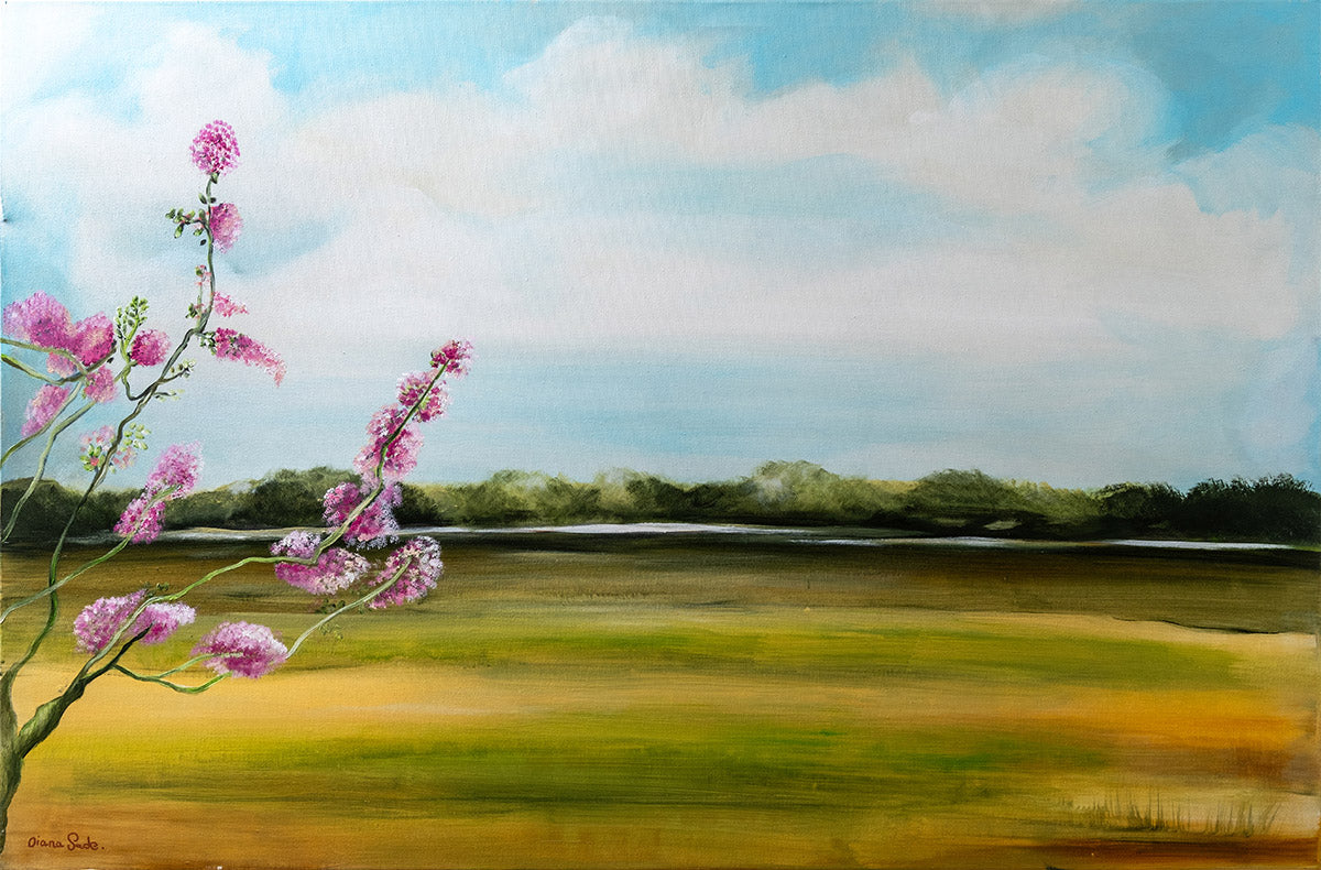 נוף שליו משתרע על פני הבד, עם שדות ירוקים וזהובים המובילים אל קו יער מרוחק. בחזית, פרחים ורודים בהירים משתרעים מהצד, ומביאים נגיעה שמחה של אנרגיית אביב תחת שמיים כחולים ושלווים.
