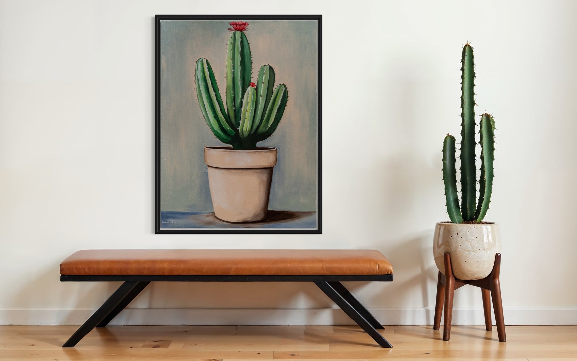 קקטוס ירוק ניצב בגאווה בעציץ חרס בצבע בז', ופרח ורוד עדין פורח מראשו. הרקע רך ומינימליסטי, מושך את תשומת הלב לצורה הנועזת ולאלגנטיות הטבעית של הצמח. הציור מקרין רוגע וחוסן, המסמל שקט כוח והישרדות.