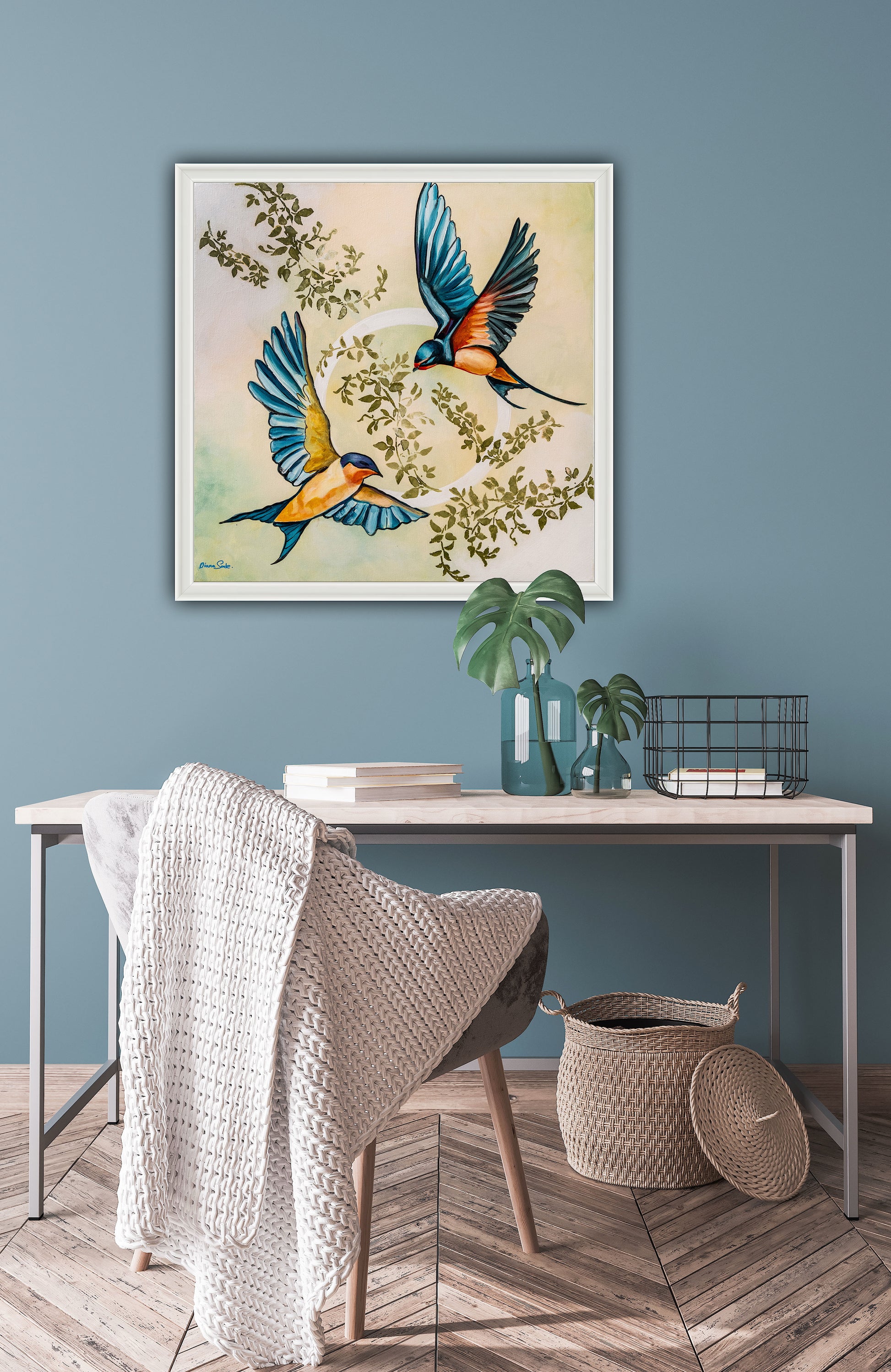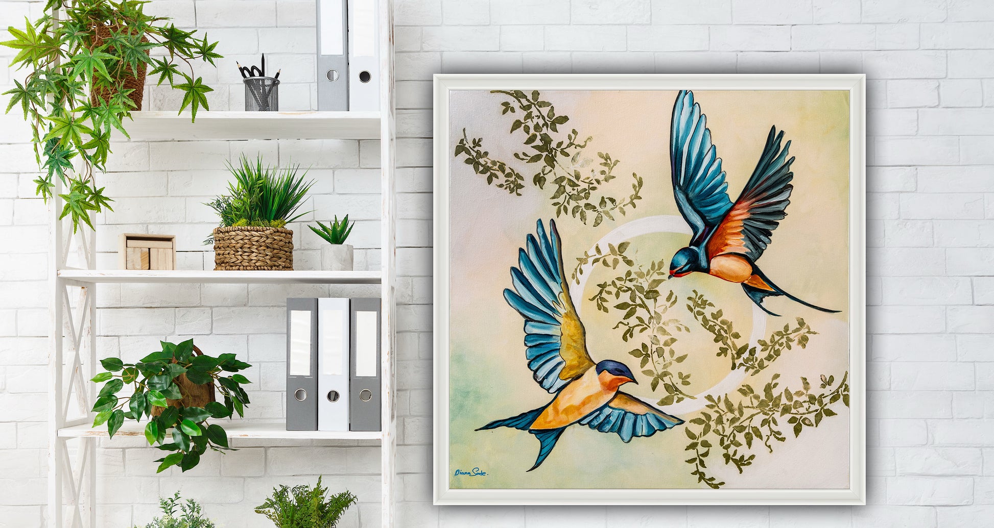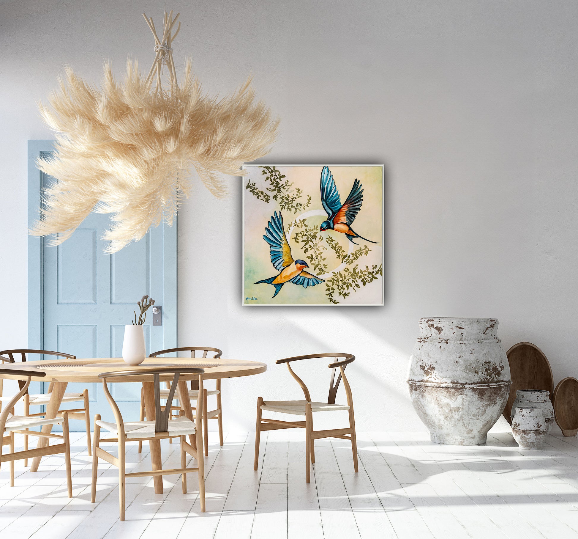 שתי ציפורים צבעוניות, צבועות במשיכות דינמיות של כחול וכתום, רוקדות באוויר על רקע שמיים פסטליים רכים. עלים ירוקים מעטרים את מעוף החיזור שלהן, לוכדים רגע של סימטריה מושלמת, חופש וחיבור עם הטבע. חגיגה של תנועה ושלווה.