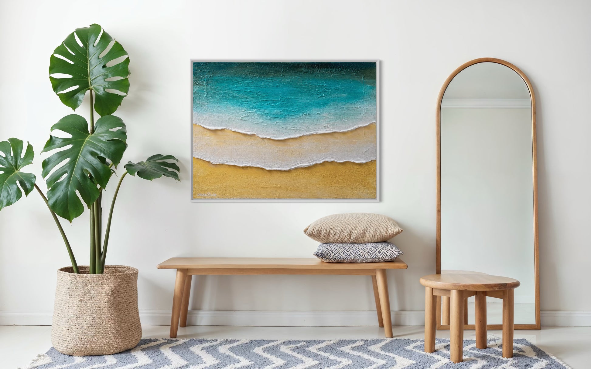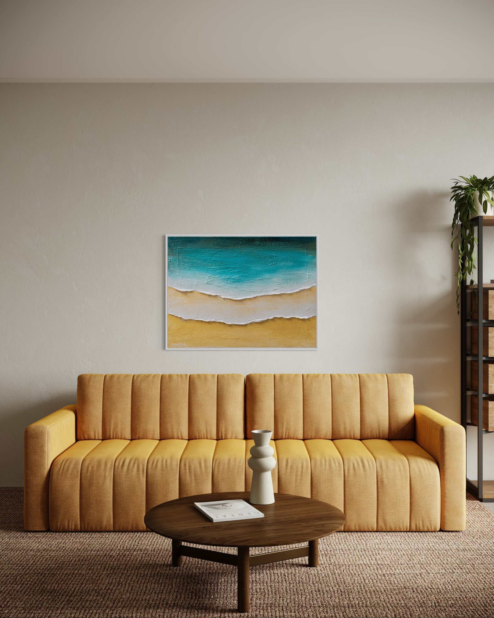 נוף ימי עם משיכות מכחול רב-שכבתיות המעניקות תחושה של תנועה ועומק, ציור המעורר תחושת שלווה, מתאים לכל חלל.