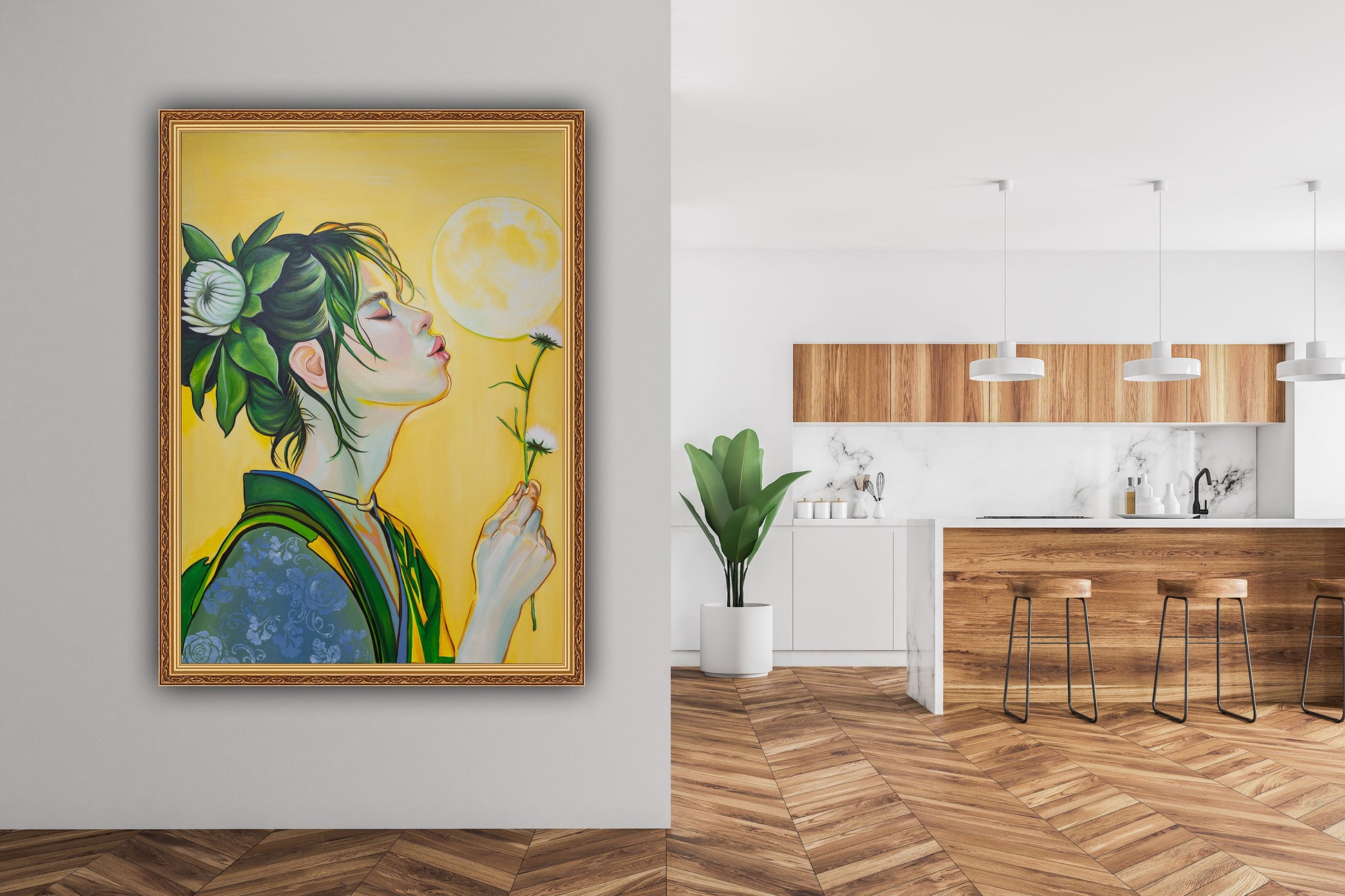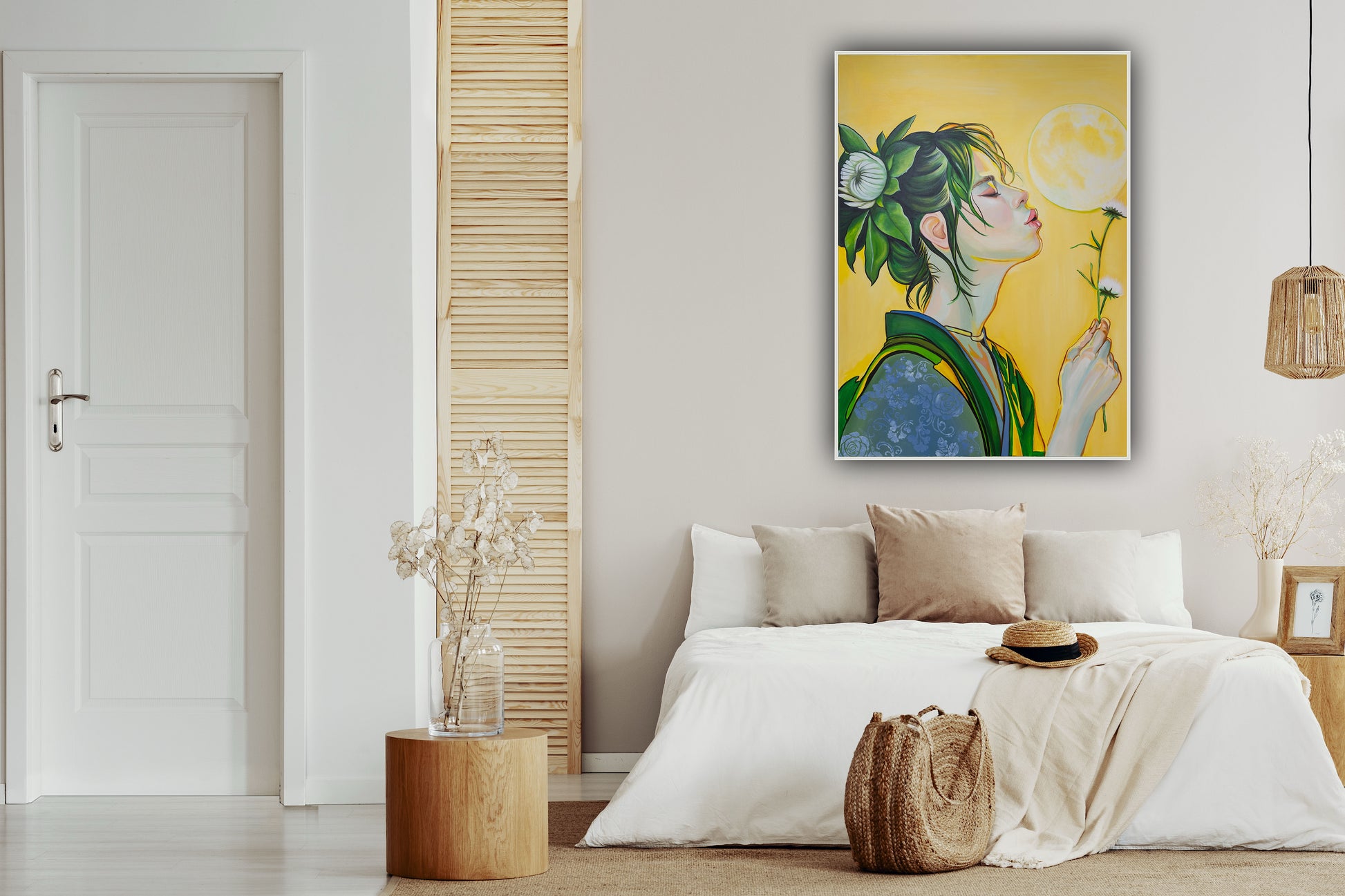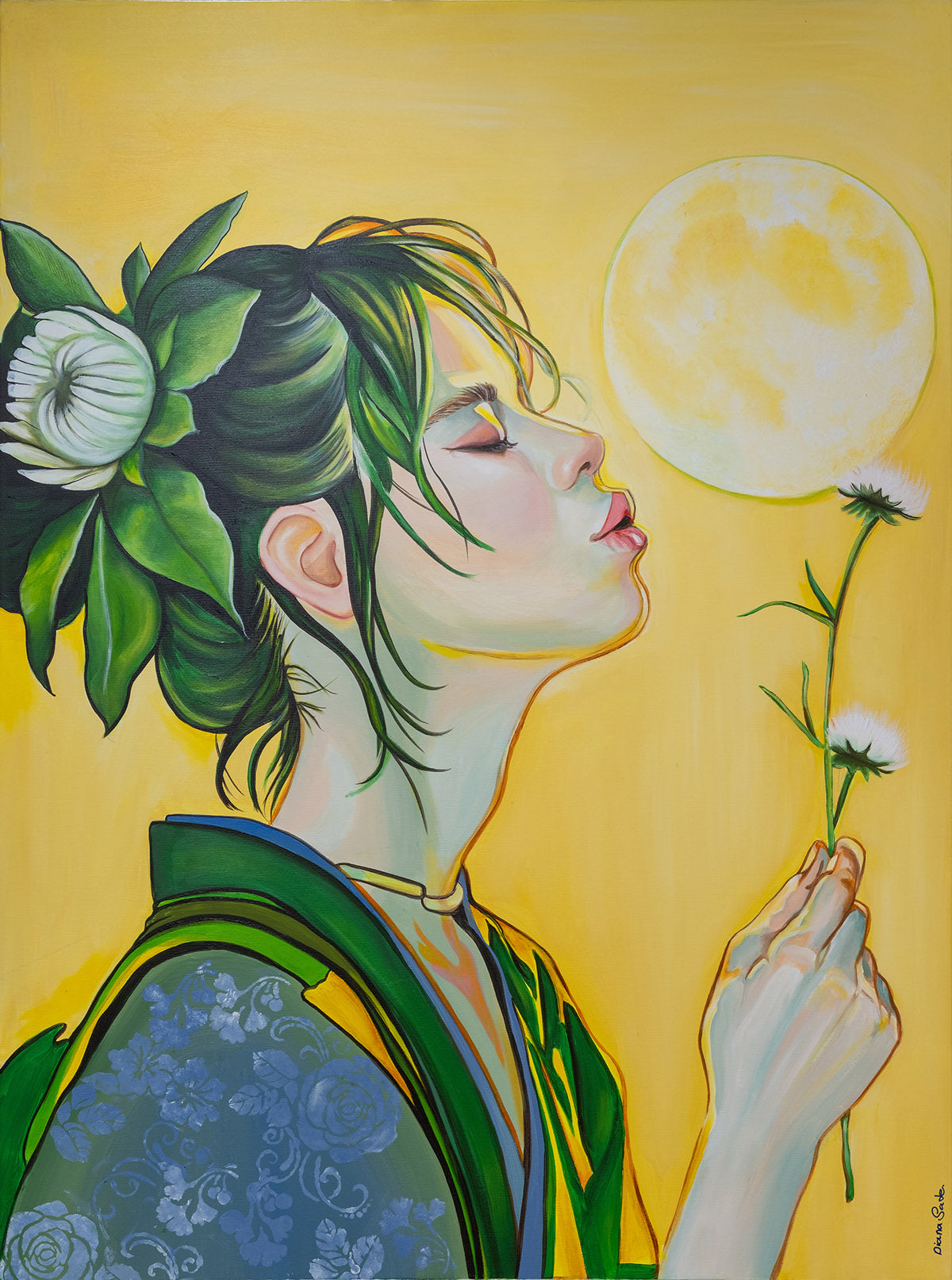 הדמות בציור משדרת רוגע, מיקוד פנימי ורוחניות - כאילו היא משחררת משאלה אל היקום, או מתחברת לטבעה הפנימי.