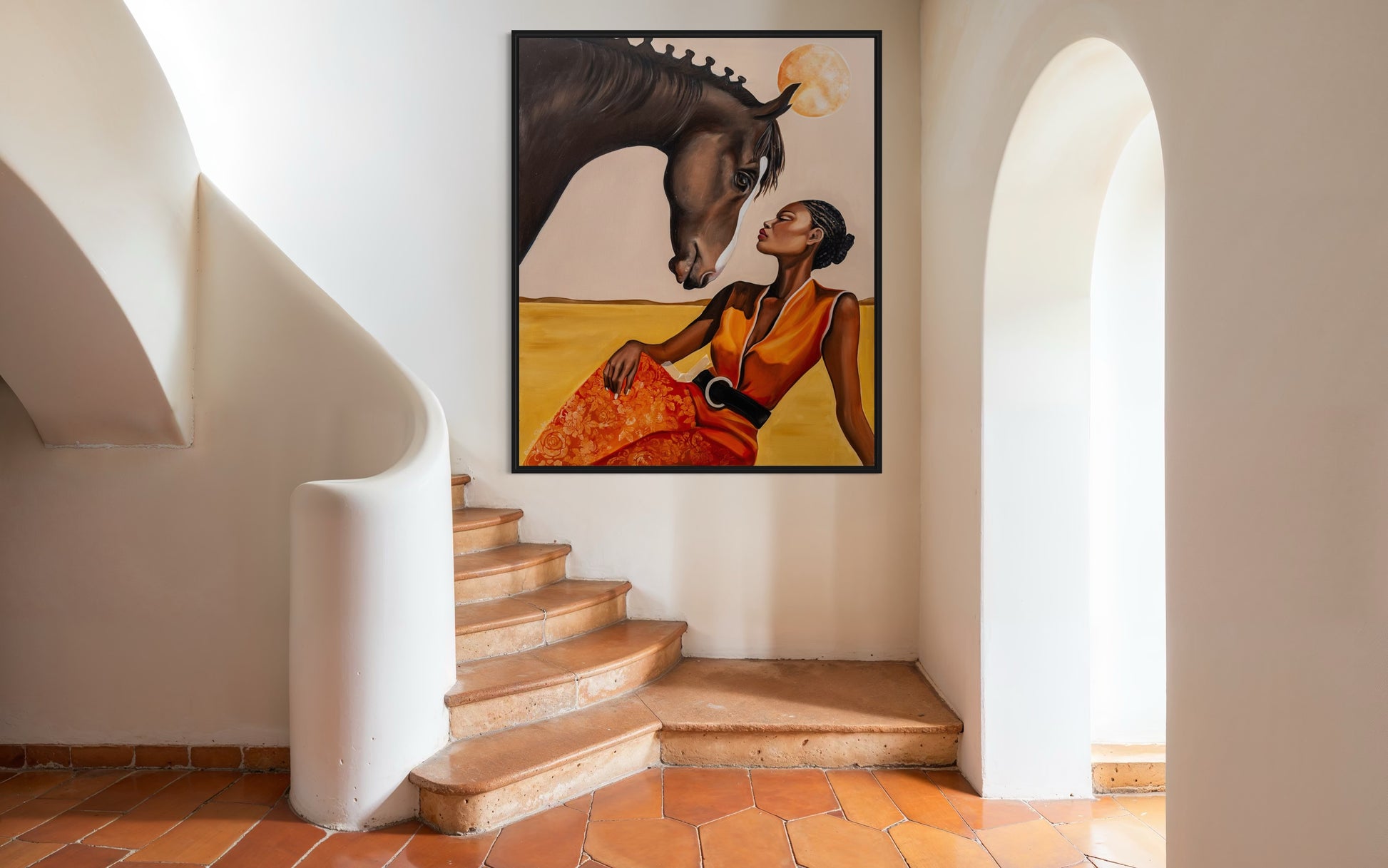 סצנה מלאת נשמה הלוכדת קשר שלו בין אישה לסוס תחת זוהר חם של שמש זהובה. האישה, לבושה בבגד כתום ואדום זורם עם פרטים פרחוניים, מביטה בשלווה בחיה המלכותית. הציור, על רקע נוף עצום ושמשי, מקרין הרמוניה, כבוד הדדי ואת הקשר הטבעי בין אדם לחיה.