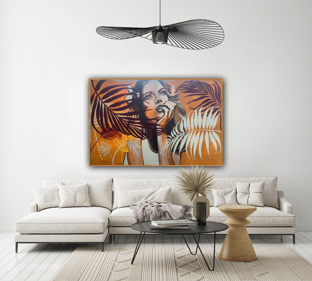 במרכז הציור אישה יפה, ספק חולמת בהקיץ, ספק מערערת על דבר מה שמעסיק אותה