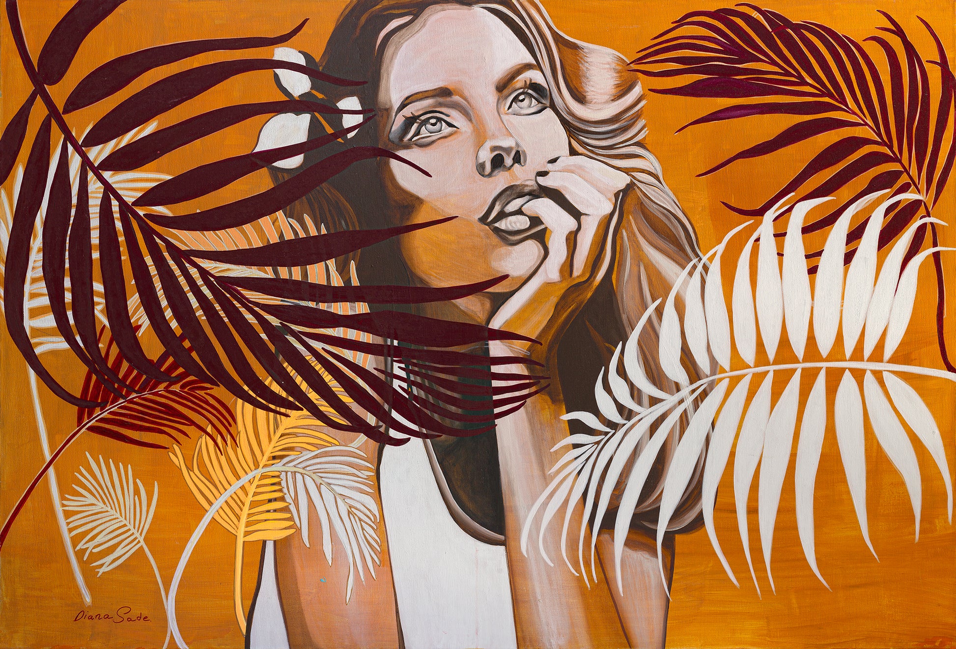 הציור משלב רקע בגוון כתום עם עלים בצבע בורדו ולבן. מה שמעניק לו אווירה עדינה וסמלית