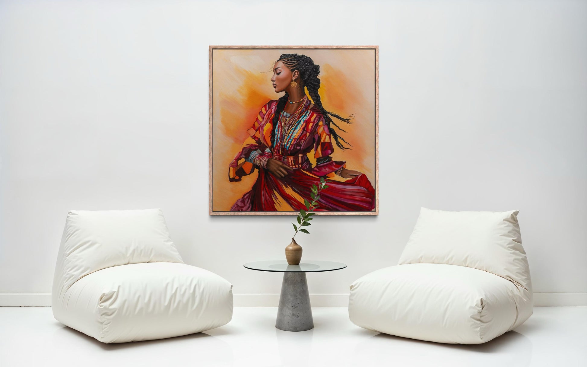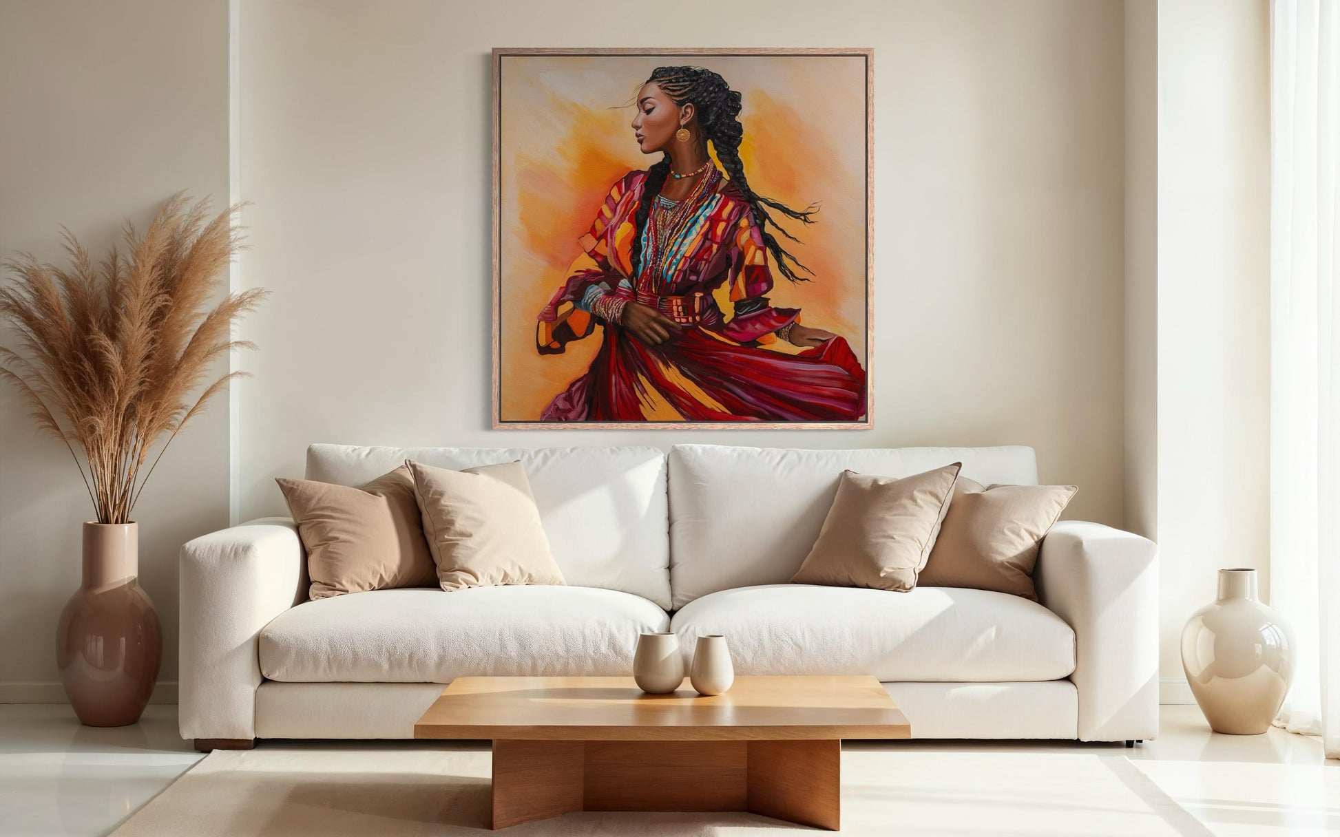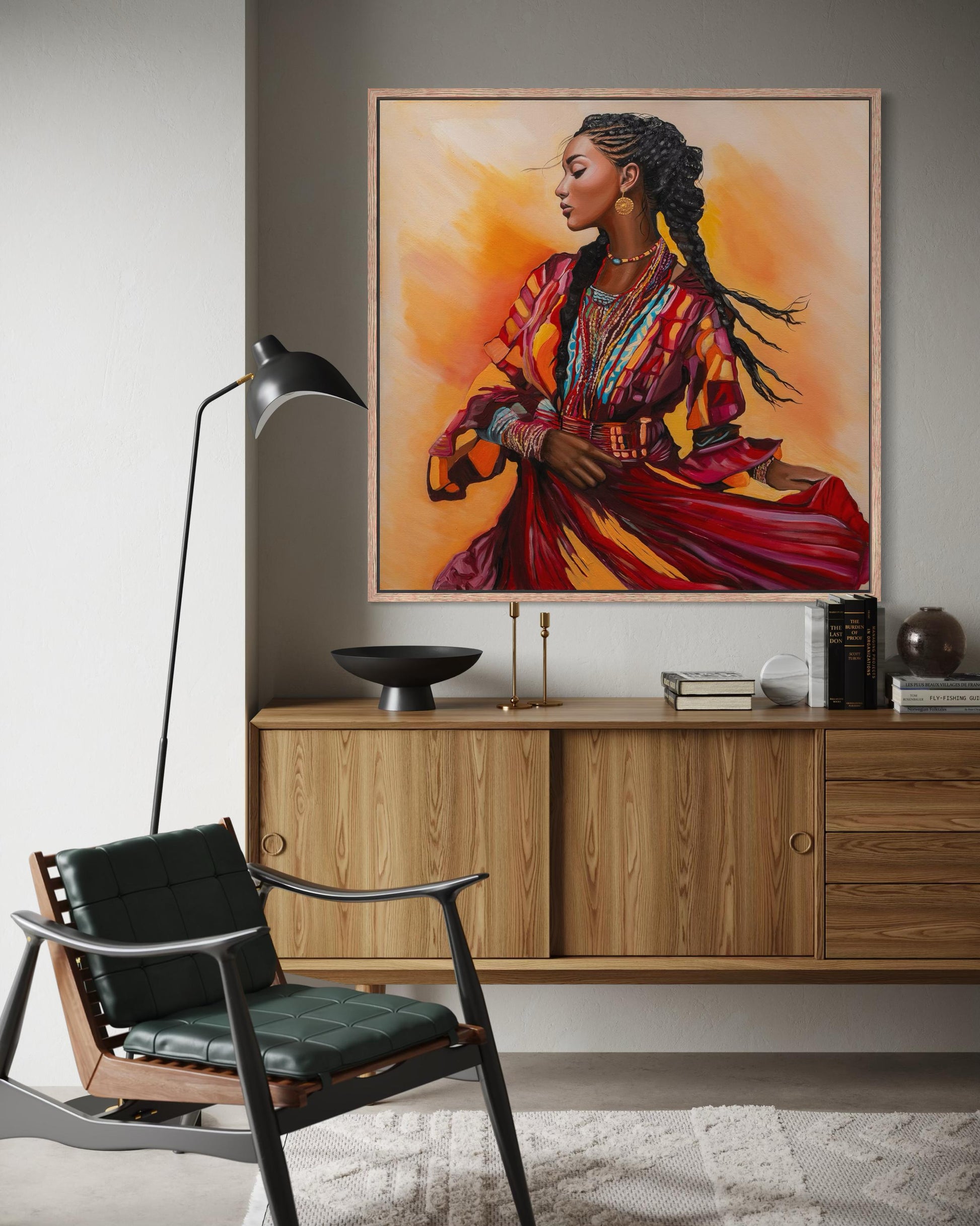ציור מתוך סדרת 'מחול החיים'. יצירה החוגגת נשיות, תנועה ועוצמה תרבותית. צבעים חמים ועשירים מדגישים רגע של זרימה פנימית וגאווה שורשית, ומכניסים לחלל אנרגיה וחיים