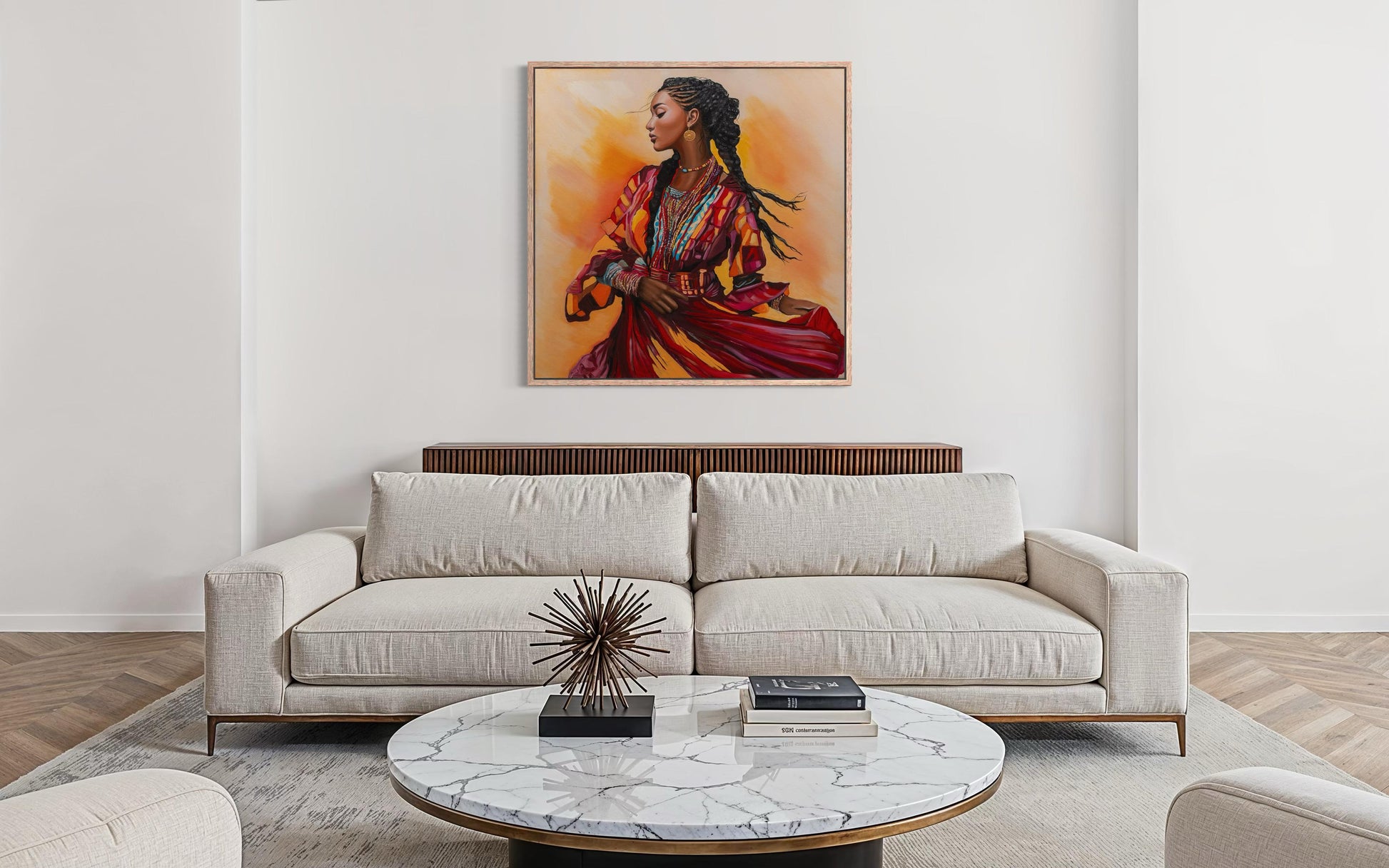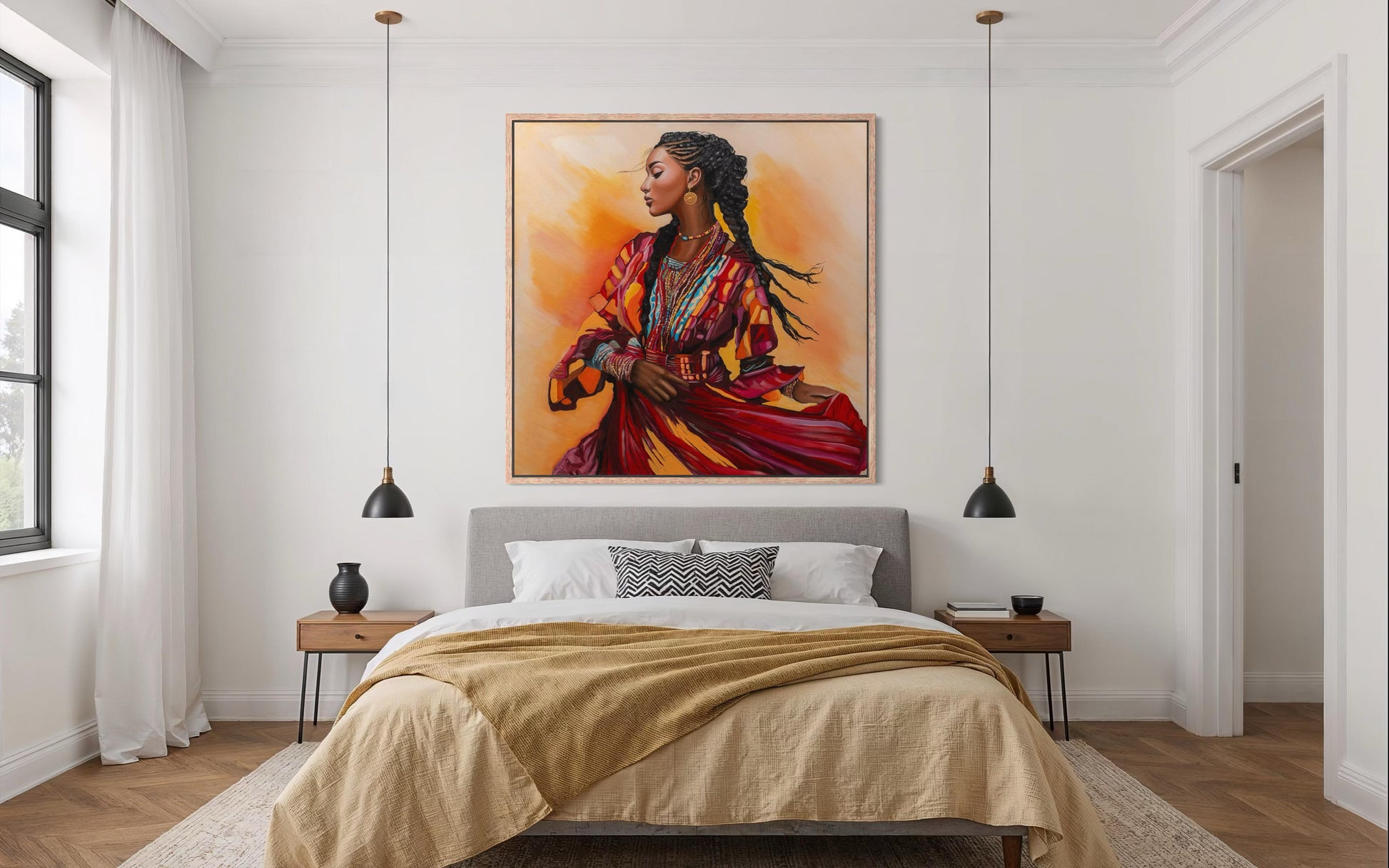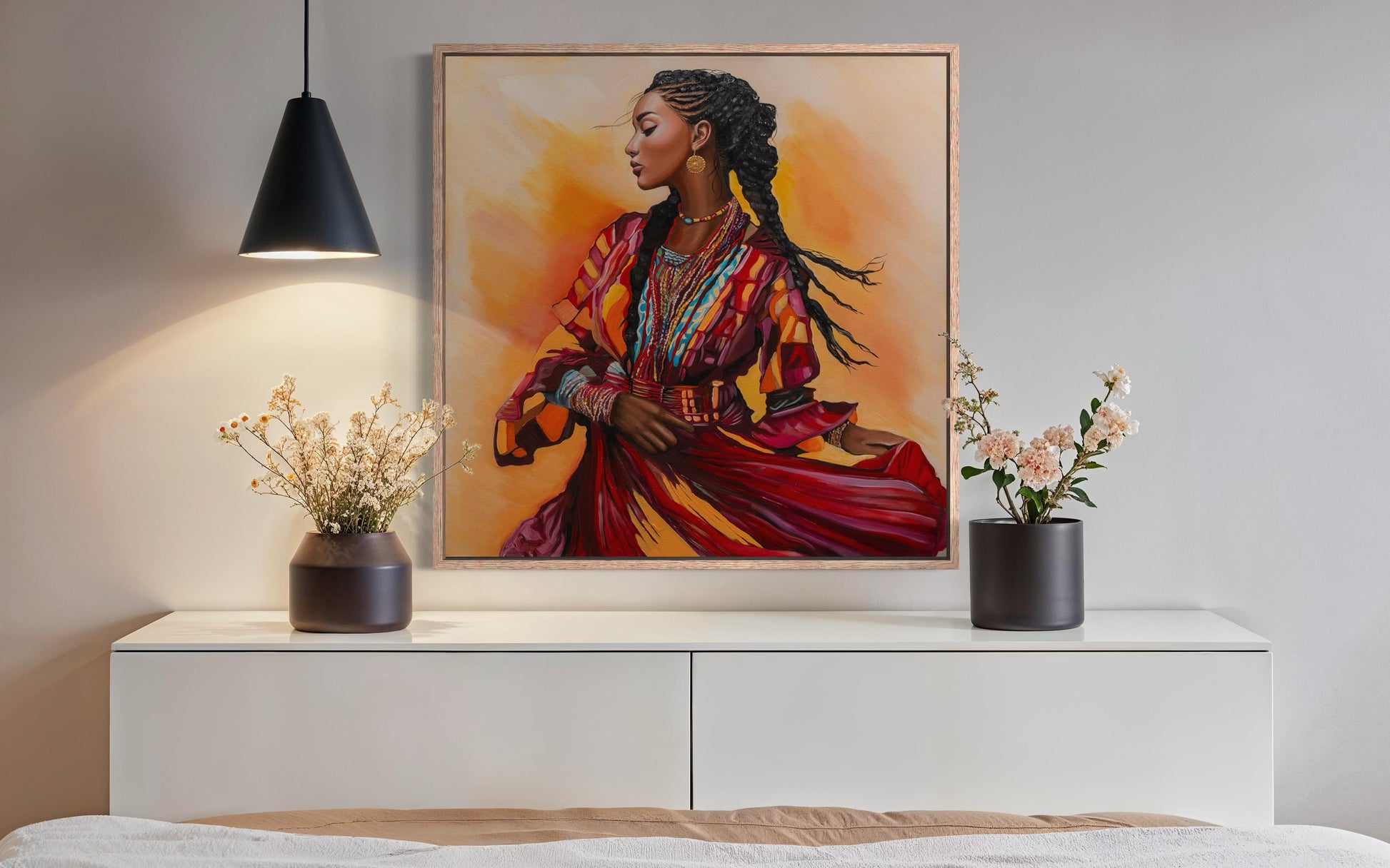ציור מתוך סדרת 'מחול החיים'. יצירה החוגגת נשיות, תנועה ועוצמה תרבותית. צבעים חמים ועשירים מדגישים רגע של זרימה פנימית וגאווה שורשית, ומכניסים לחלל אנרגיה וחיים