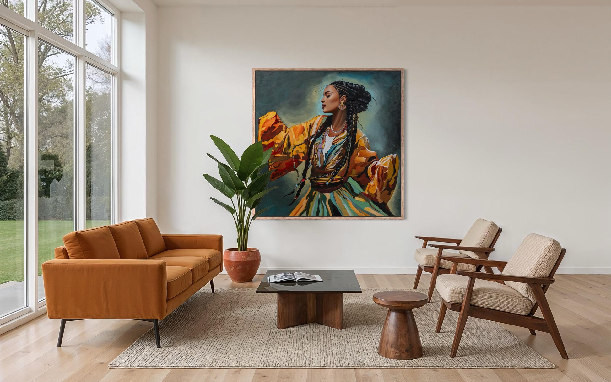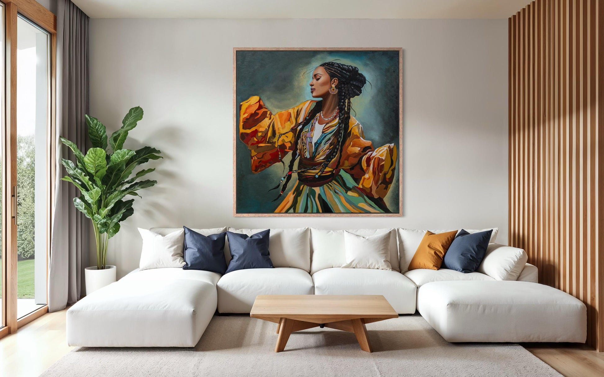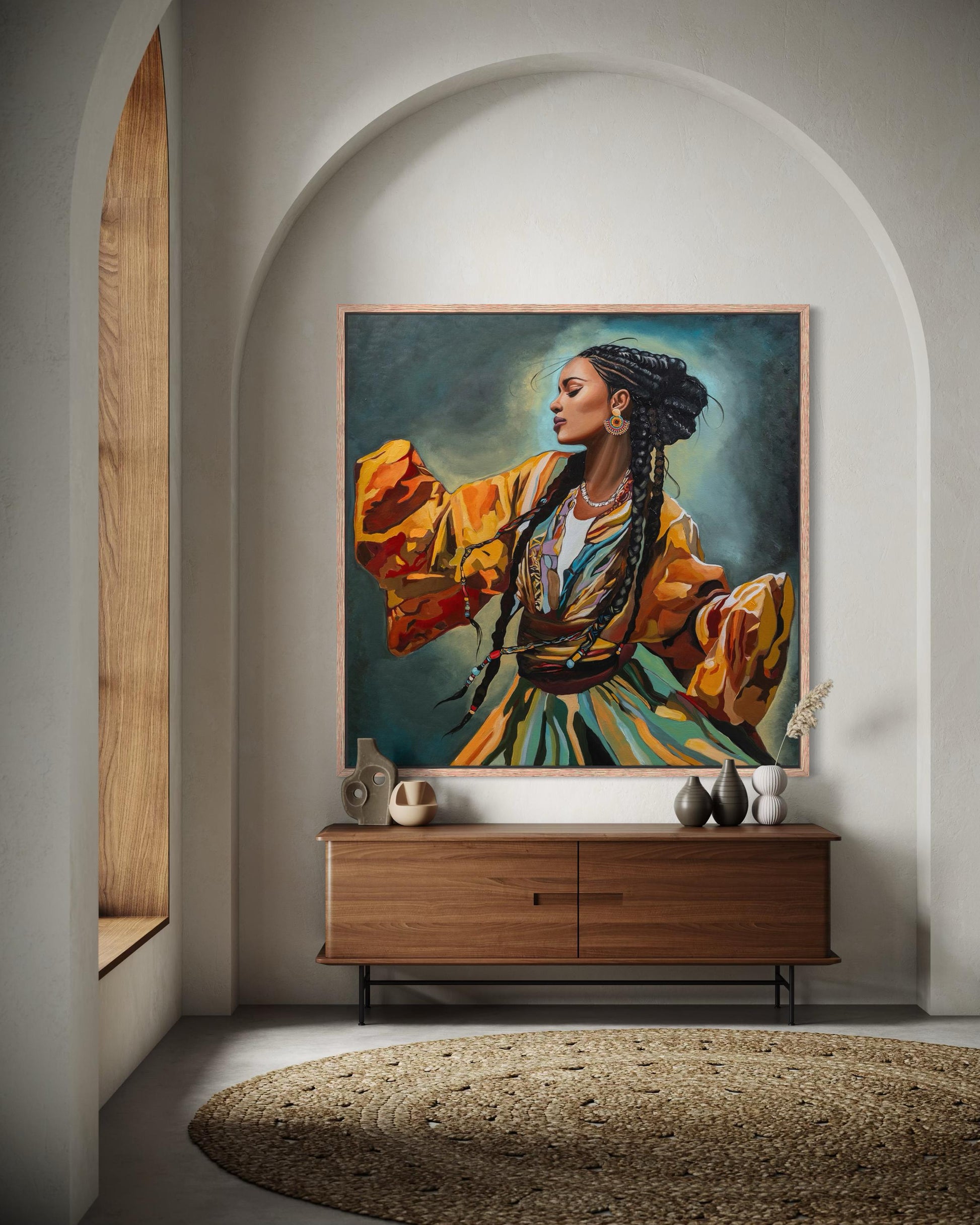 ציור מתוך סדרת 'מחול החיים'. יצירה החוגגת נשיות, תנועה ועוצמה תרבותית. צבעים חמים ועשירים מדגישים רגע של זרימה פנימית וגאווה שורשית, ומכניסים לחלל אנרגיה וחיים