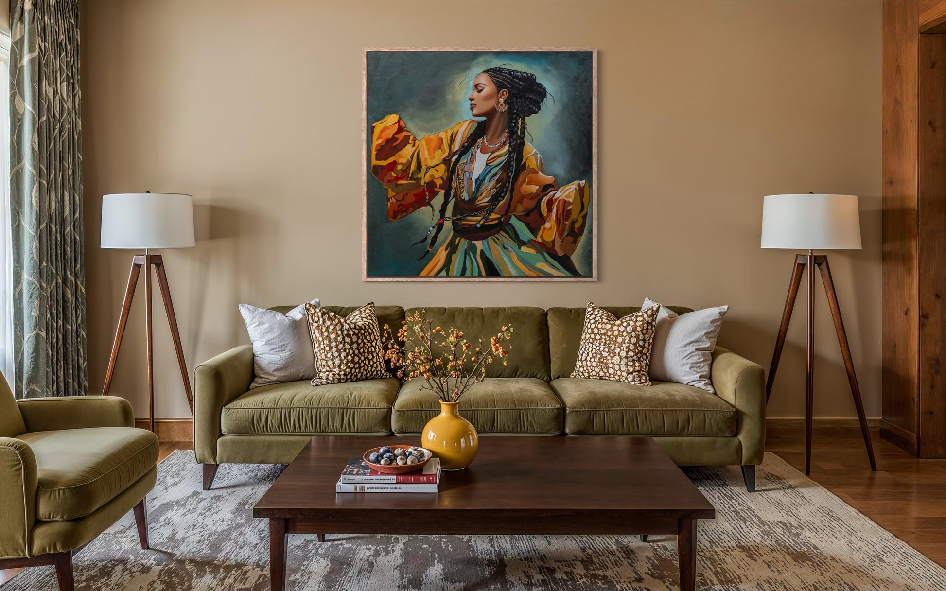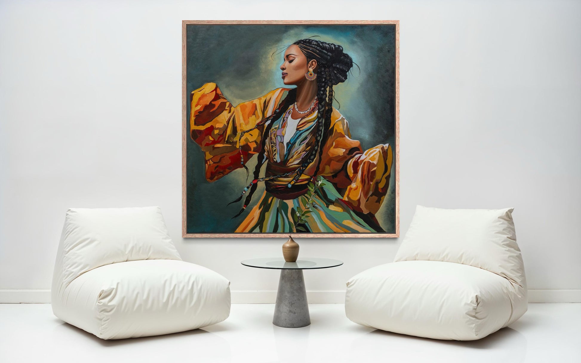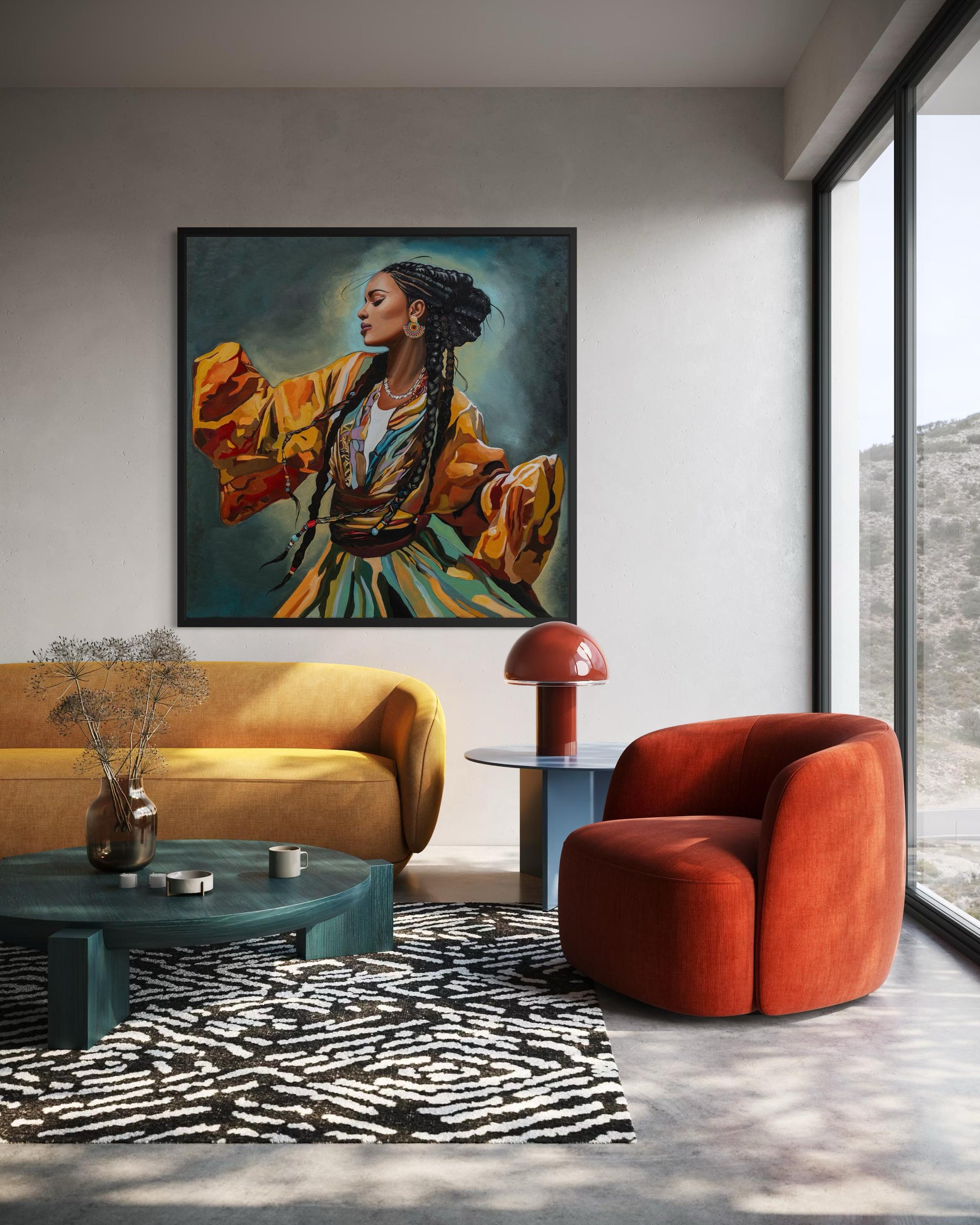 ציור מתוך סדרת 'מחול החיים'. יצירה החוגגת נשיות, תנועה ועוצמה תרבותית. צבעים חמים ועשירים מדגישים רגע של זרימה פנימית וגאווה שורשית, ומכניסים לחלל אנרגיה וחיים