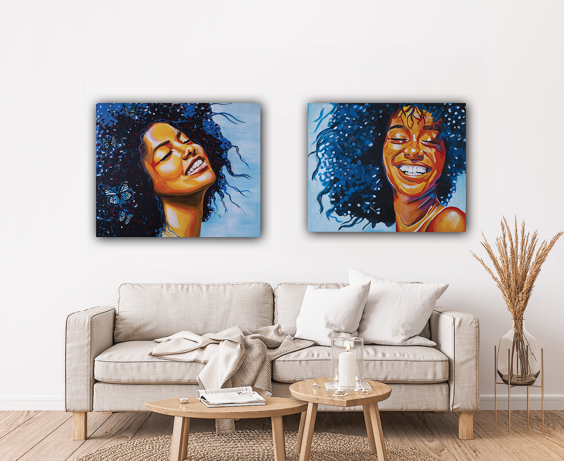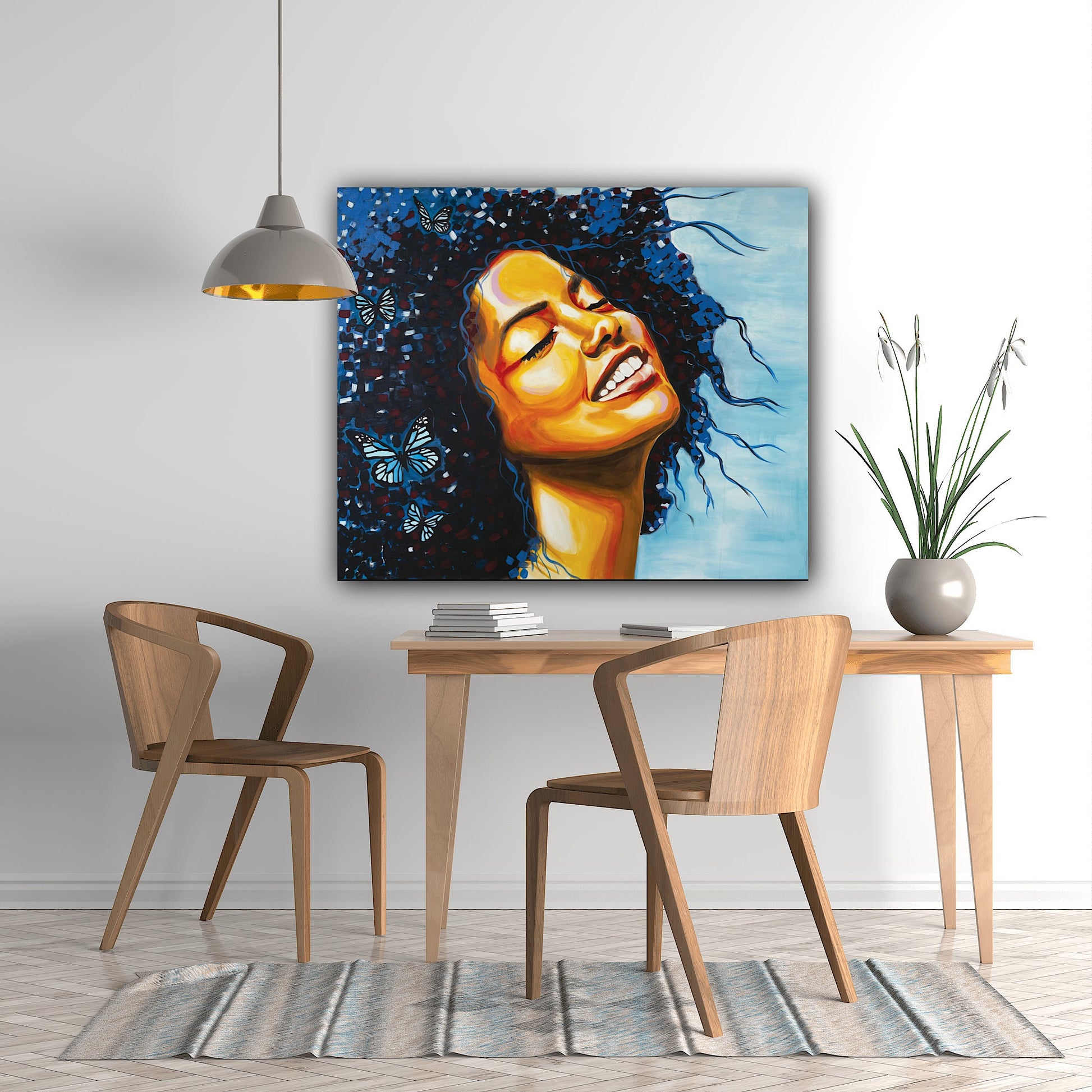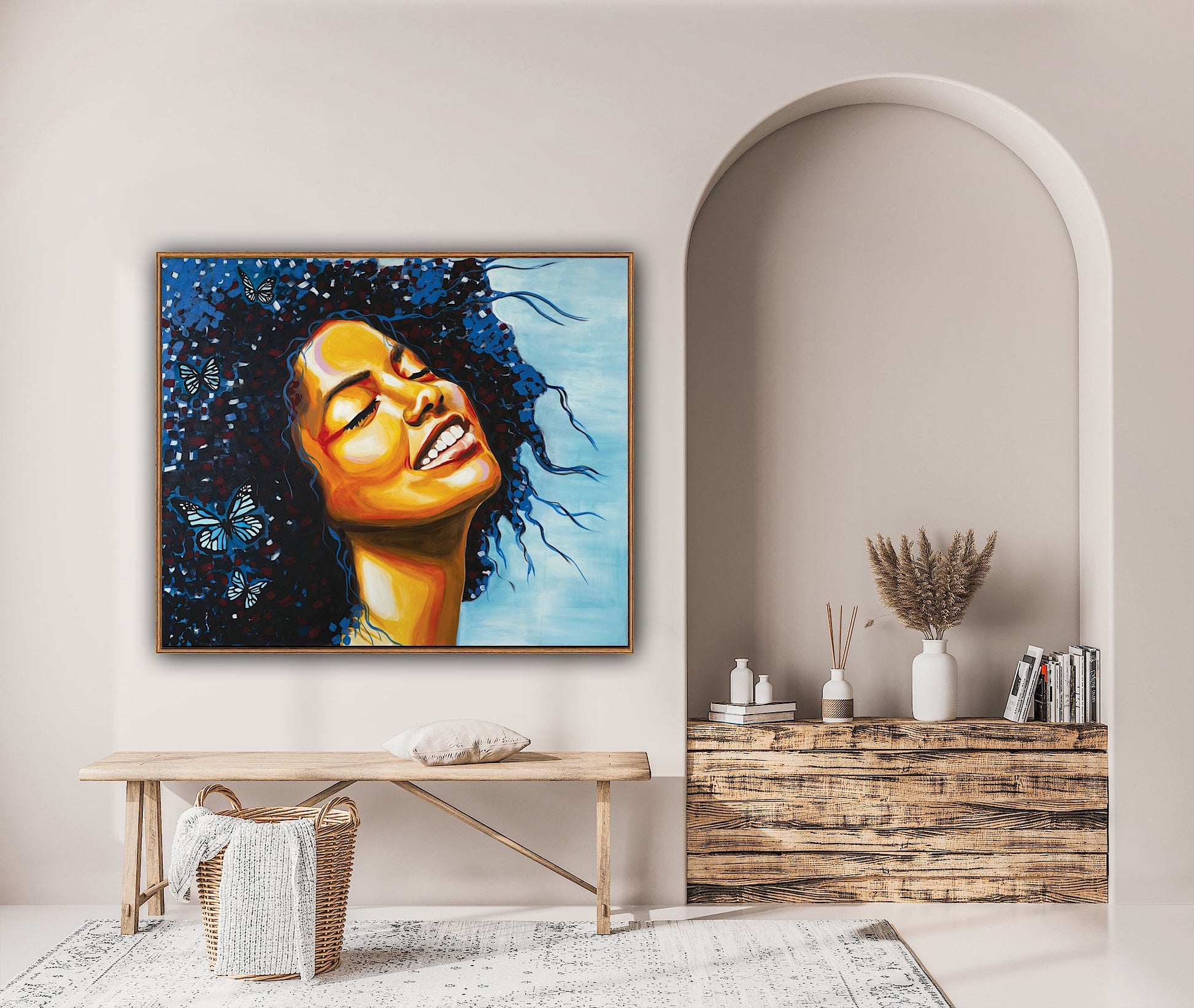 דמות האישה בצבעים חמים על רקע תכלת עם פרפרים בשיערה, ציור מלא שמחה חופש ושחרור