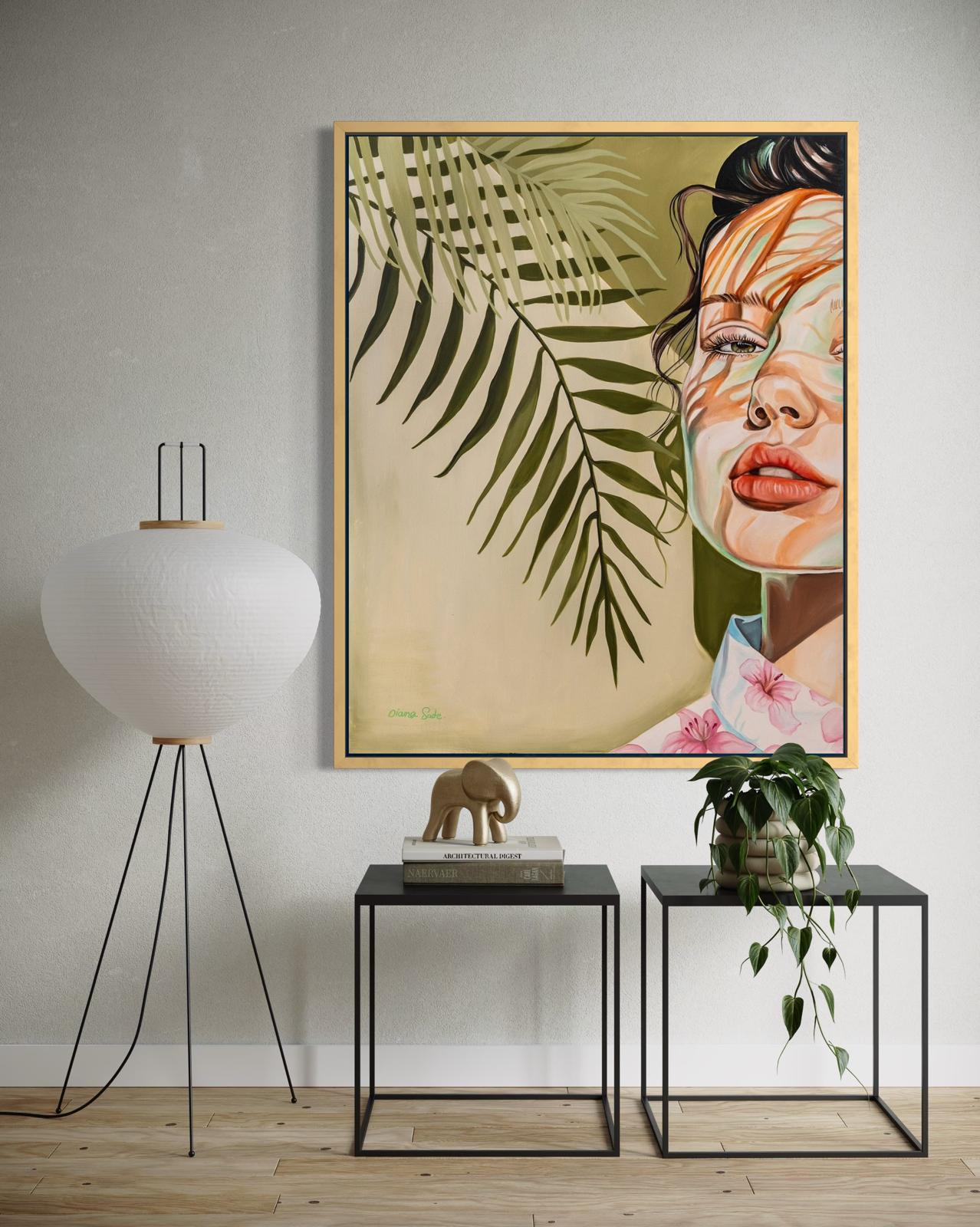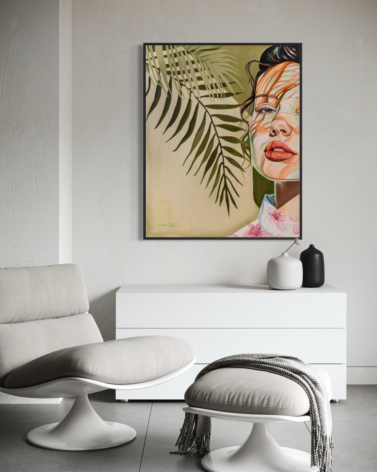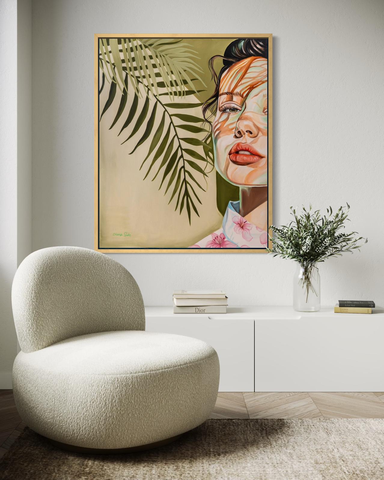 דיוקן מרשים של אישה, משחק האור והצל על פניה יוצר אווירה כמעט חלומית, ומשלב טבע עם הבעה אנושית. מבטה השקט והדוגמה הפרחונית העדינה על חולצתה מוסיפים להרמוניה העדינה של הקומפוזיציה השלווה הזו